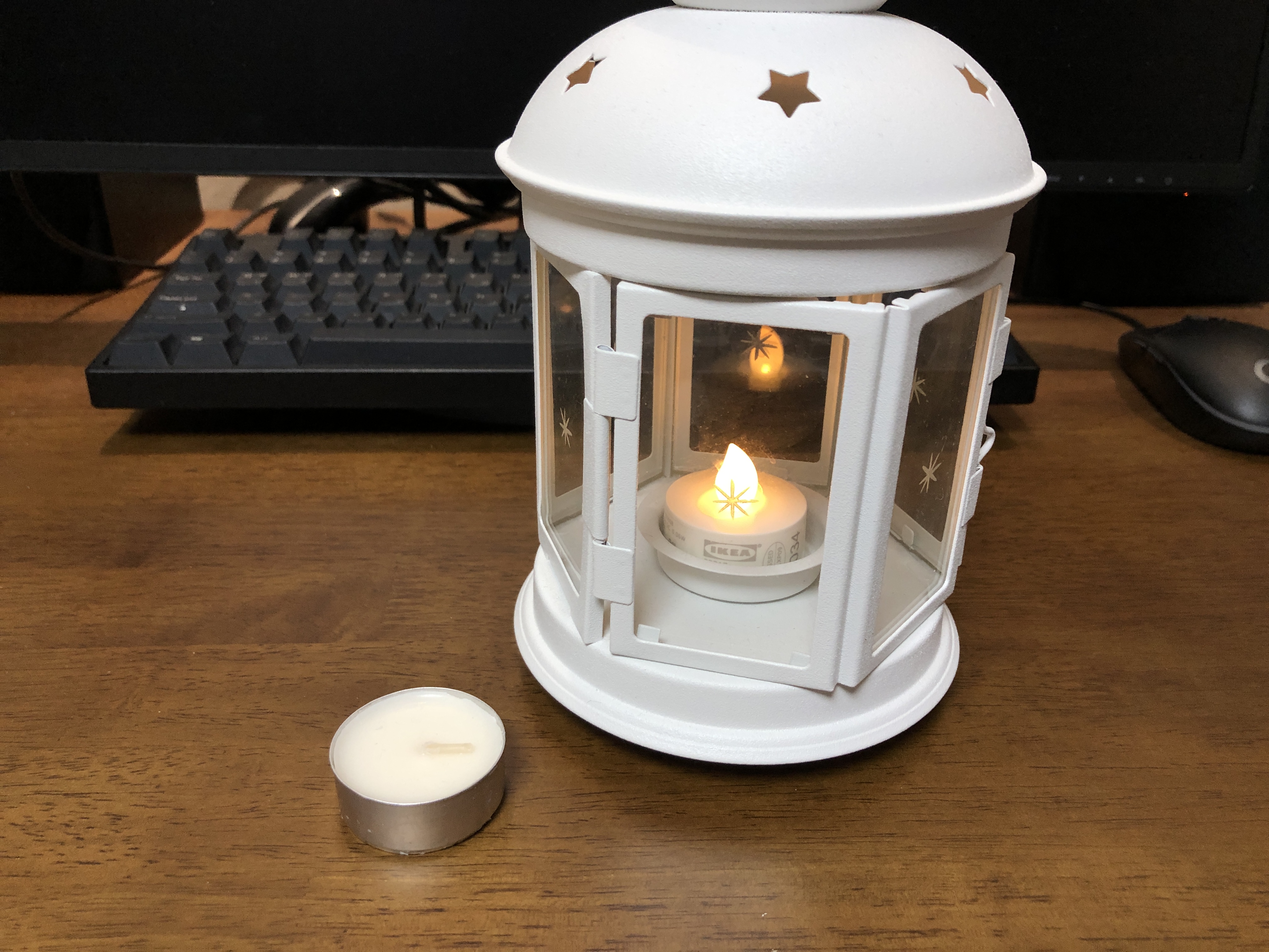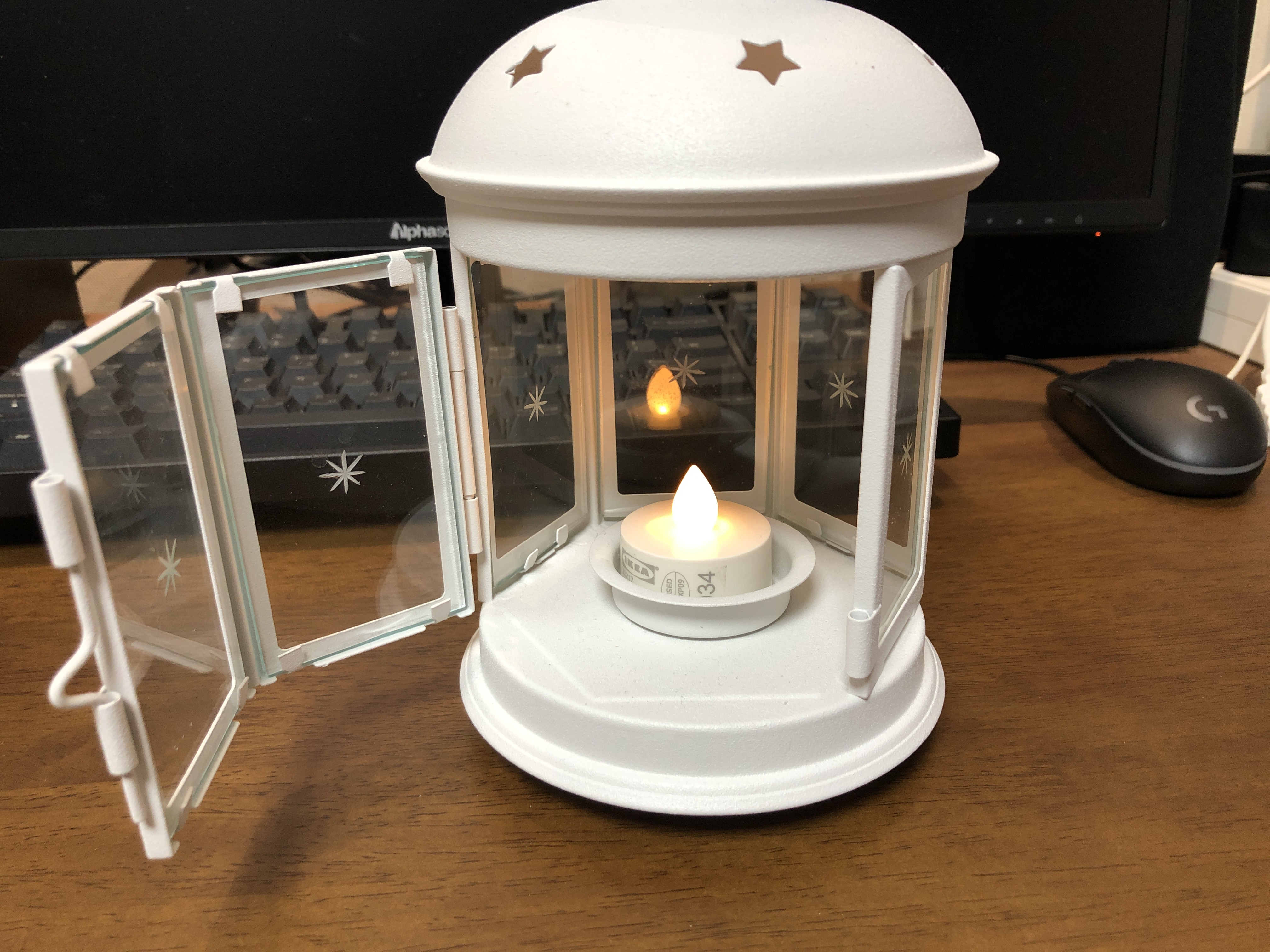 이케아 로테라 랜턴에서 빛나고 있는 LED 미니 양초. 진짜 양초보단 못하지만 나름 느낌 있습니다.