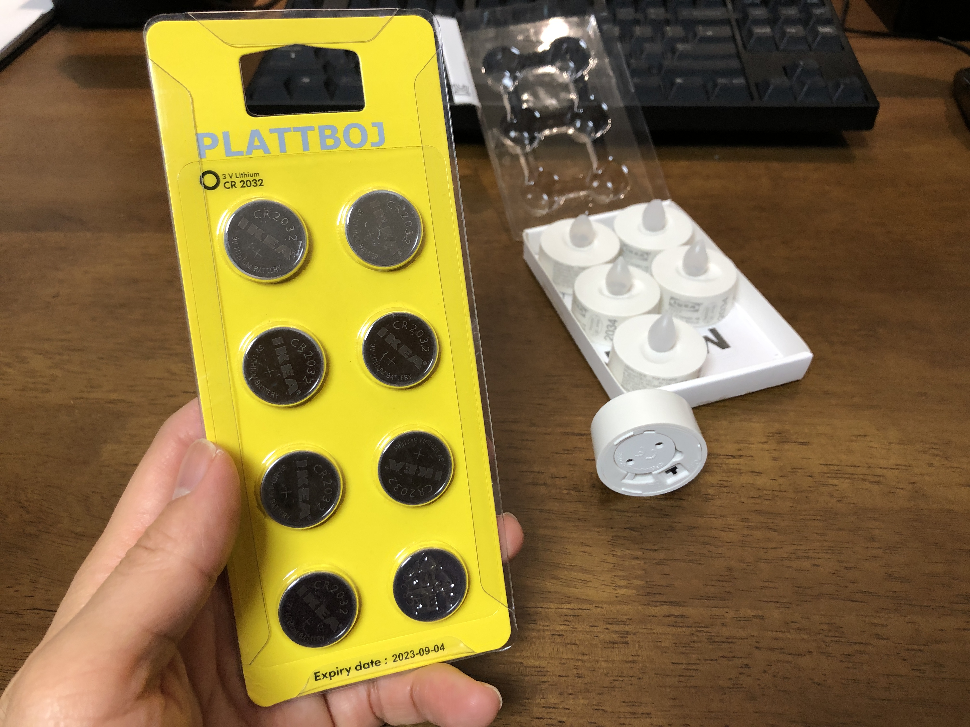 이케아 MOGNAD 몽나드 LED 미니 양초에는 배터리가 포함되어 있지 않기 때문에 따로 구매를 해야 합니다. LED 미니 양초 옆에 PLATTBOJ 플라트보이 건전지가 보이기에 같이 샀습니다. CR2032 규격의 리튬전지 8개에 1900원.
