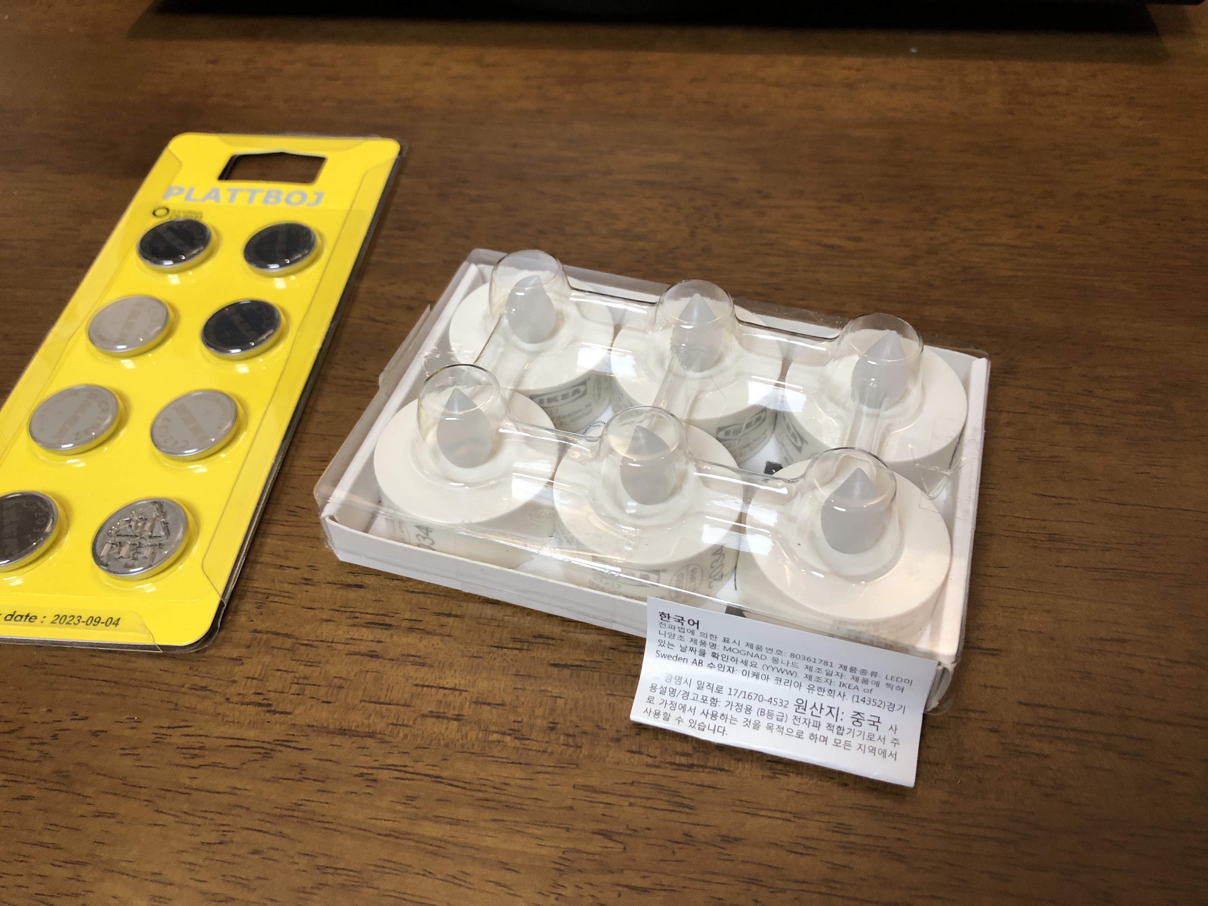 이케아 MOGNAD 몽나드 LED 미니 양초에는 배터리가 포함되어 있지 않기 때문에 따로 구매를 해야 합니다. LED 미니 양초 옆에 PLATTBOJ 플라트보이 건전지가 보이기에 같이 샀습니다. CR2032 규격의 리튬전지 8개에 1900원.