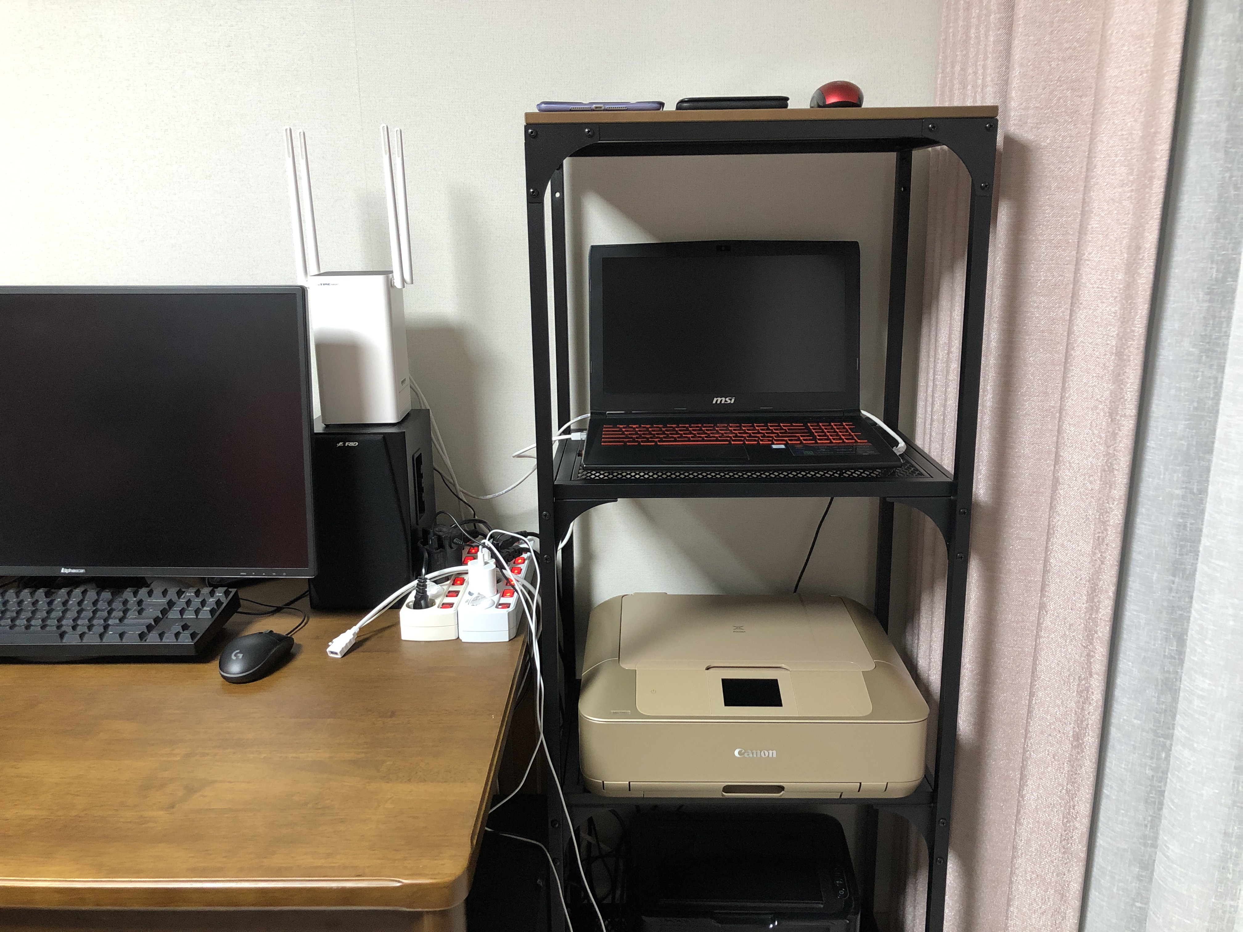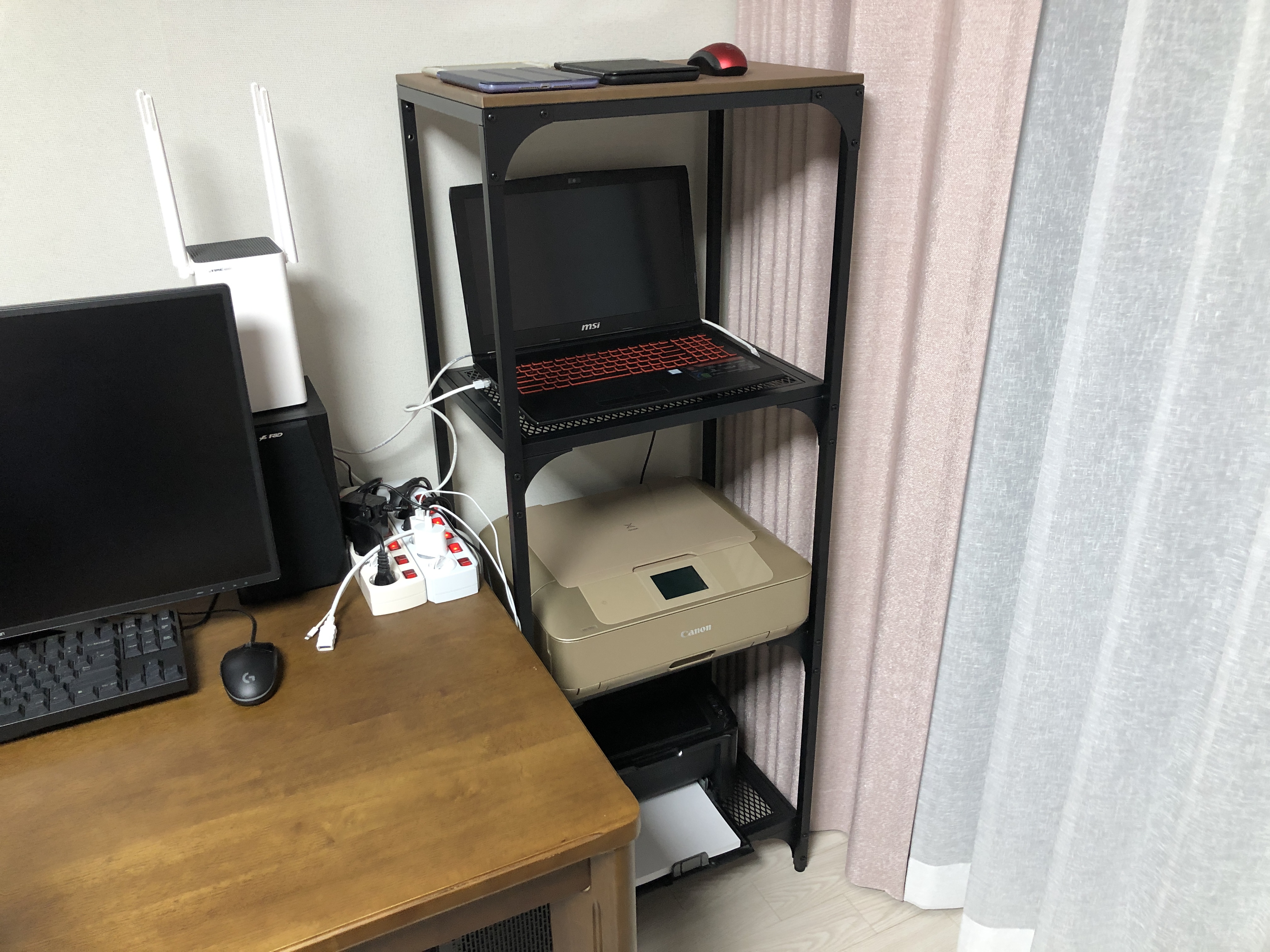 기존에 있던 코스트코 라이프타임 접이식 테이블을 치우고, 이케아 피엘보 선반으로 세팅을 해봤습니다. 프린터 2대, 노트북 등등. 확실히 공간 활용이 잘되네요. 튼튼해서 무거운 물건도 올려둘 수 있고. 잘 산 것 같습니다. 철반 3개에 맨 위가 원목으로 되어 있어서 잘하면 4개의 공간에 수납을 할 수 있는 구조입니다.