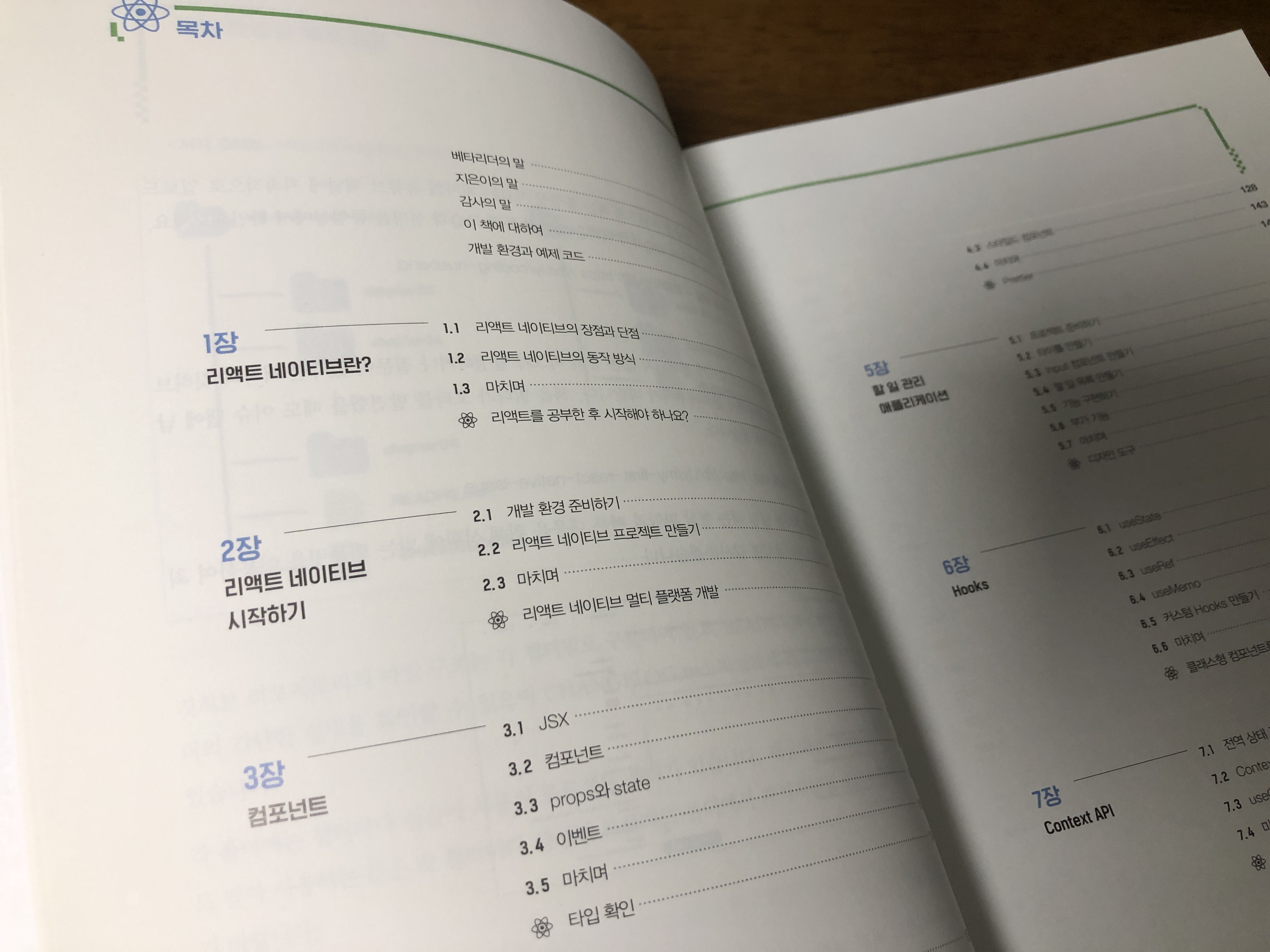 리액트 네이티브 초보를 위한 책이라 개발환경 설정부터 하나하나 차근차근 배울 수 있습니다. 아무리 앱개발 입문책이라고 해도 자바스크립트 정도는 기본으로 알고 있어야 합니다. 1장에서 5장까지는 리액트 네이티브의 기초를 배우는데 컴포넌트, 상태, 속성, 이벤트, 스타일 등을 배우고 할 일 관리 애플리케이션을 만들어 봅니다. 6장부터는 Hooks, Context API, 다양한 내비게이션에 대해 배우는데 조금 더 복잡한 앱을 만들기 위해서는 이 내용도 알아야 합니다. 9장에서는 배운 내용을 바탕으로 채팅 앱을 만들어보고 10장에서는 iOS, 안드로이드 배포까지 다룹니다.