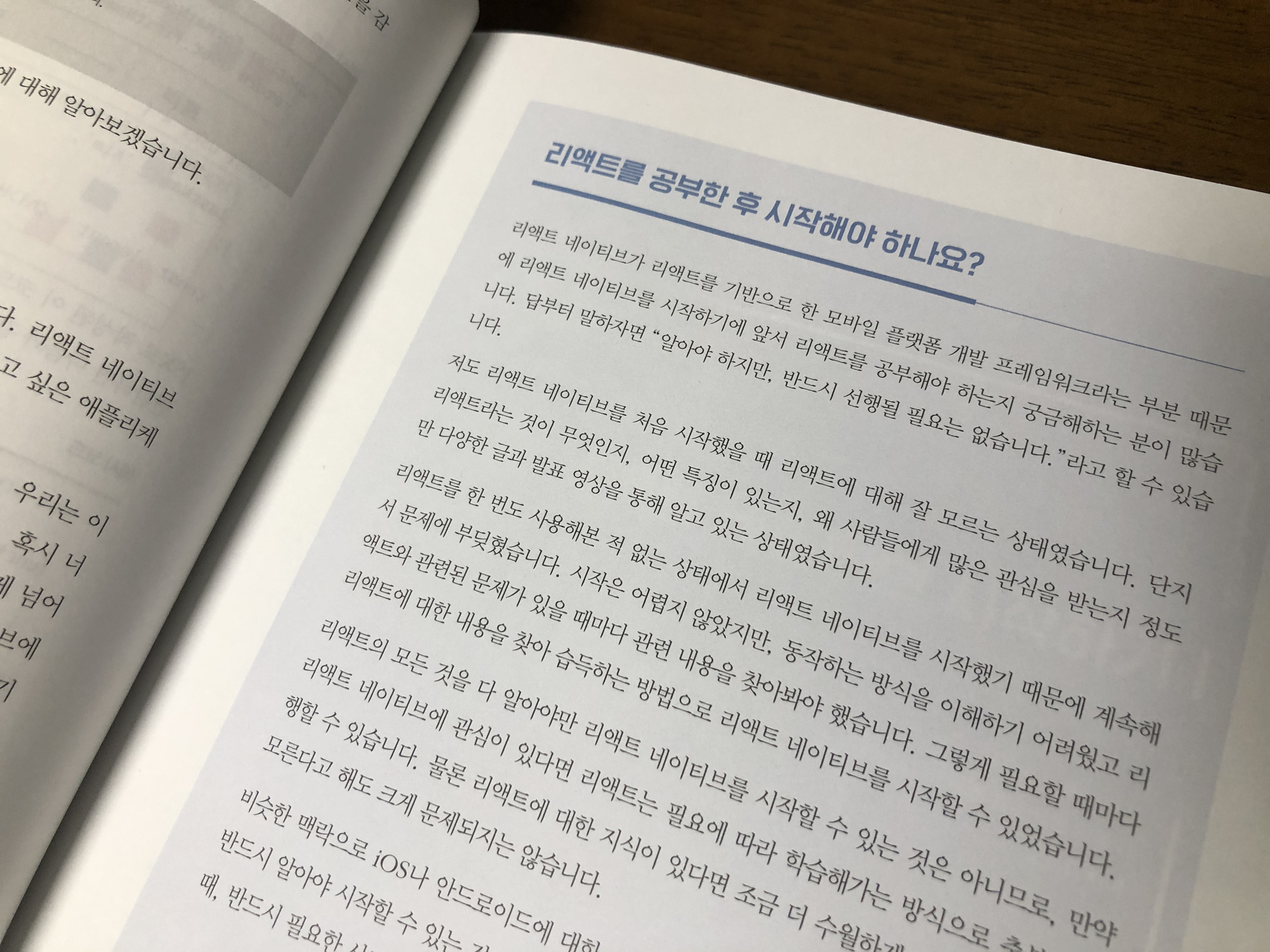 리액트 네이티브 개발을 처럼 시작한다면 ‘처음 배우는 리액트 네이티브’ 책이 괜찮은 선택이라 생각합니다. 이 책을 한 번 보고 감을 잡은 후 필요한 내용을 찾아보면서 개발하면 될 것 같습니다.