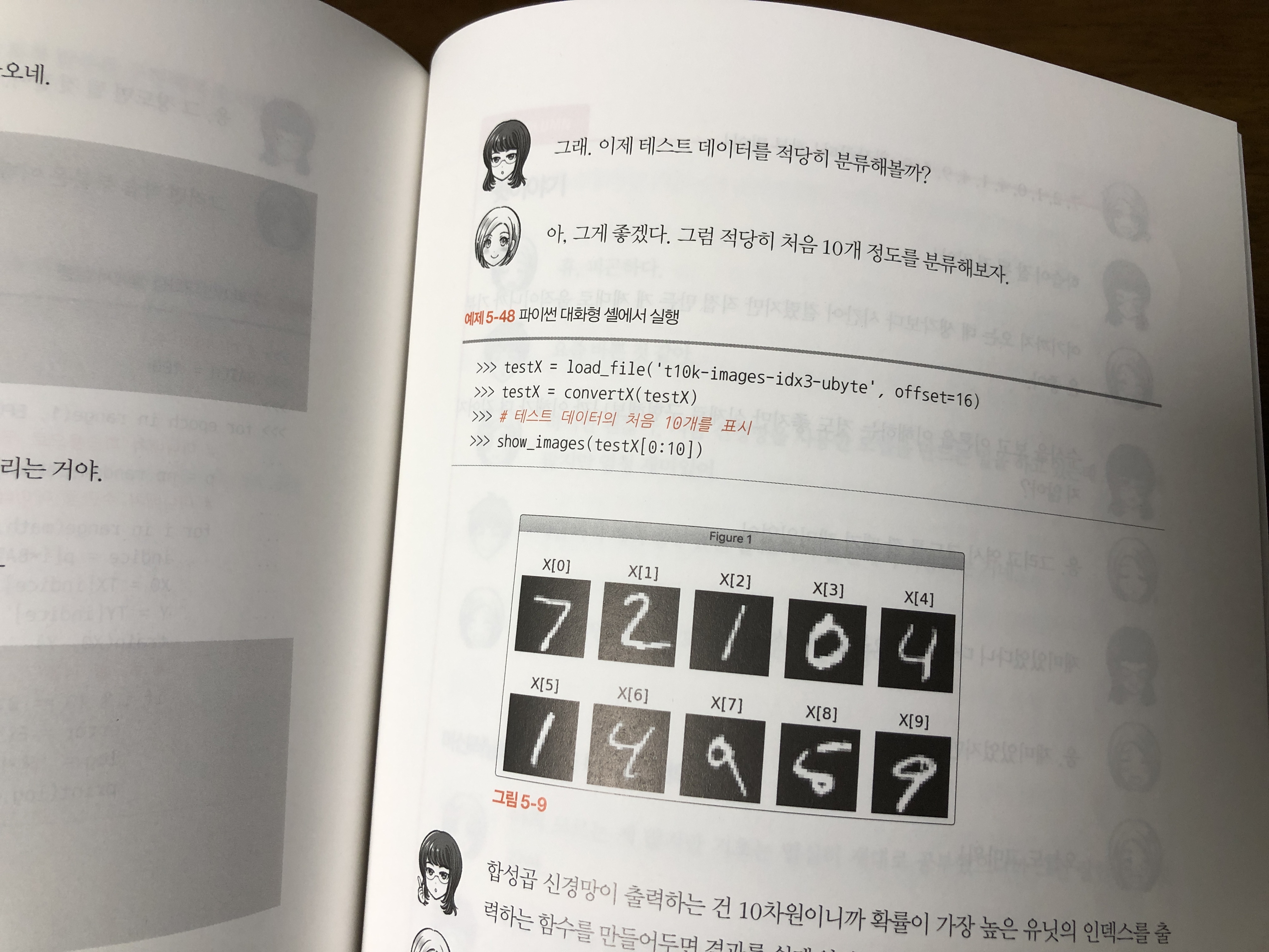 마지막 장 5장에서는 파이썬을 이용하여 딥러닝(이미지 사이즈 판정, 손글씨 인식)을 어떻게 구현하는지 배웁니다. 첨자가 많아 더 복잡해 보이는 수학공식, 배열로 어수선한 파이썬 코드가 어려워 보여도 따라하다보면 그리 어렵지 않습니다.