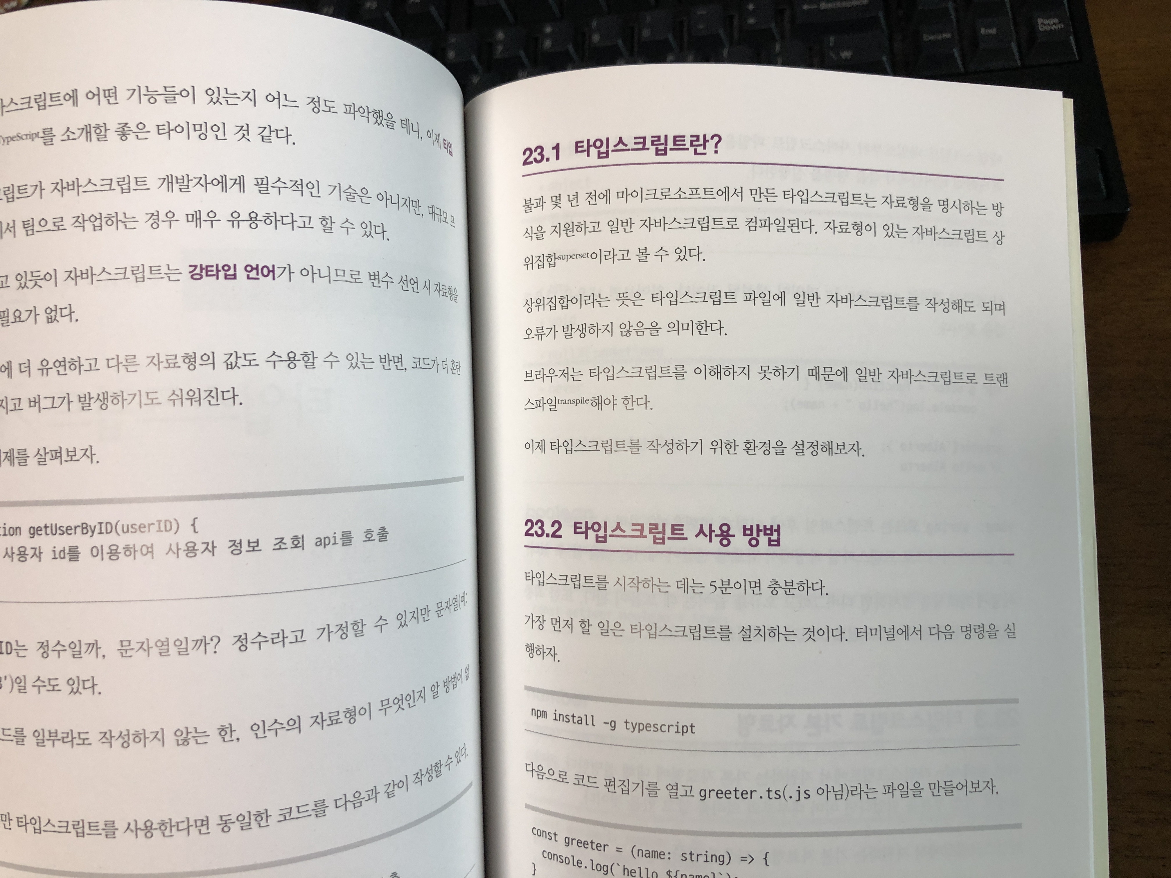 고맙게도 이 책은 타입스크립트(TypeScript)까지 다루고 있습니다. 제 실력이 부족한 탓인지 파이썬과는 달리 자바스크립트로 좀 복잡한 프로그램을 개발하다 보면 코드의 가독성이 떨어지는 문제가 있습니다. 이런 문제에 타입스크립트가 도움이 될 것 같습니다. 이 책의 저자도 모든 자바스크립트 개발자가 타입스크립트를 알아야 한다고 말합니다.