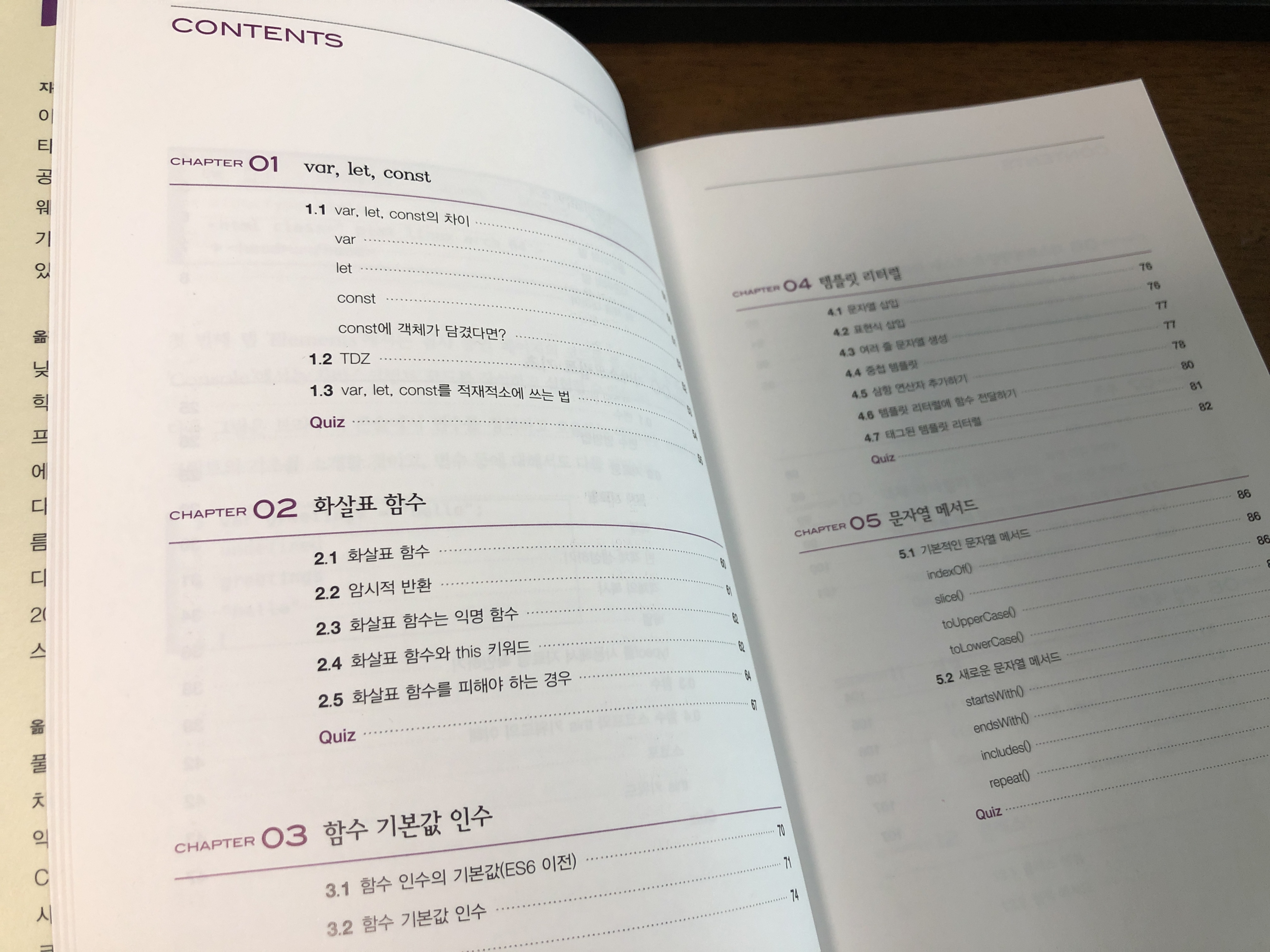 처음에는 정말 자바스크립트 기초를 다룹니다. 변수, 자료형, 함수, 문자열, 루프, 배열, 클래스까지. 책에서 나오는 예제가 짧고 이해하기 편해 부담없이 문법을 습득할 수 있습니다. 각장마다 마지막에는 연습문제(Quiz)가 있어서 배운 내용을 확인하는데 도움이 될 수 있습니다. 기초를 배우고 나면 뒷부분에서는 프로미스 같은 나름 최신 트렌드 배울 수 있습니다. ES2016부터 ES2020의 새로운 기능도 설명하는데 부록에서는 더 나아가 ES2021까지 다루고 있습니다.