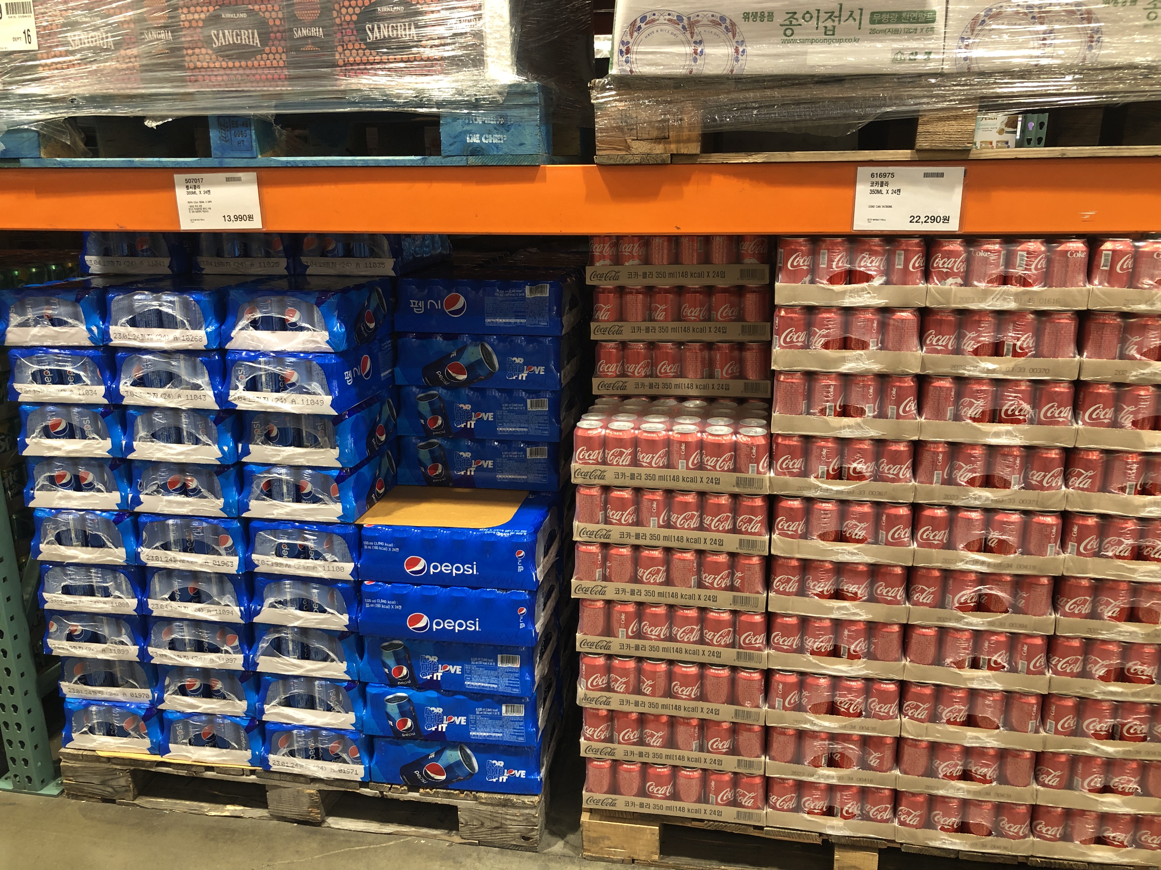 코스트코(COSTCO)에서 펩시콜라와 코카콜라가 나란히 가격 경쟁을 펼칩니다.