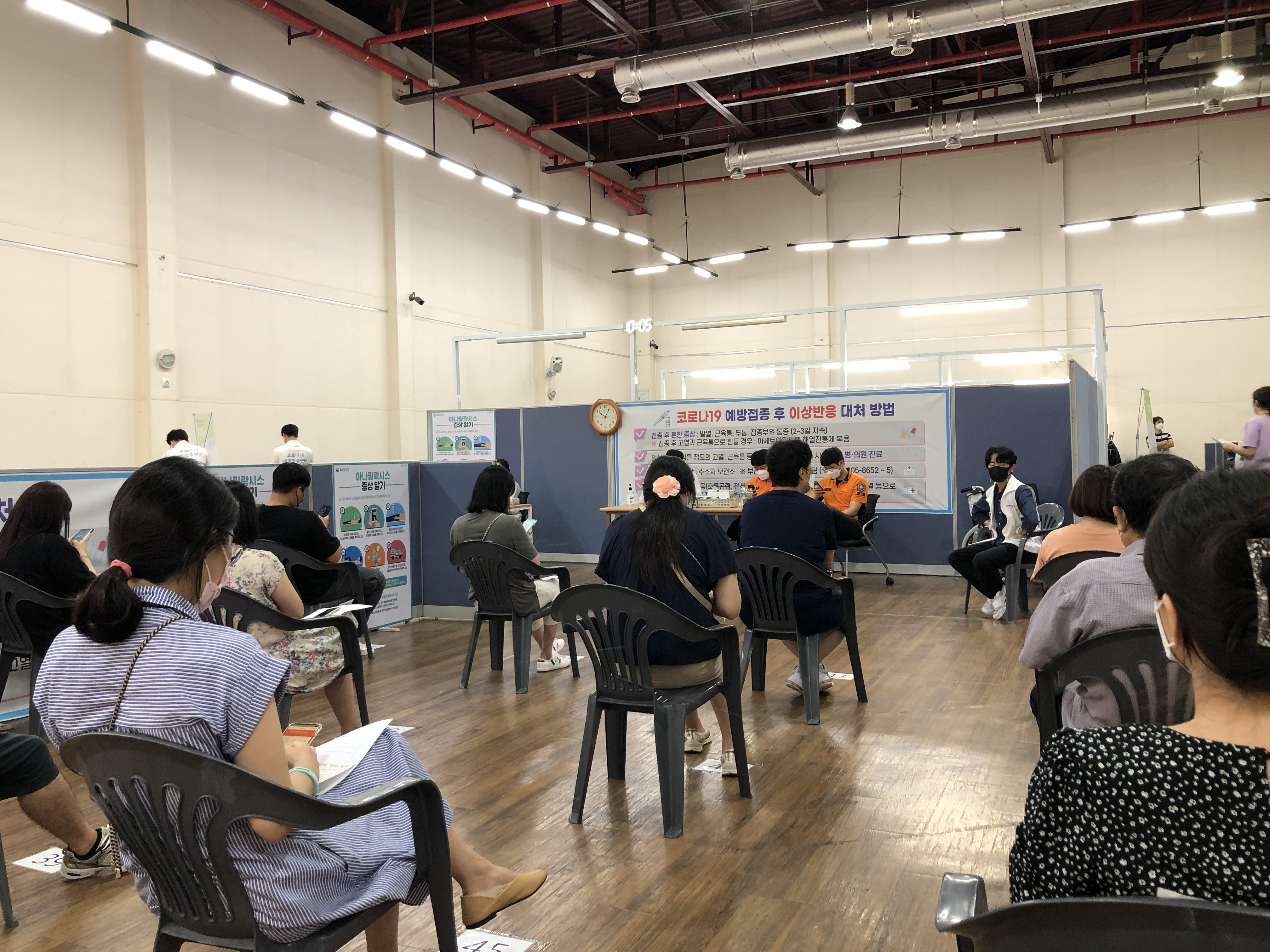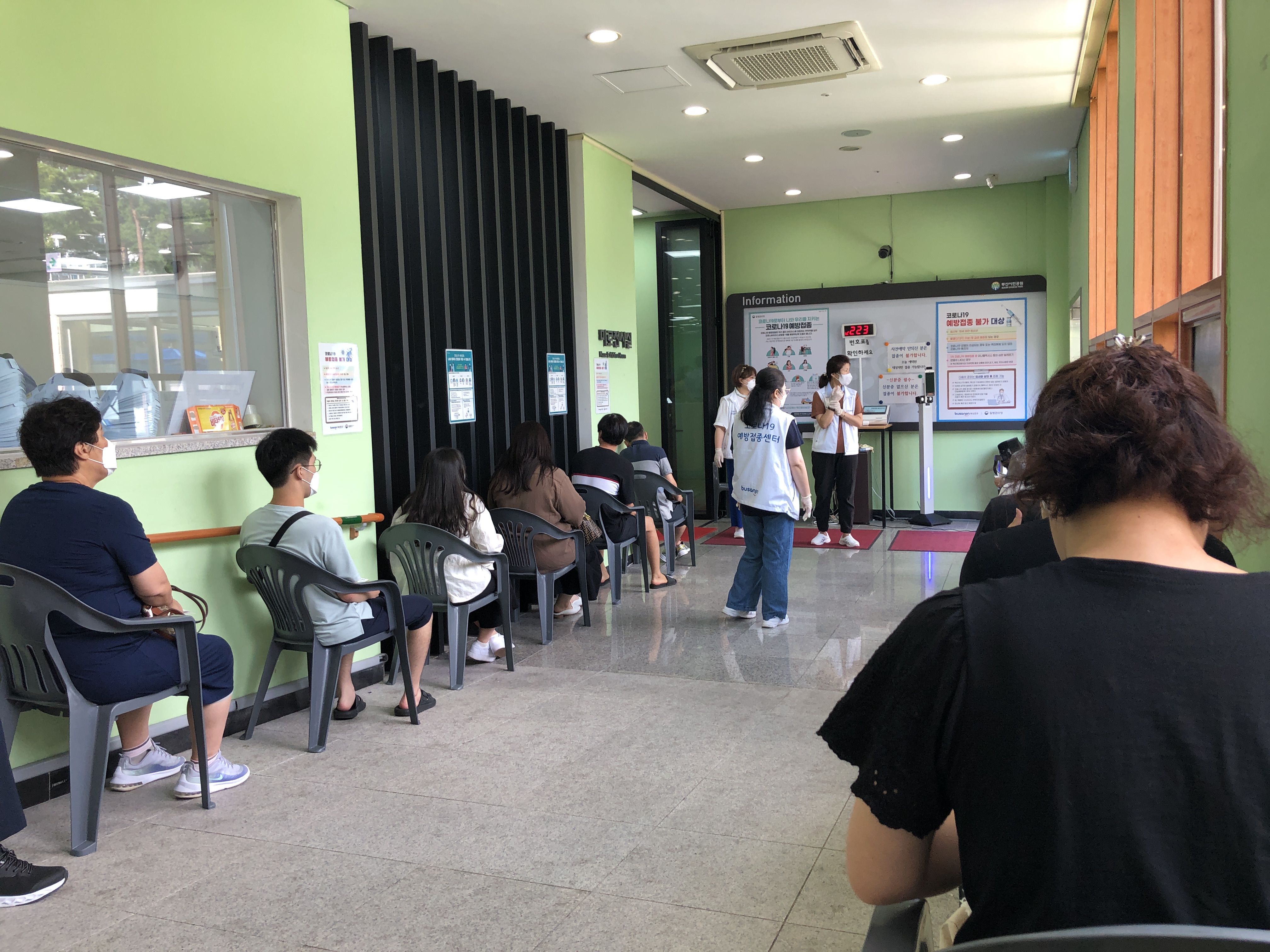 백신 접종 후 15분~30분 동안 접종기관에 머무르며 이상반응을 관찰하는 중. 보통 15분정도 관찰하고 알레르기가 있는 사람은 30분 관찰해야 합니다. 가만히 앉아서 기다리다 번호를 부르면 집으로 돌아가면 됩니다.