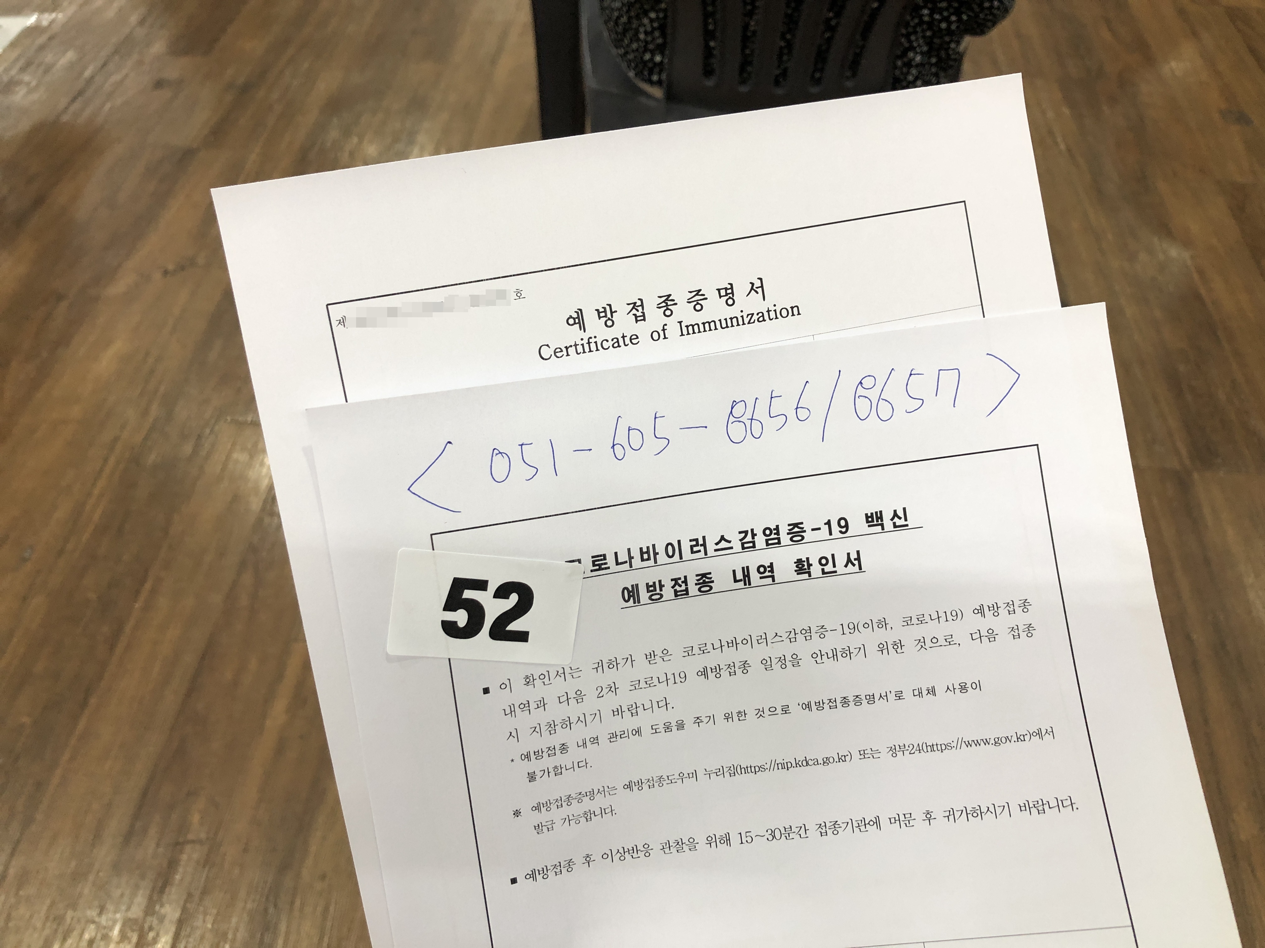 백신 맞고 이상반응 관찰하기 전 직원분에게 회사에 제출할 예방접종증명서를 어디서 뽑아야 하는지 물어보니 직접 '예방접종증명서' 뽑아주시네요. (물론 사이트에서 직접 출력하셔도 됩니다. 참고로 2차 접종 날짜변경은 전화로 가능합니다.)
