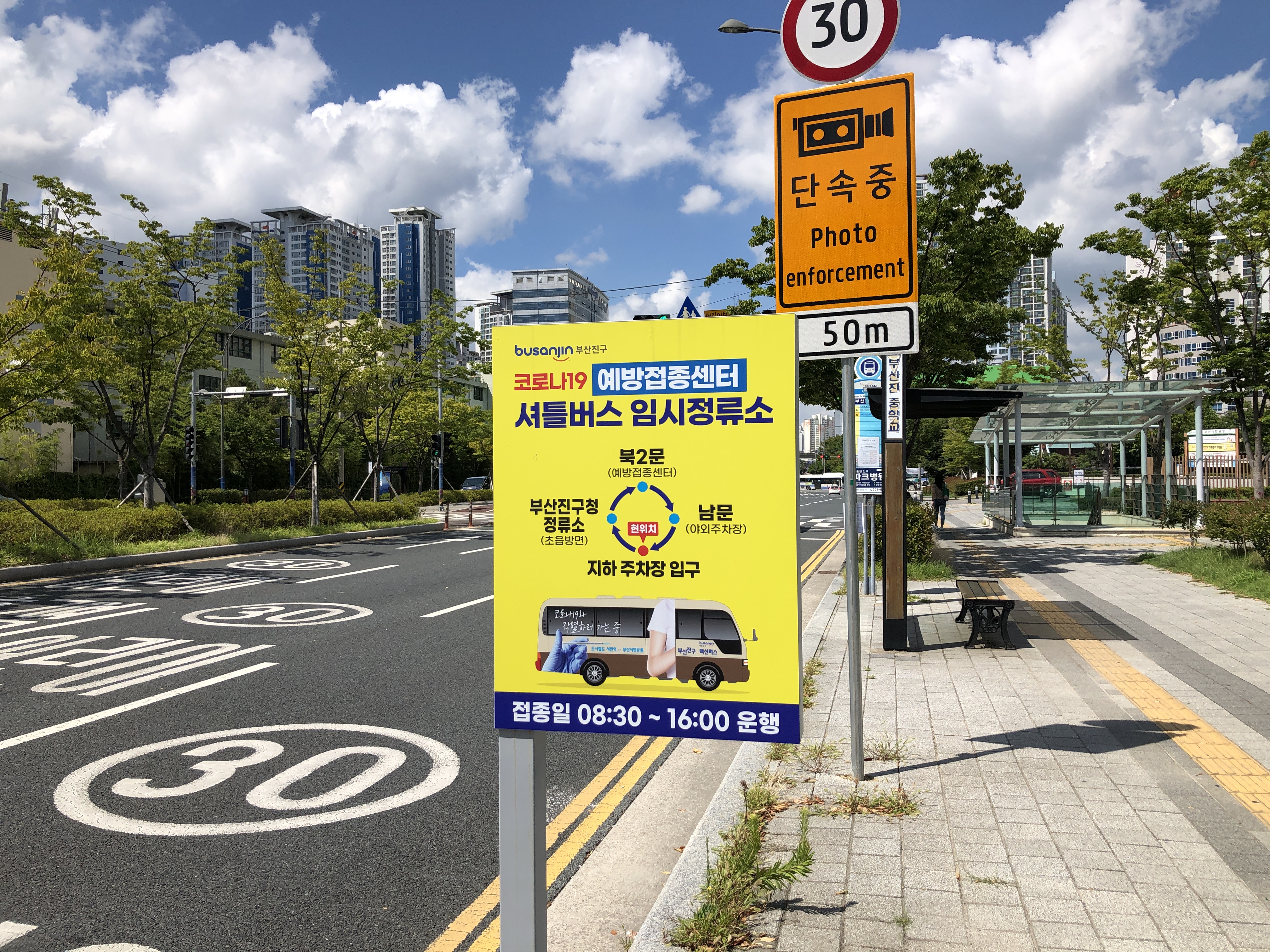 셔틀에서 내려 부산진구 예방접종센터로 걸어간다.