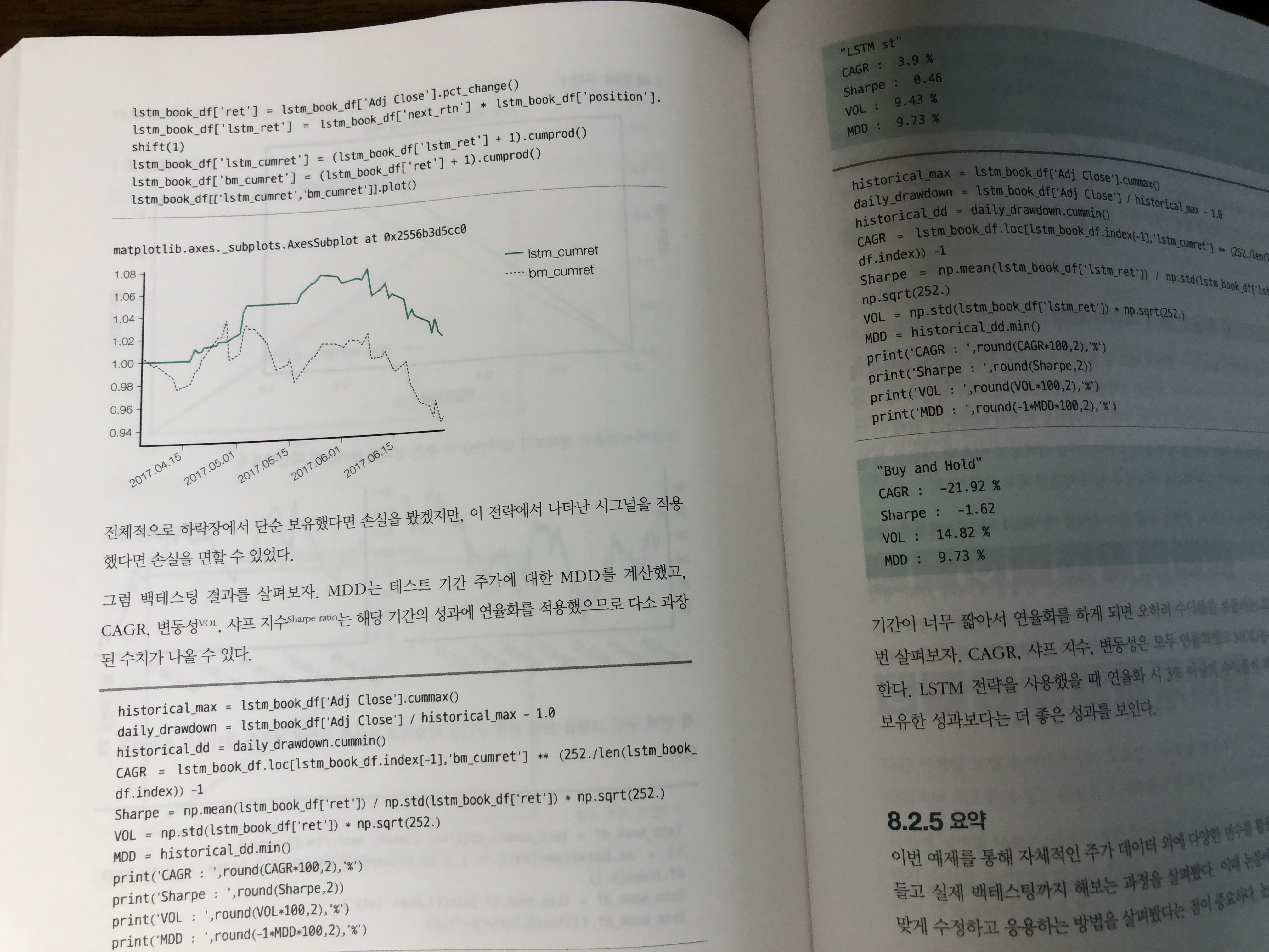 퀀트 전략을 위한 인공지능 트레이딩. 책의 모든 내용을 이해하고 따라하지는 않았습니다. 퀀트 전략을 파이썬 코드로 어떻게 구현하고 사용하는지를 개략적으로 파악하는 것도 사는데 도움이 되지 않을까 싶습니다. 시중에 나와있는 인공지능 투자 상품이 뭔지는 대강 알 수 있으니까요. 퀀트가 투자의 모든 것은 아니지만 활용할수록 수익률이 좋아지지 않을까 생각합니다.