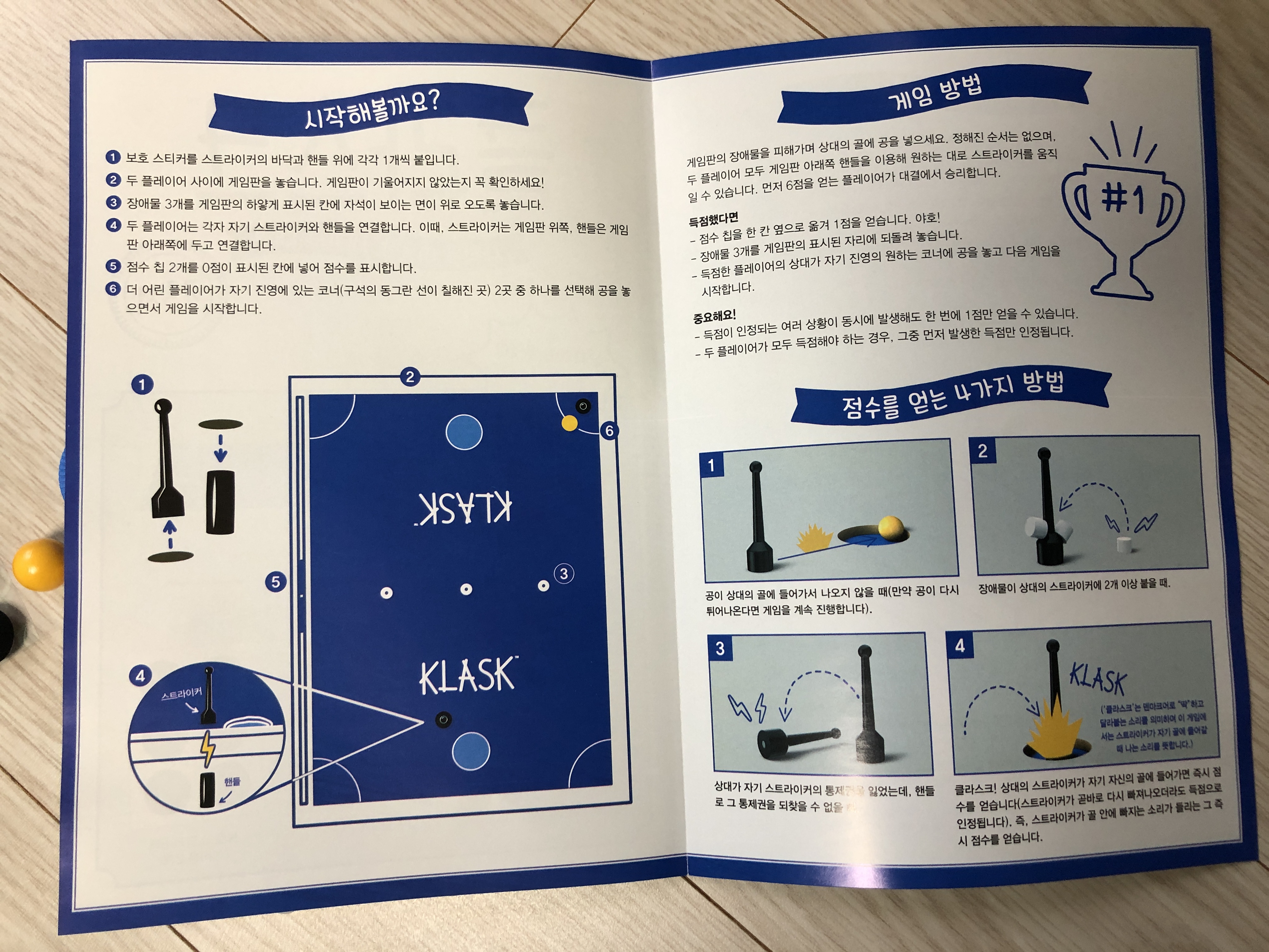 게임 규칙은 정말 간단합니다. 기본적으로 상대방 구멍에 공을 넣는 게임입니다. 장애물 2개가 스틱에 붙어도 1점이 나는 등. 점수를 내는 다양한 방법이 있으니 게임을 하기 전에 설명서를 한 번만 읽어보세요. 초등학교 저학년도 아주 쉽게 따라 하고, 유치원 다니는 6세 아이도 어설프지만 나름 잘 따라 합니다. 근데 너무 어린아이는 공이나 장애물을 삼길 수 있으니 조심하세요. (제품 박스를 보면 만 8세부터 할 수 있는 게임이라고 합니다.)