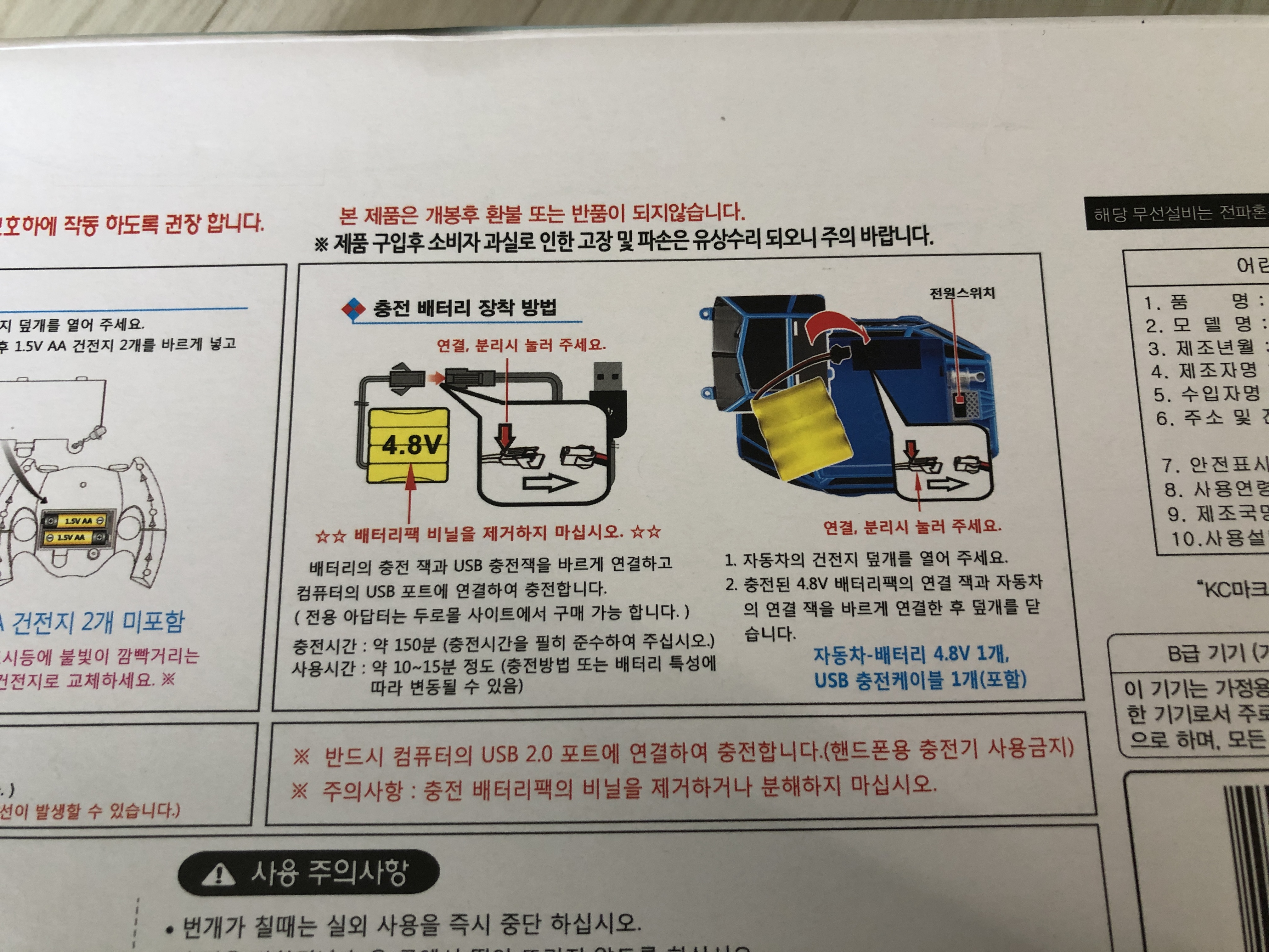 메카닉 인섹트 RC카에는 전용 충전 배터리만 사용 가능합니다. 이 장난감을 사용하면 가장 큰 단점이 배터리를 충전할 때마다 드라이버로 뚜껑을 열어야 한다는 것입니다. 이게 정말 귀찮습니다. 커버를 열지 않아도 충전할 수 있게 외부 충전 단자가 있었다면 정말 좋았을 것 같습니다.