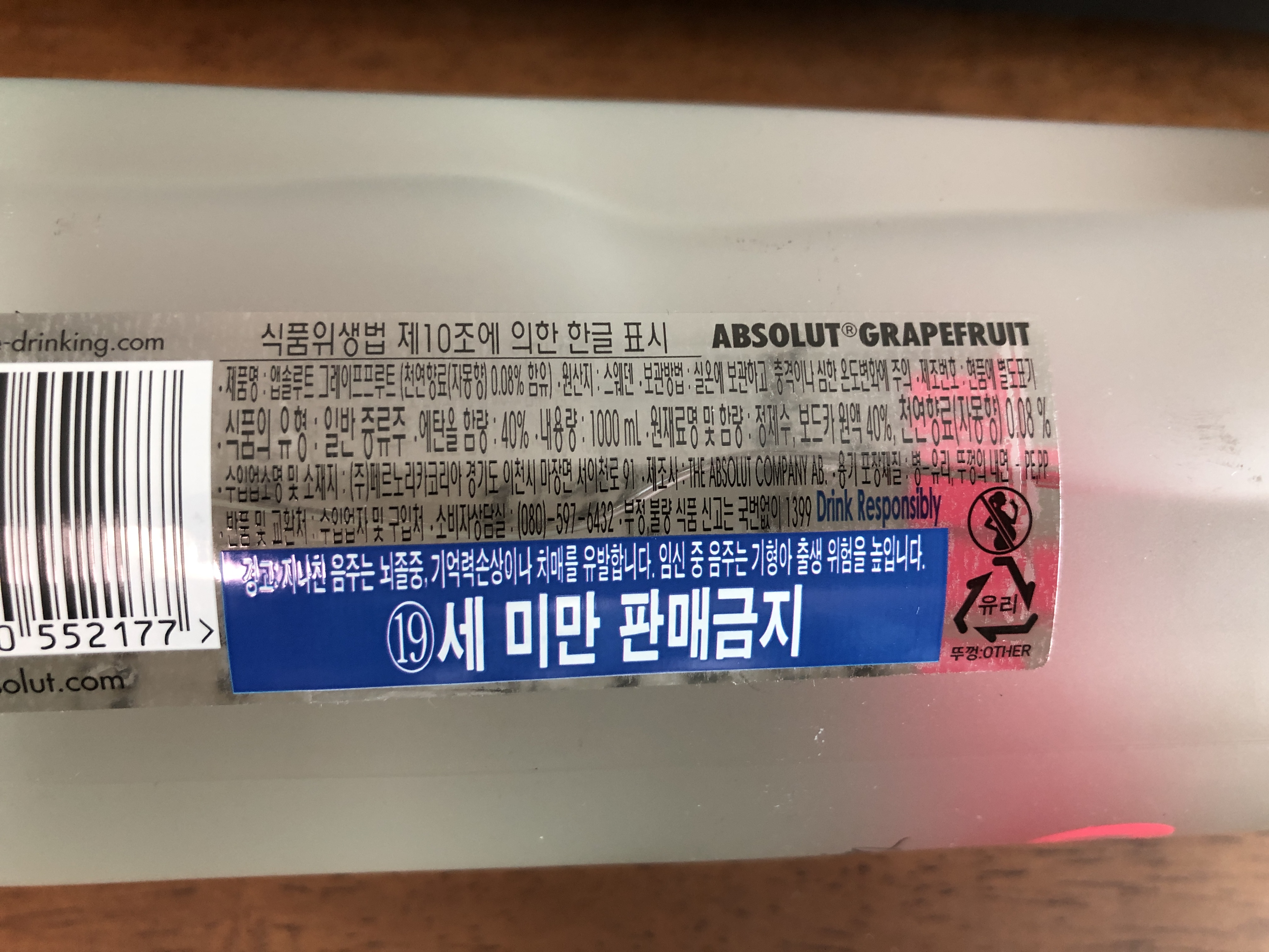 제가 산 앱솔루트는 과일향이 나는 '앱솔루트 그레이프프루트 보드카 ABSOLUT GRAPEFRUIT VODKA'입니다. 원산지를 보니 스웨덴 보드카네요. 무슨 향인가 궁금했는데 원재료를 보니 자몽향이 들어갔다고 하네요.
