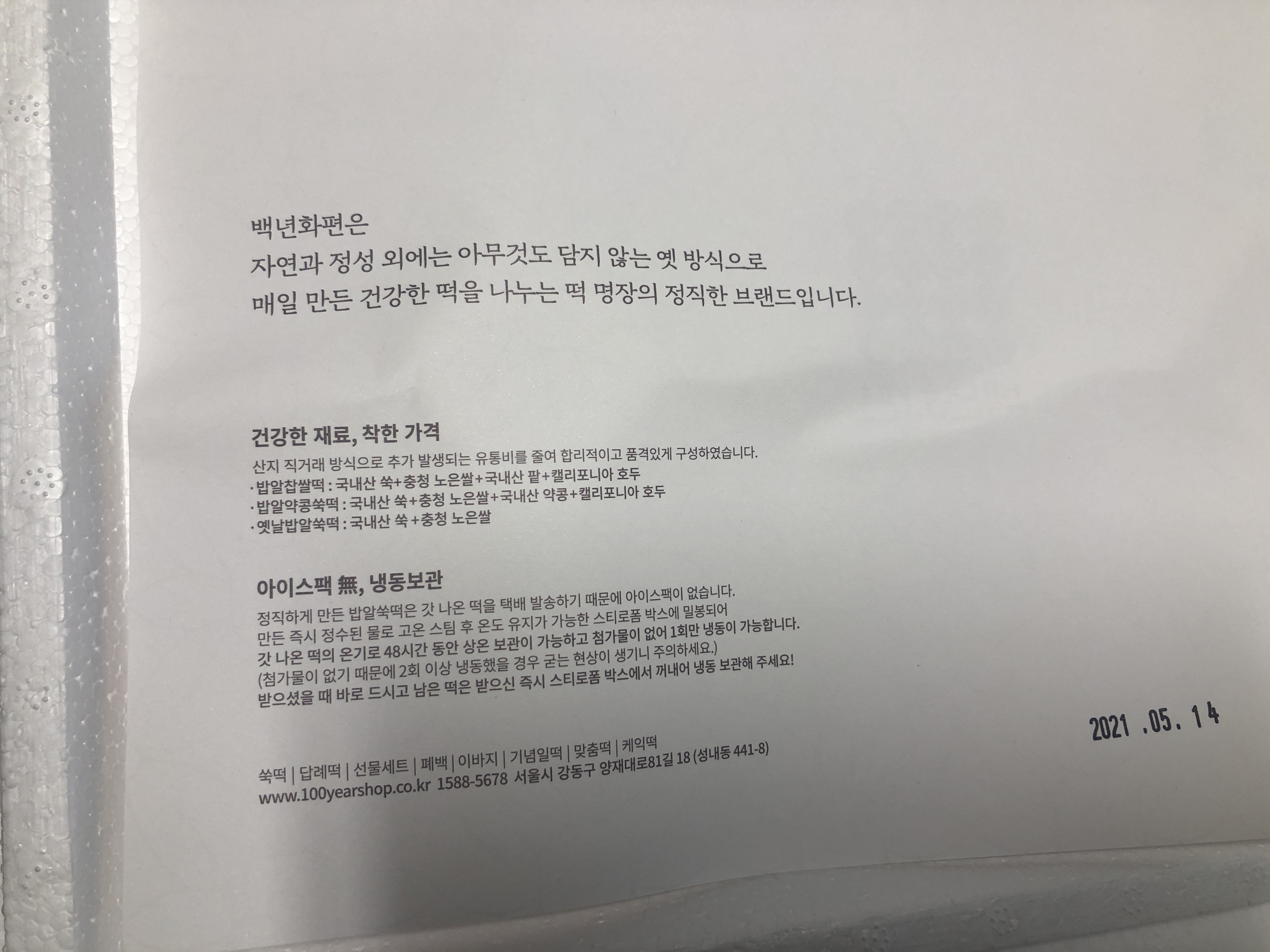 백년화편 밥알찹쌀떡은 갓 나온 떡을 바로 보내기 때문에 48시간 동안은 상온 보관해서 먹을 수 있습니다. 나중에 천천히 먹을 건 냉동실에 보관하면 됩니다.
