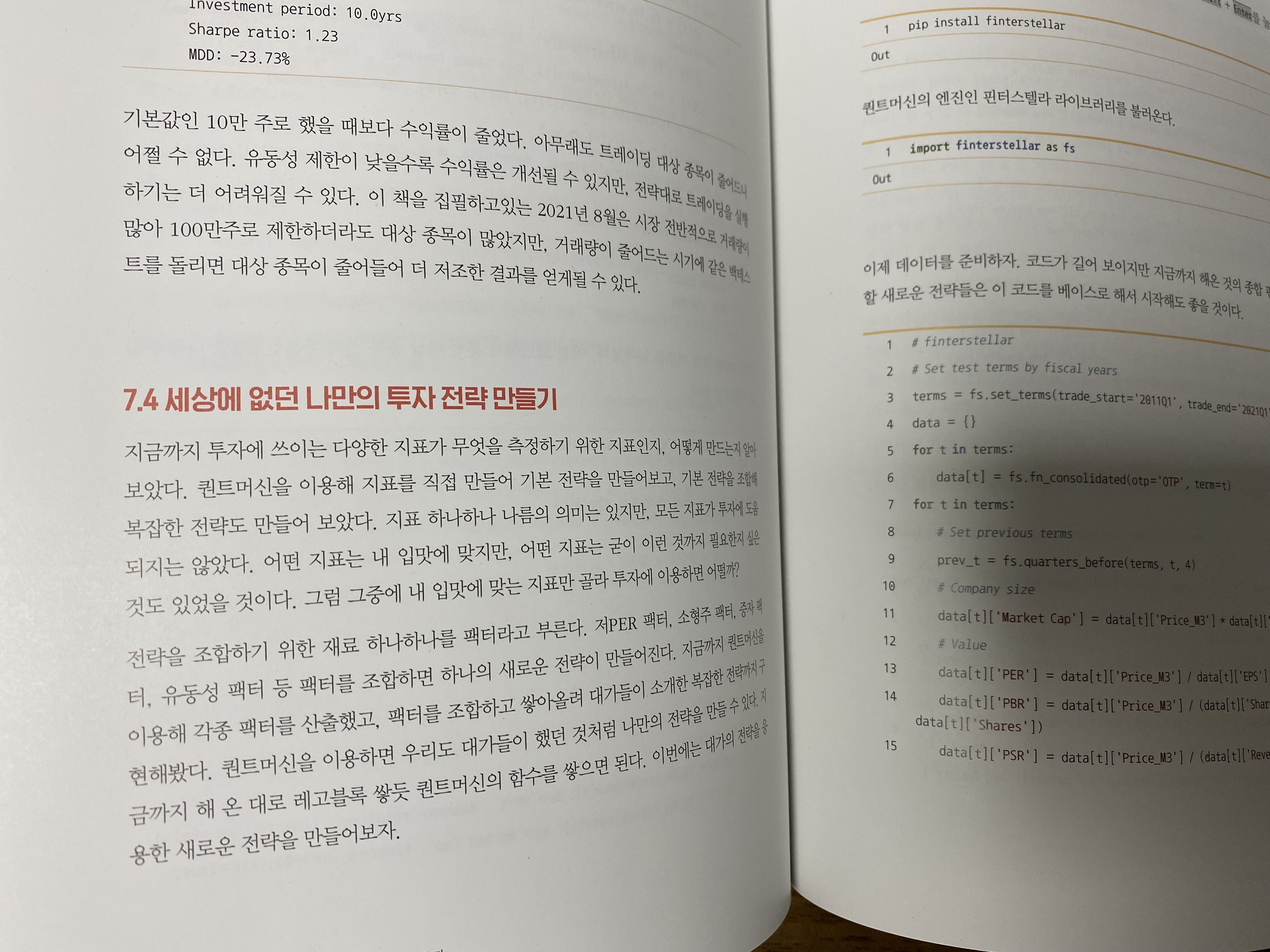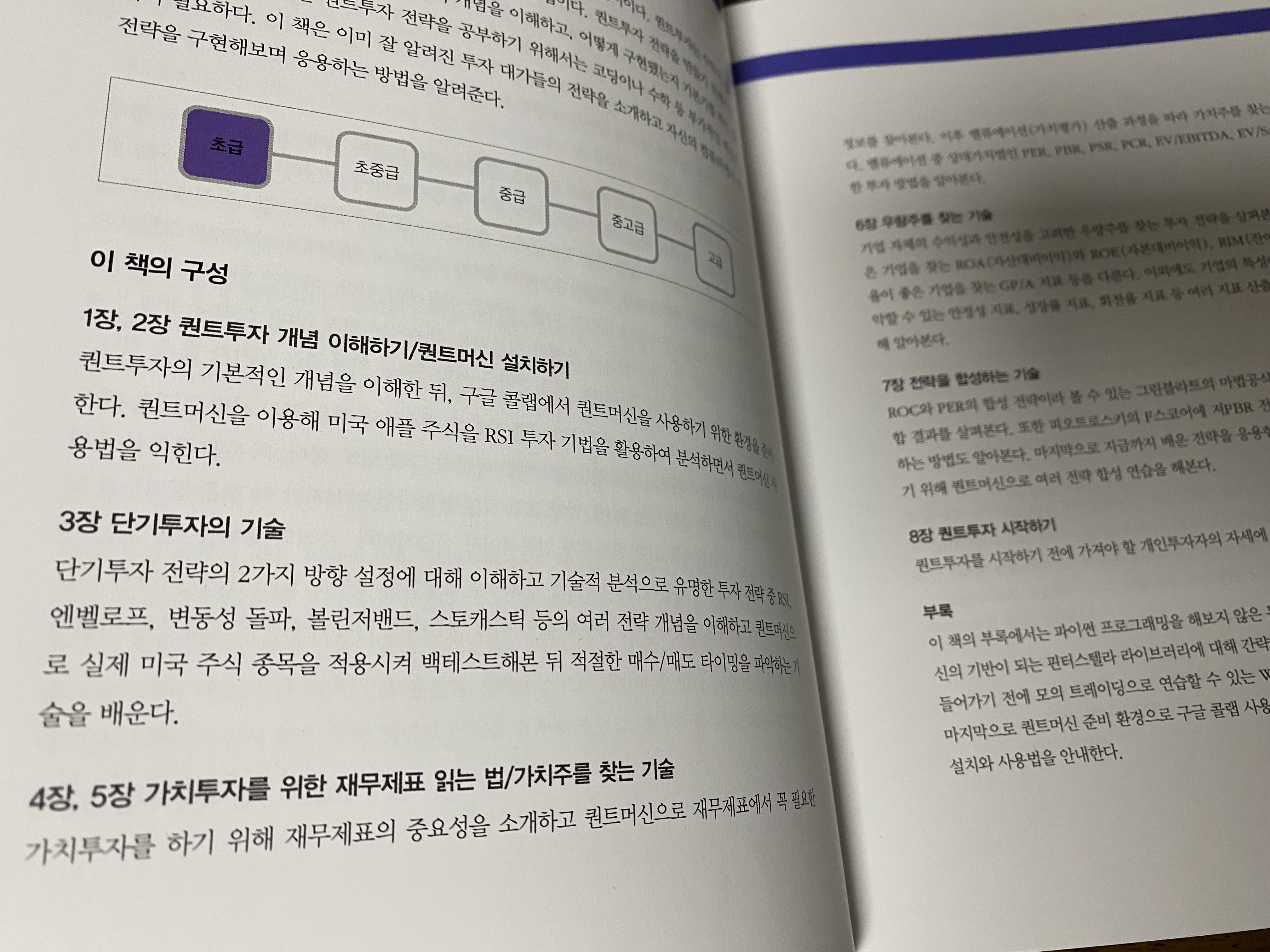 슬기로운 퀀트투자는 코딩만큼이나 투자 기초를 성명하는데 많은 페이지를 할애하고 있습니다. 단기투자에 필요한 차트, 보조지표는 물론이고 가치투자에 필요한 재무제표, PER, PBR, ROE와 같은 투자지표도 제대로 배울 수 있습니다. 나중에는 여러 전략을 합성하는 방법도 배우게 됩니다.
