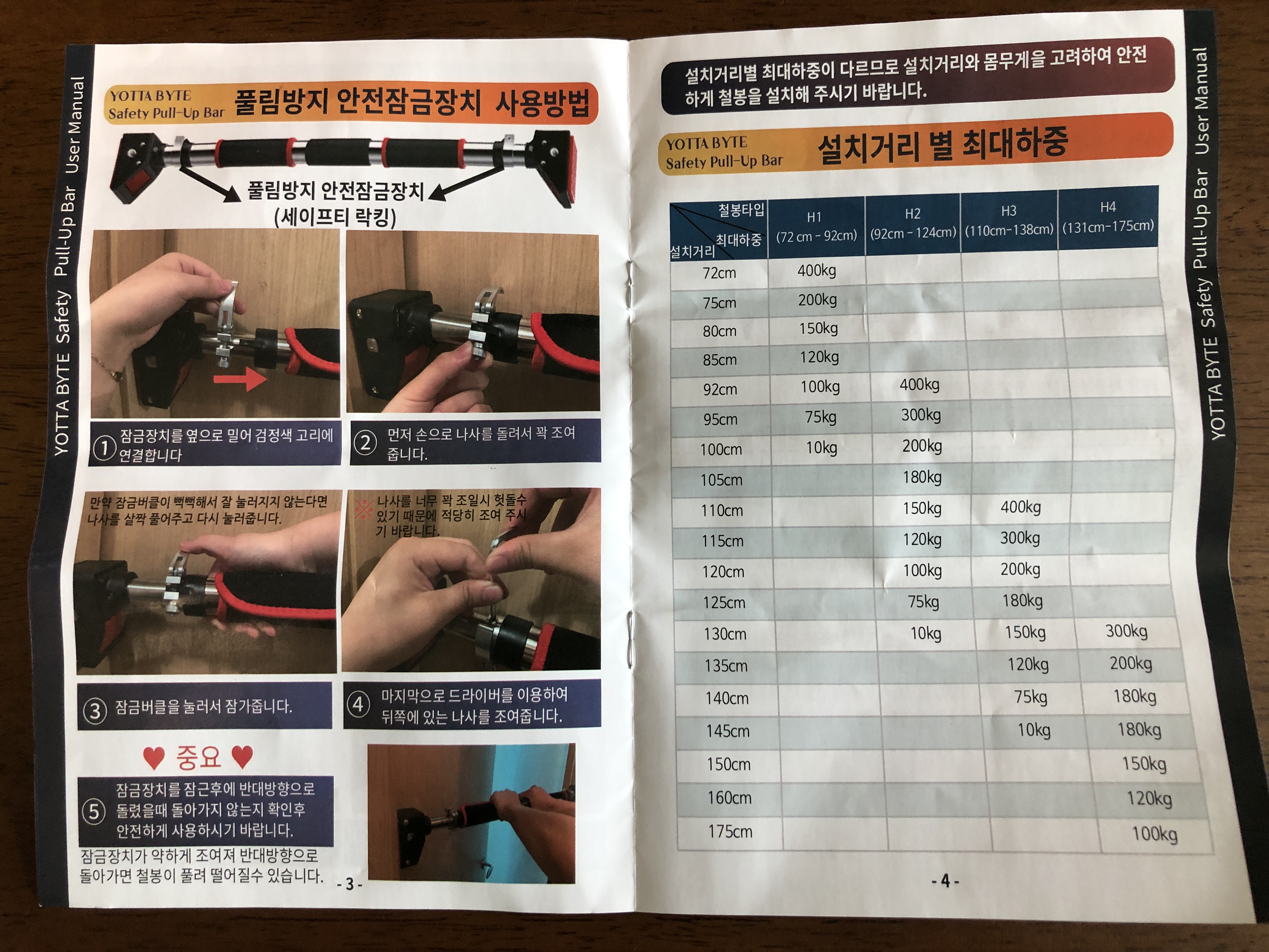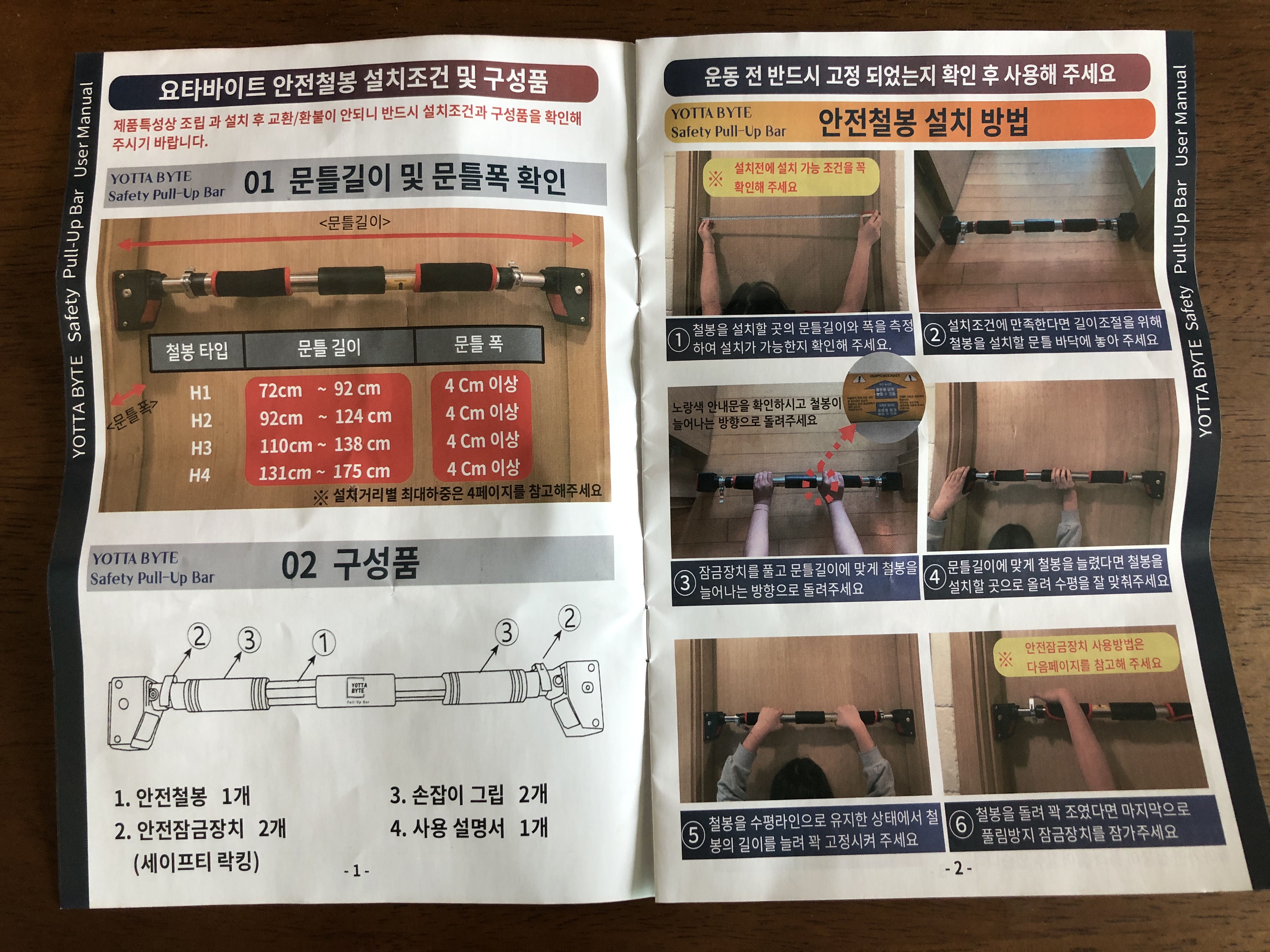 요타바이트 철봉 설치는 안전장치를 풀고 봉 길이를 늘이는 것부터 시작합니다. 자세한 설명은 설명서와 동영상을 참고하면 됩니다. 따라 하기 쉽습니다.