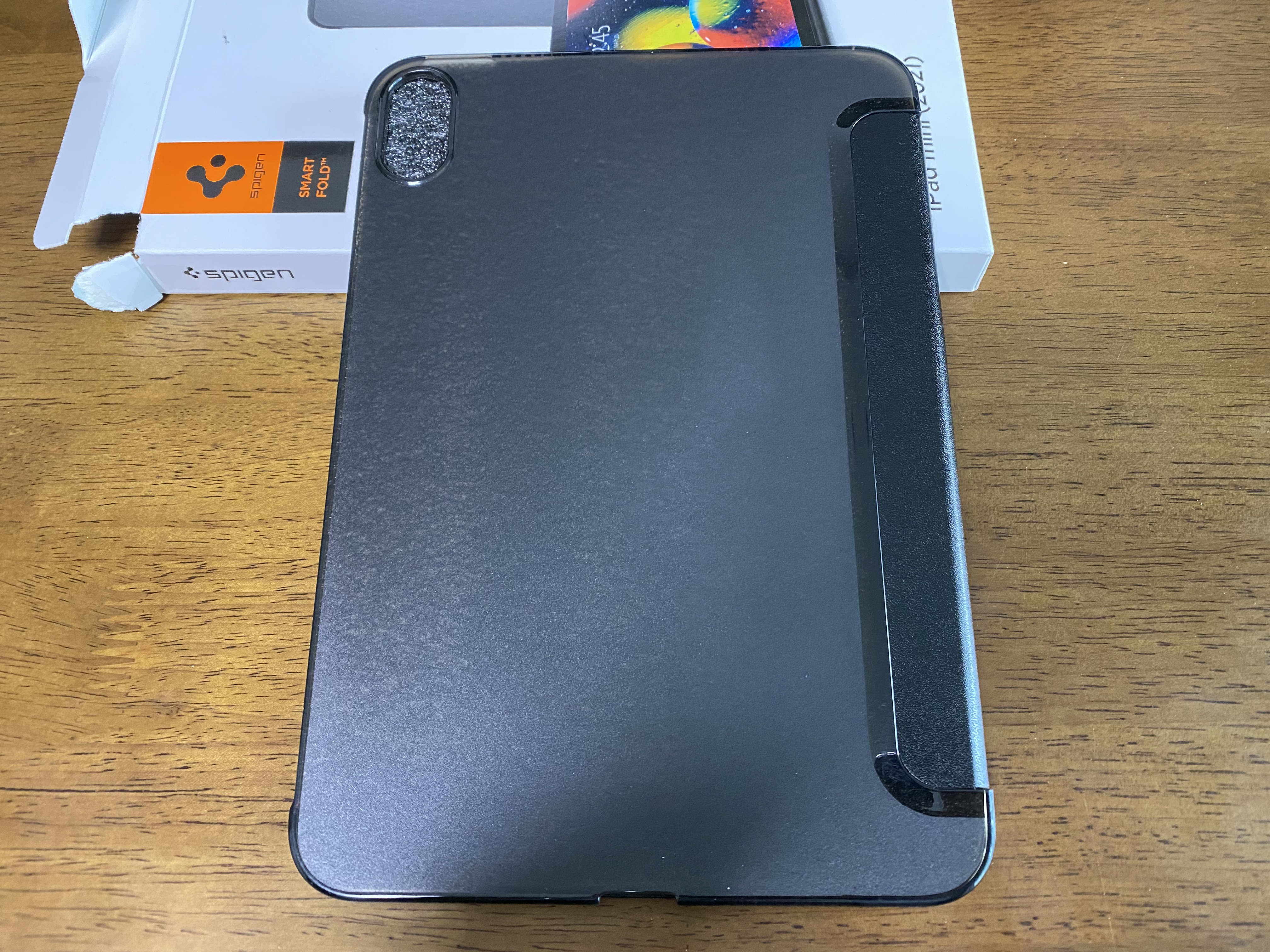 아이패드 미니6을 장착한 상태에서 덮개를 닫아보면 자석으로 착 달라붙는 것을 볼 수 있습니다. 자석 강도가 마음에 듭니다. 우측 하단에 슈피겐 로고도 보이네요.