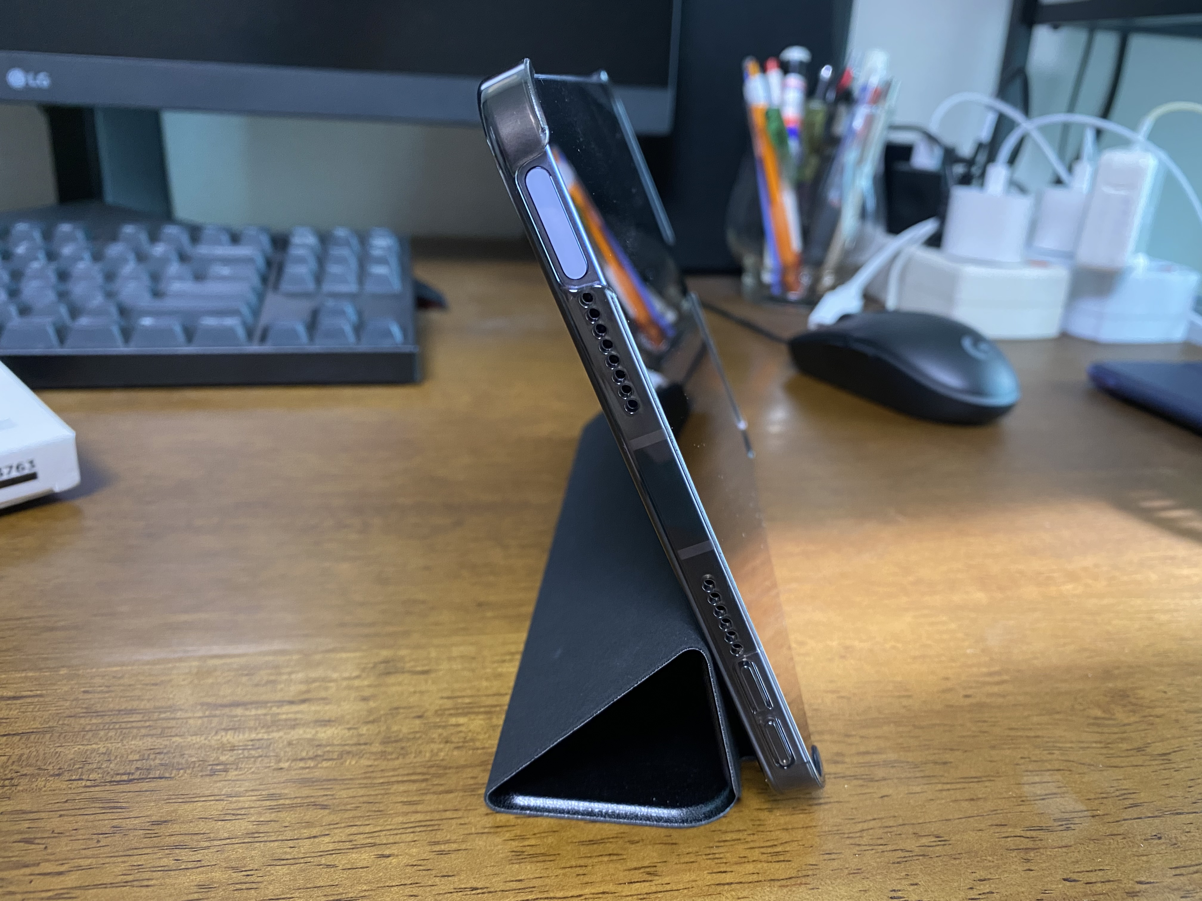 저렴한 케이스는 뒤로 밀면 삼각 지지대가 풀리는 경우가 있는데 이 제품은 자력이 좋아서 웬만해서는 풀리지 않습니다. 예전에 사용하던 아이패드 미니4 케이스와는 차원이 다르네요.