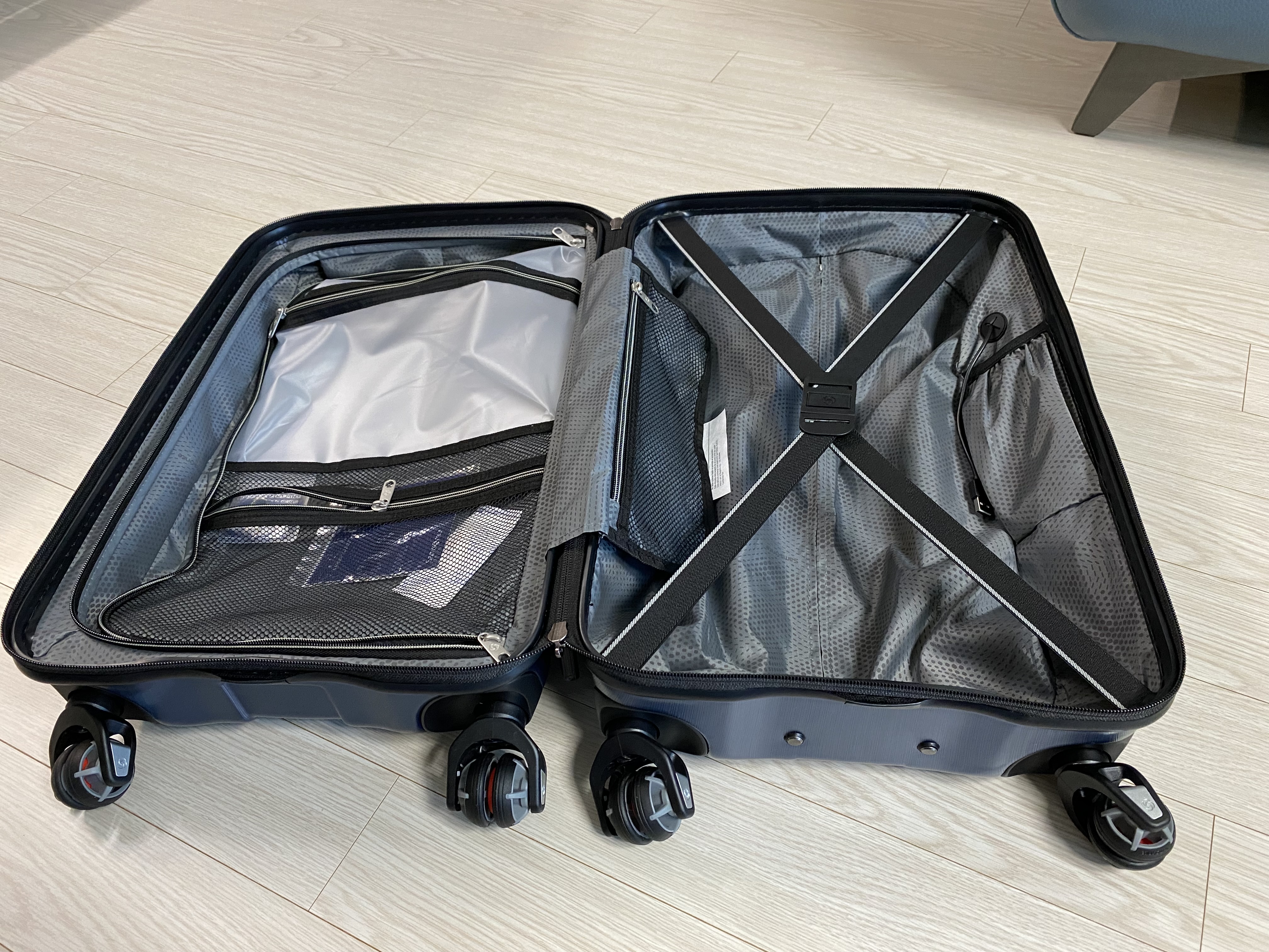 쌤소나이트 카본엘리트 여행가방 2종세트를 개봉한 모습입니다. 색상은 쉽게 질리지 않는 그런 블루 색상입니다. 일단 외관은 마음에 드네요. 견고하고 스크래치에 강할 것 같습니다.