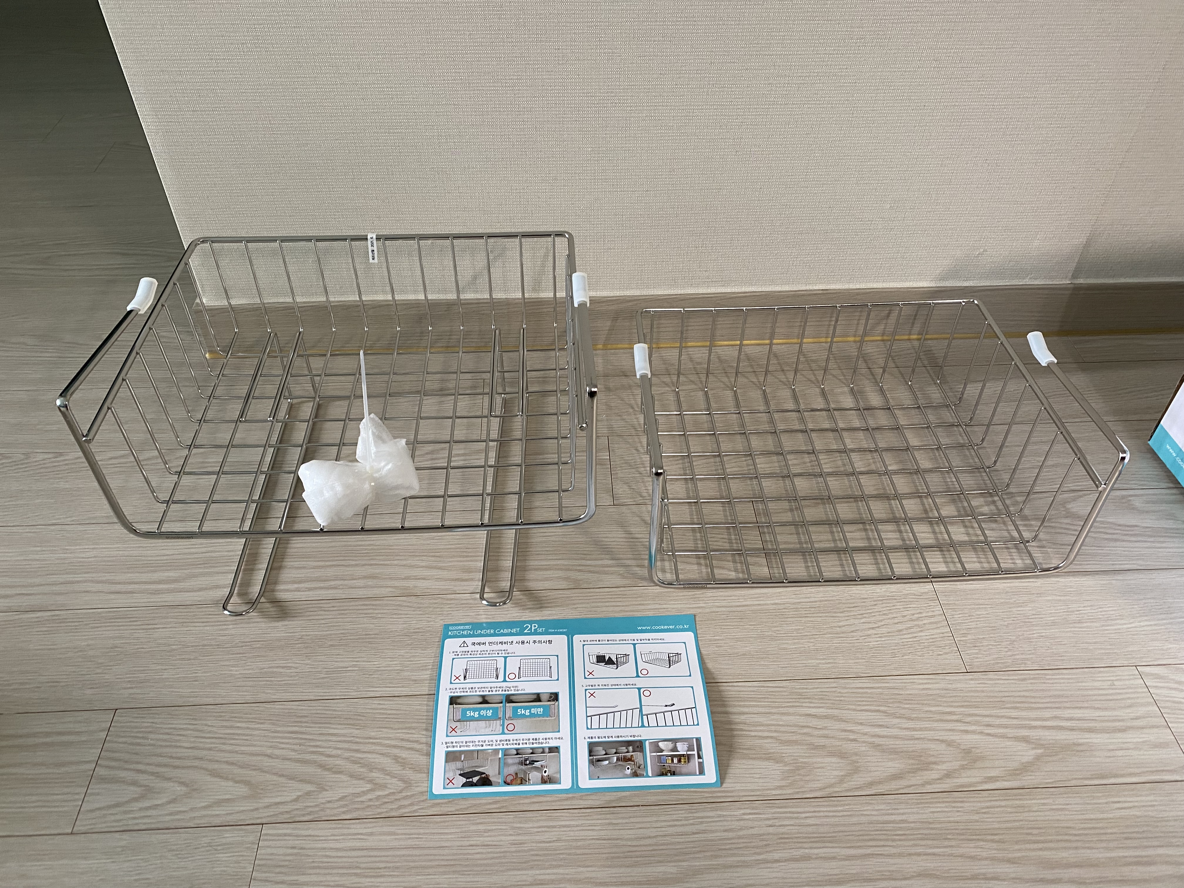 쿡에버 키친 언더 캐비넷은 2종류의 바구니를 포함합니다. 위 사진처럼 밑에 고리가 있는 제품과 없는 제품이 있습니다. 넓이는 같고 깊이와 높이에 약간 차이가 있습니다.