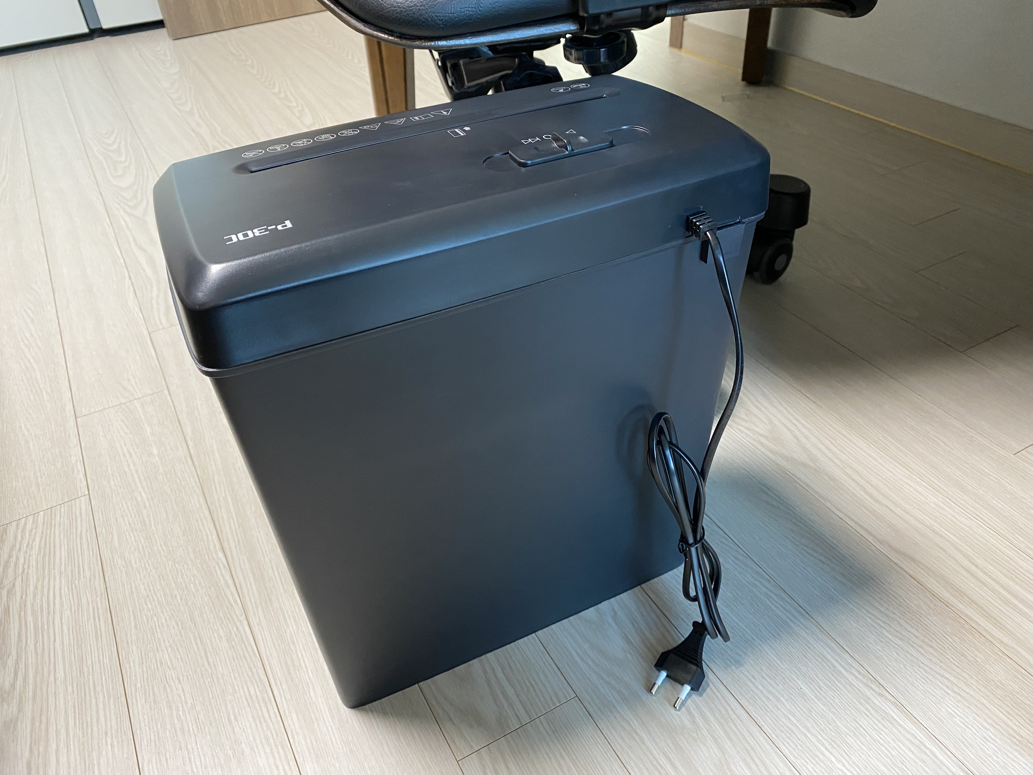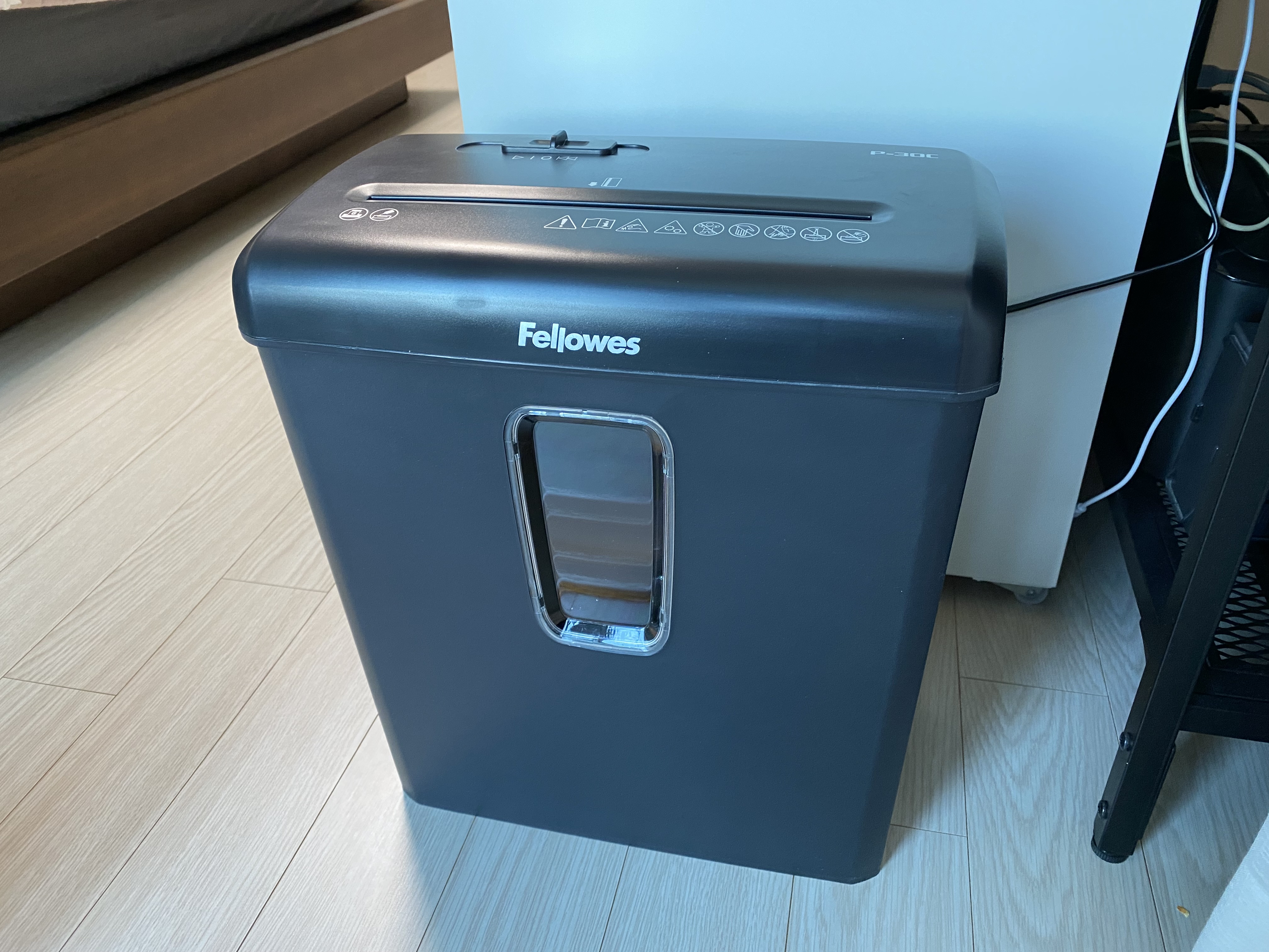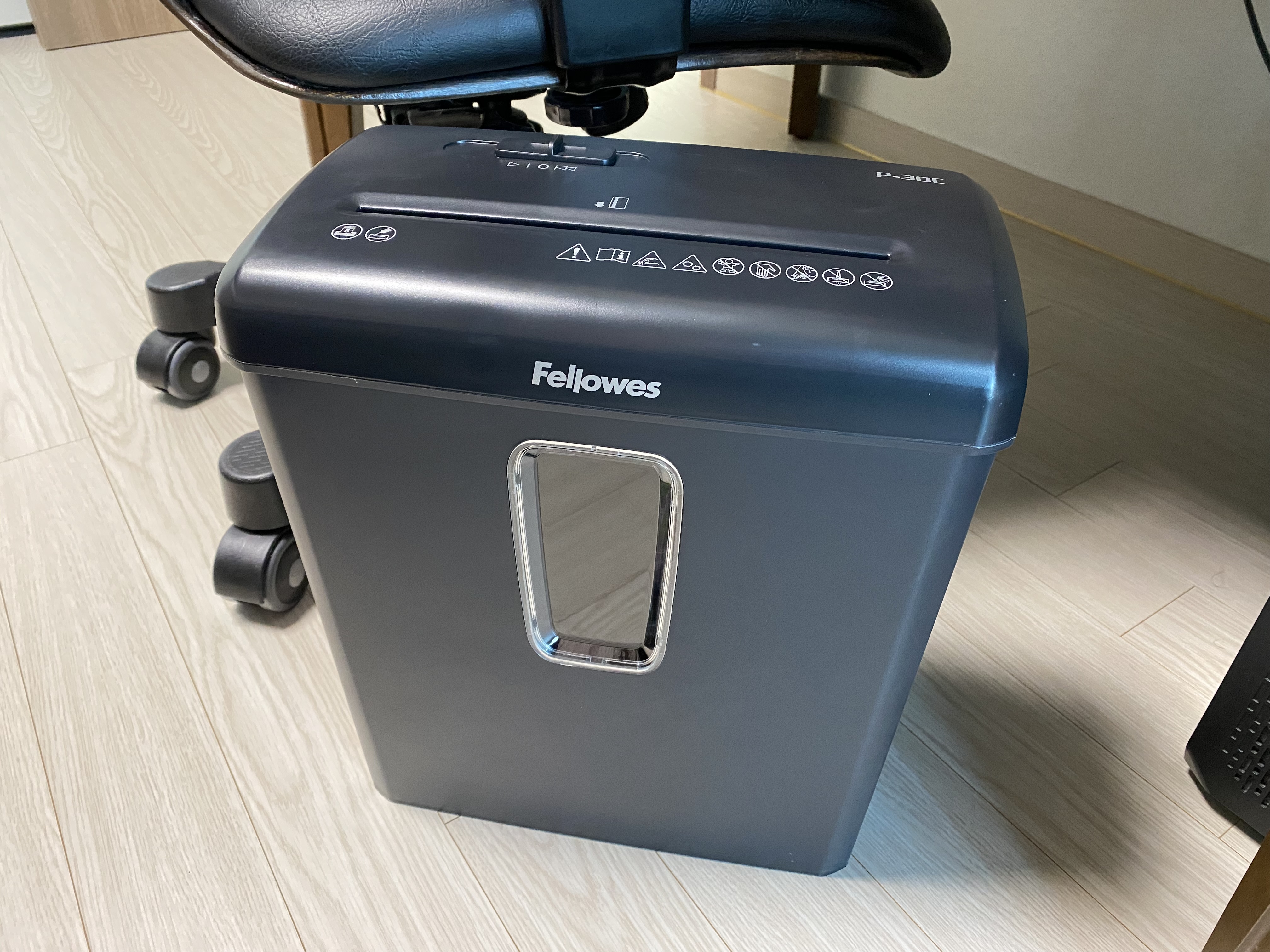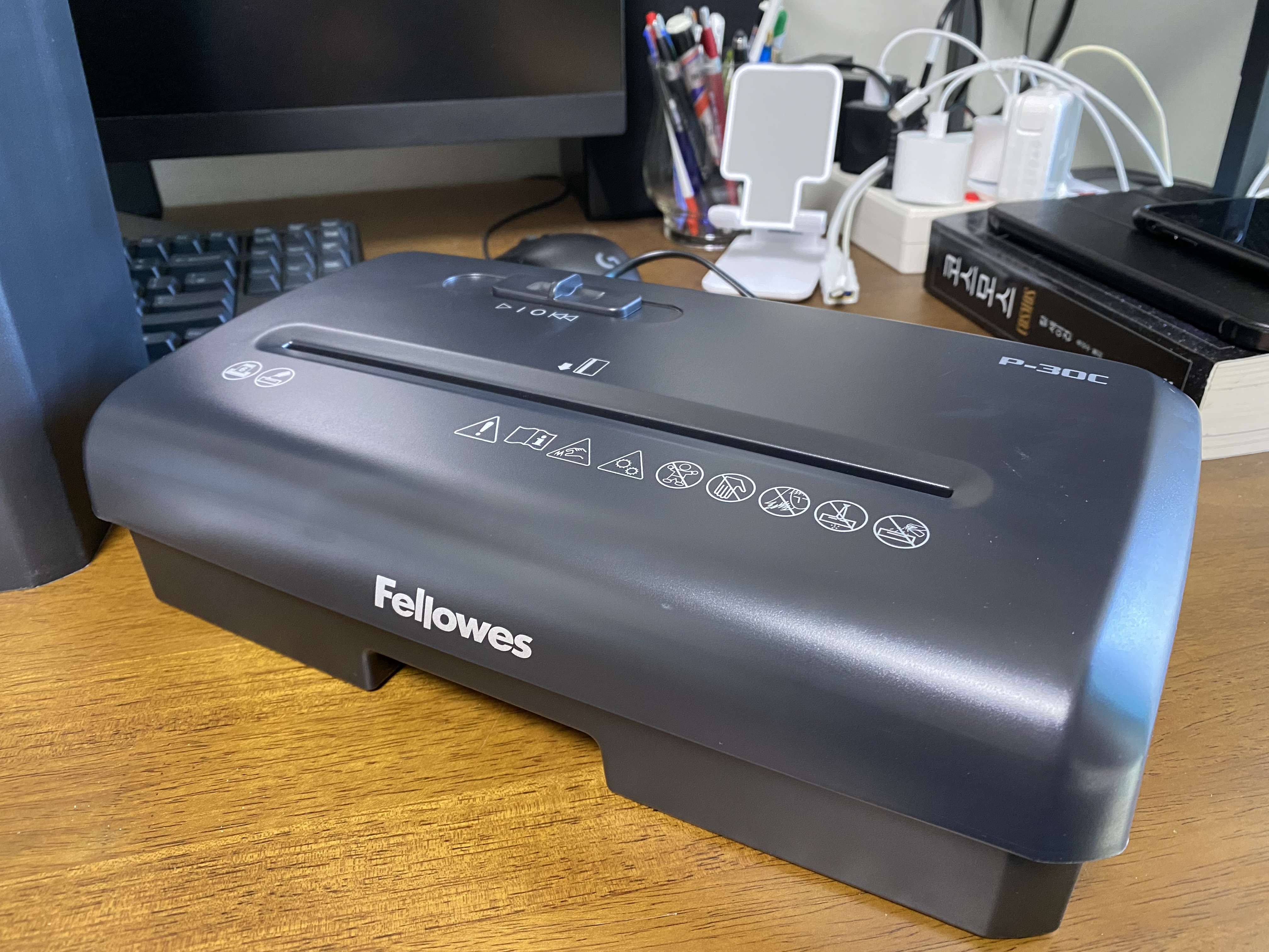 펠로우즈 문서세단기 (Fellowes Shredder) P-30C. 가정에서 소량만 쓸거라 구매를 망설였지만 사고 나서 정말 잘 쓰고 있습니다. 책상 밑에 두고 필요할 때마다 필요 없는 개인정보 문서를 갈아버리니 속이 시원하네요.