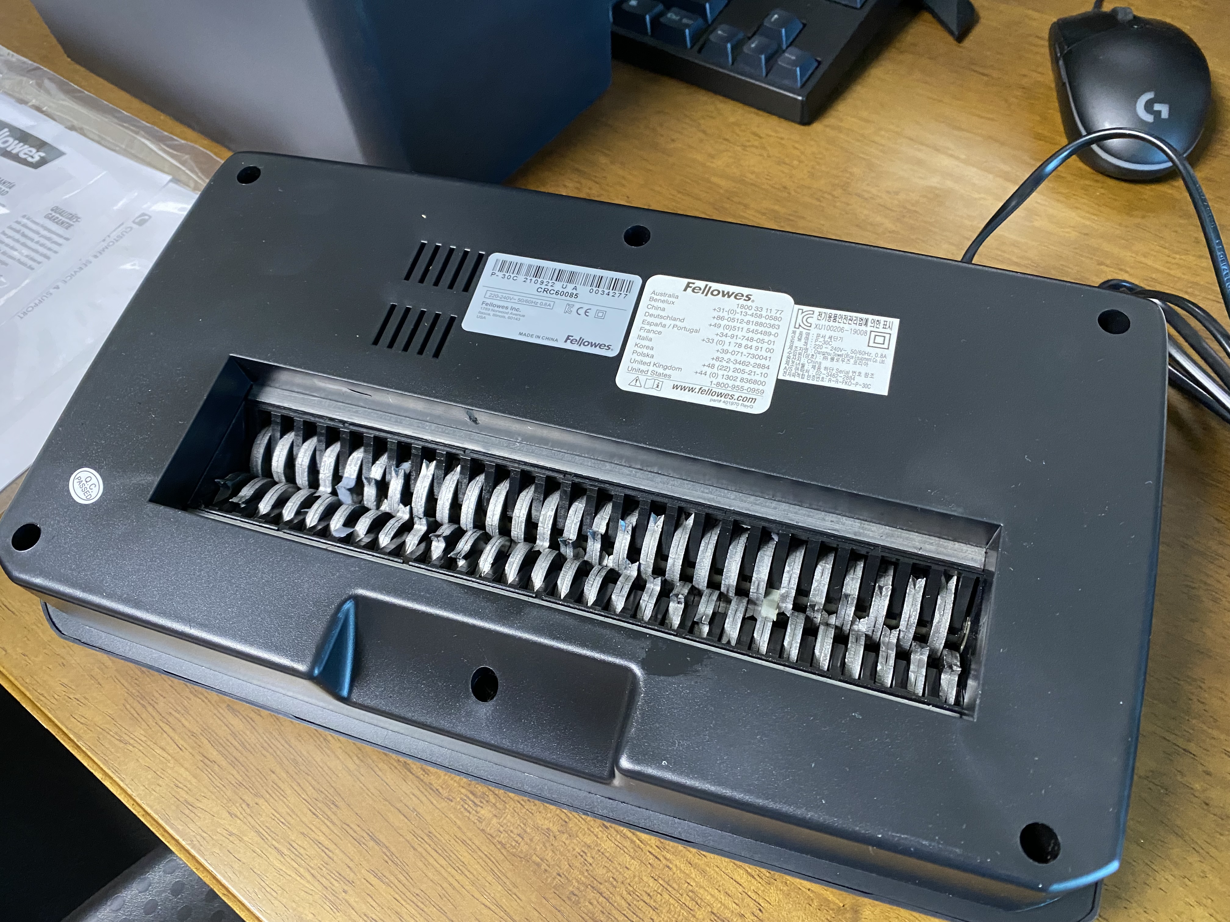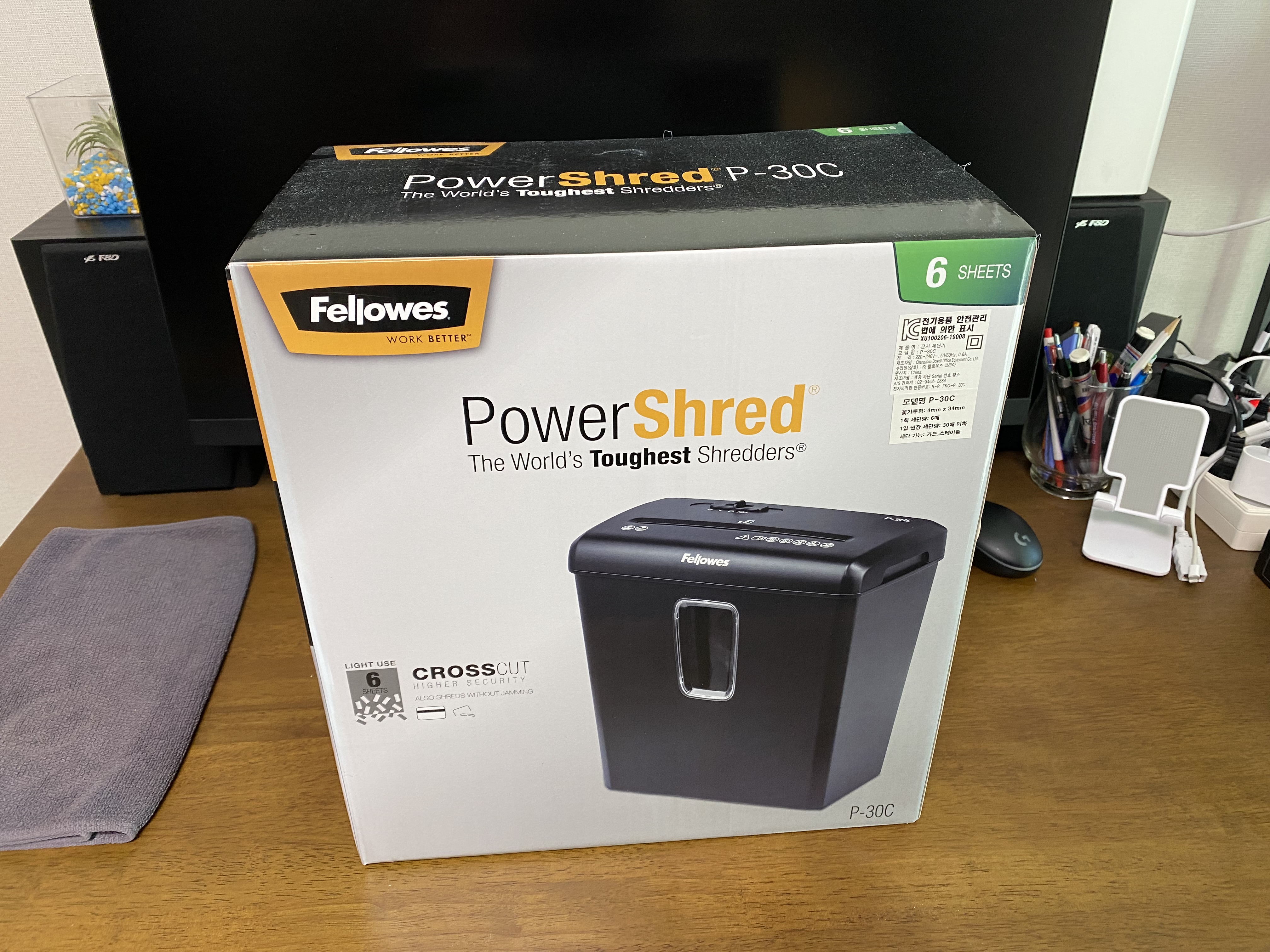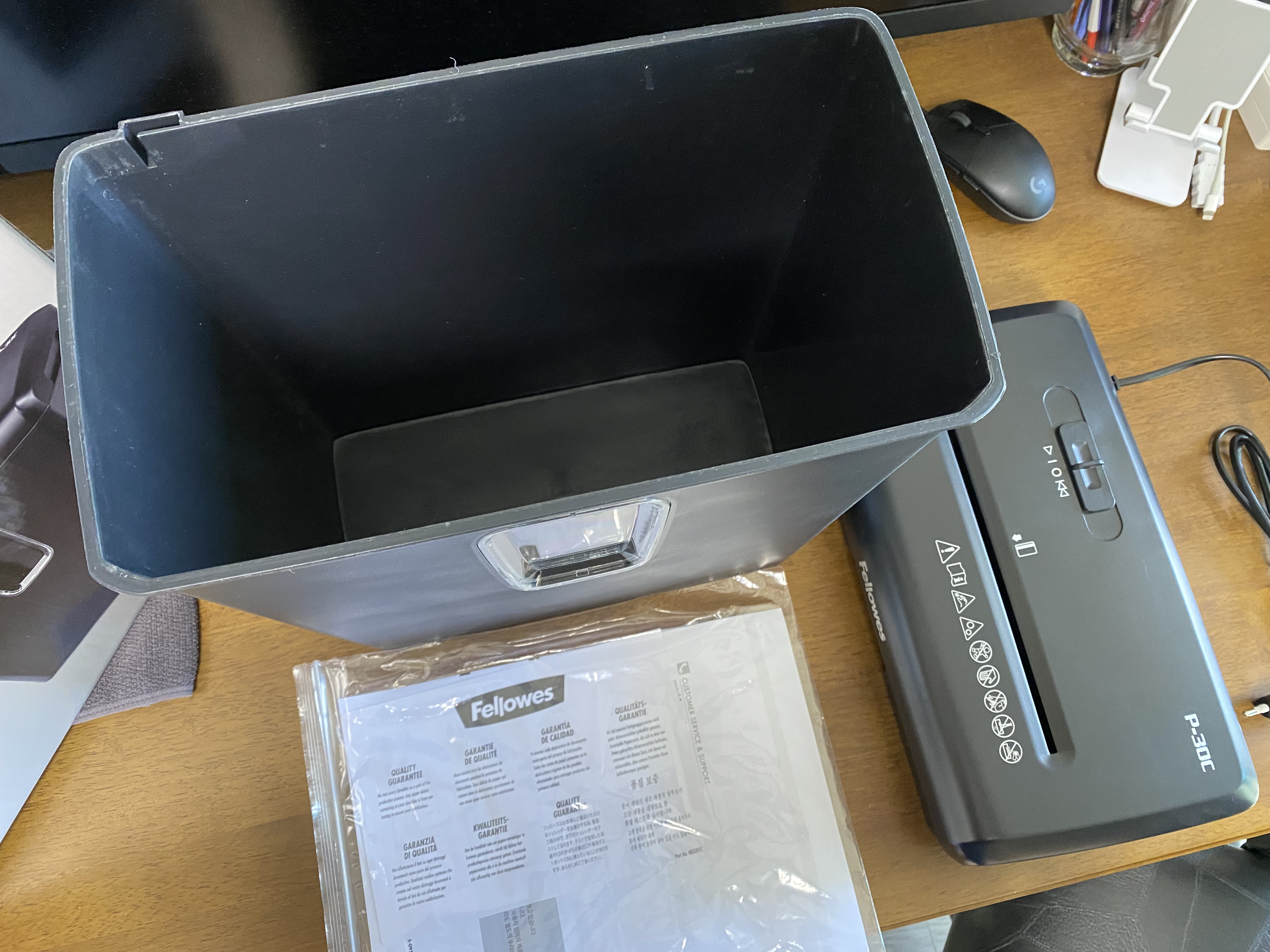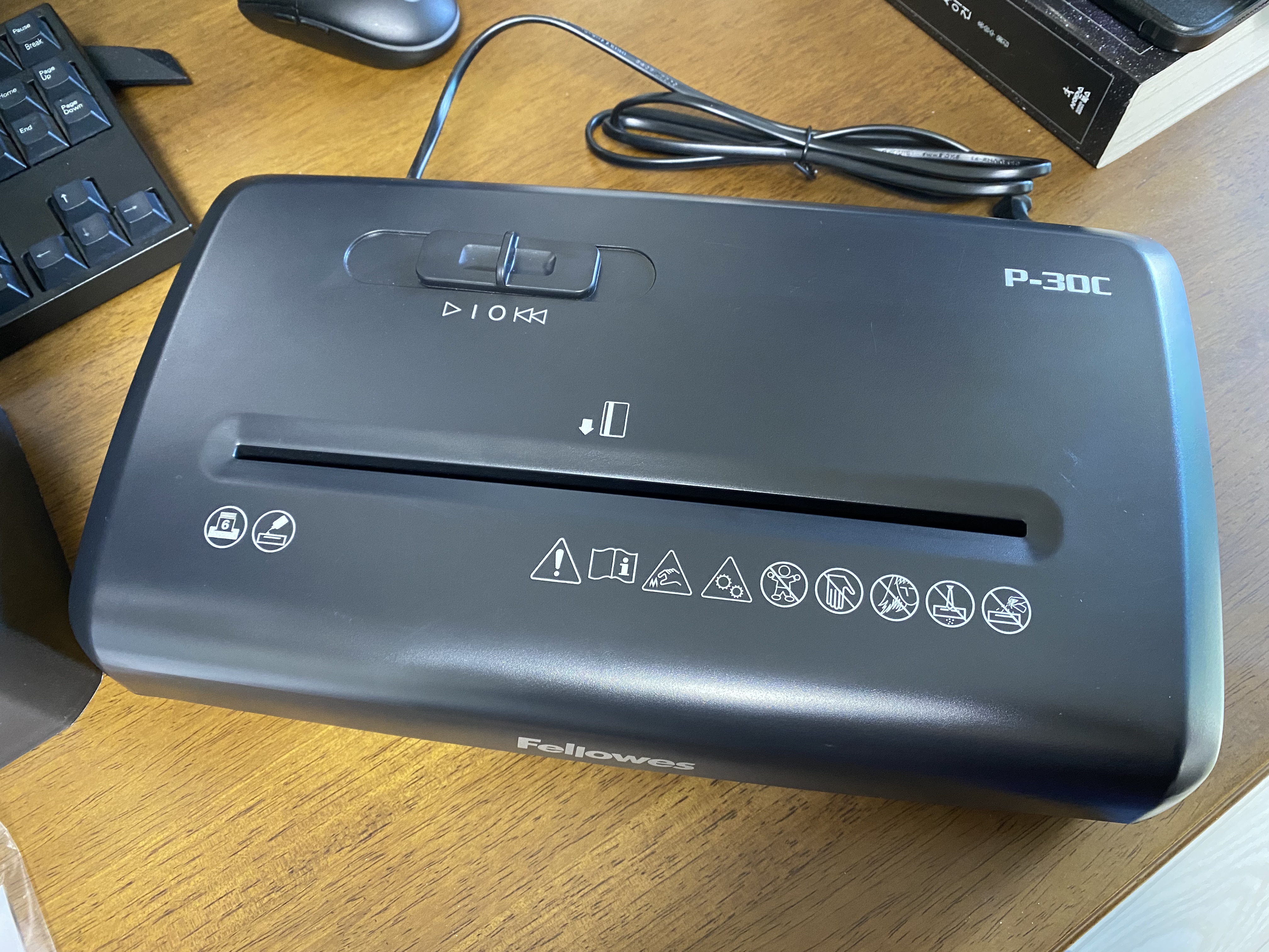 펠로우즈 문서세단기 (Fellowes Shredder) P-30C. 가정에서 소량만 쓸거라 구매를 망설였지만 사고 나서 정말 잘 쓰고 있습니다. 책상 밑에 두고 필요할 때마다 필요 없는 개인정보 문서를 갈아버리니 속이 시원하네요.