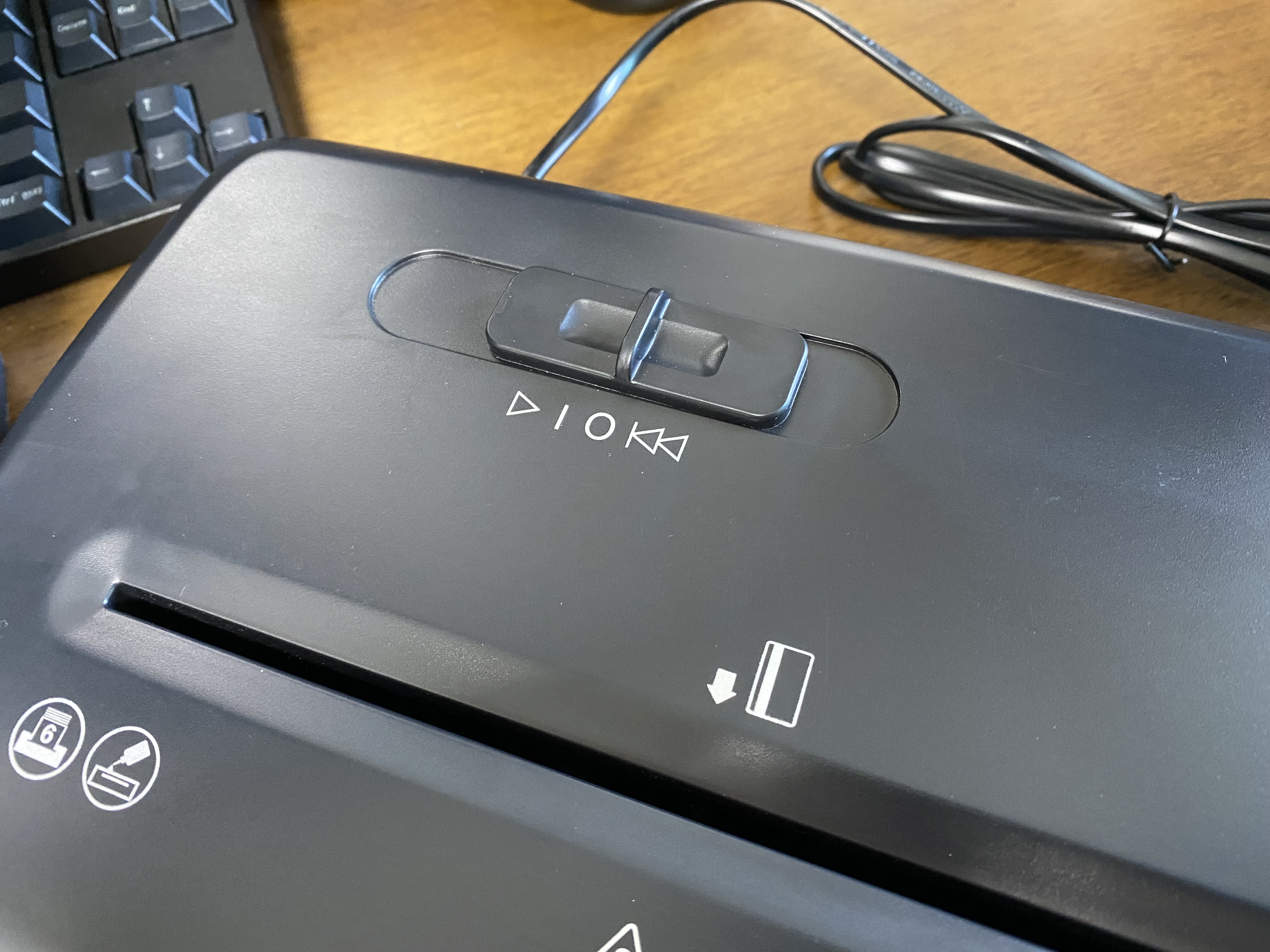 펠로우즈 문서세단기 P-30C 세단기 헤드입니다. 종이(또는 카드)가 들어가는 투입구, 컨트롤 스위치가 전부입니다. 나름 위험한 제품답게 경고 문구가 많이 인쇄된 것을 볼 수 있습니다.