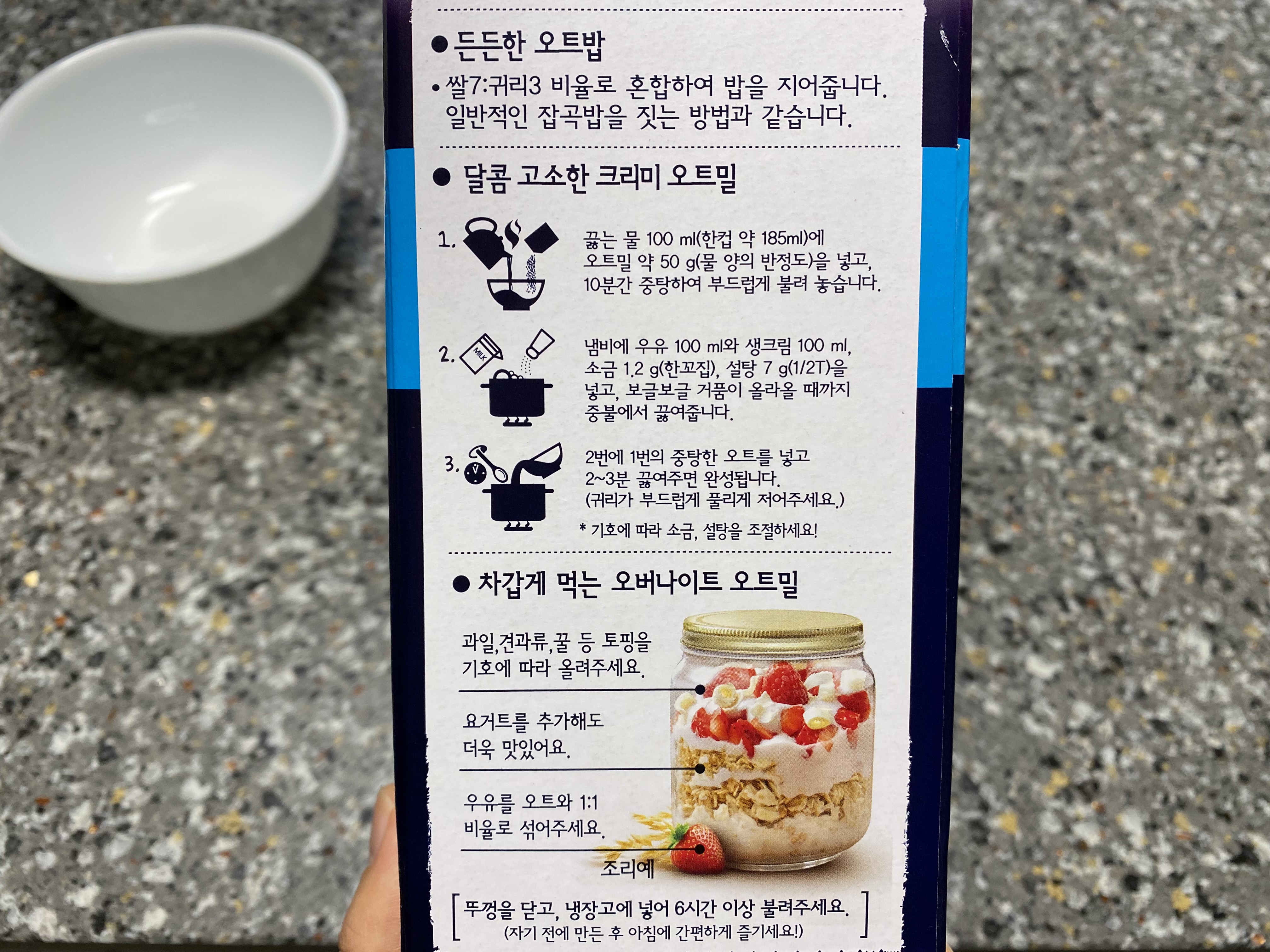 박스 측면을 보면 퀘이커 오트밀로 어떻게 요리를 해야 하는지 잘 설명되어 있습니다. 처음에는 시키는 대로 우유를 넣어 전통 오트밀을 만들어 먹어봤습니다. 참고로 저는 괜찮았는데 아이들은 싫어했습니다. 우유를 끓이는 것이 부담스러웠나 봅니다. 오트밀은 밥 대신 먹을 수 있는 제품이라 정말 다양하게 활용할 수 있을 것 같습니다.
