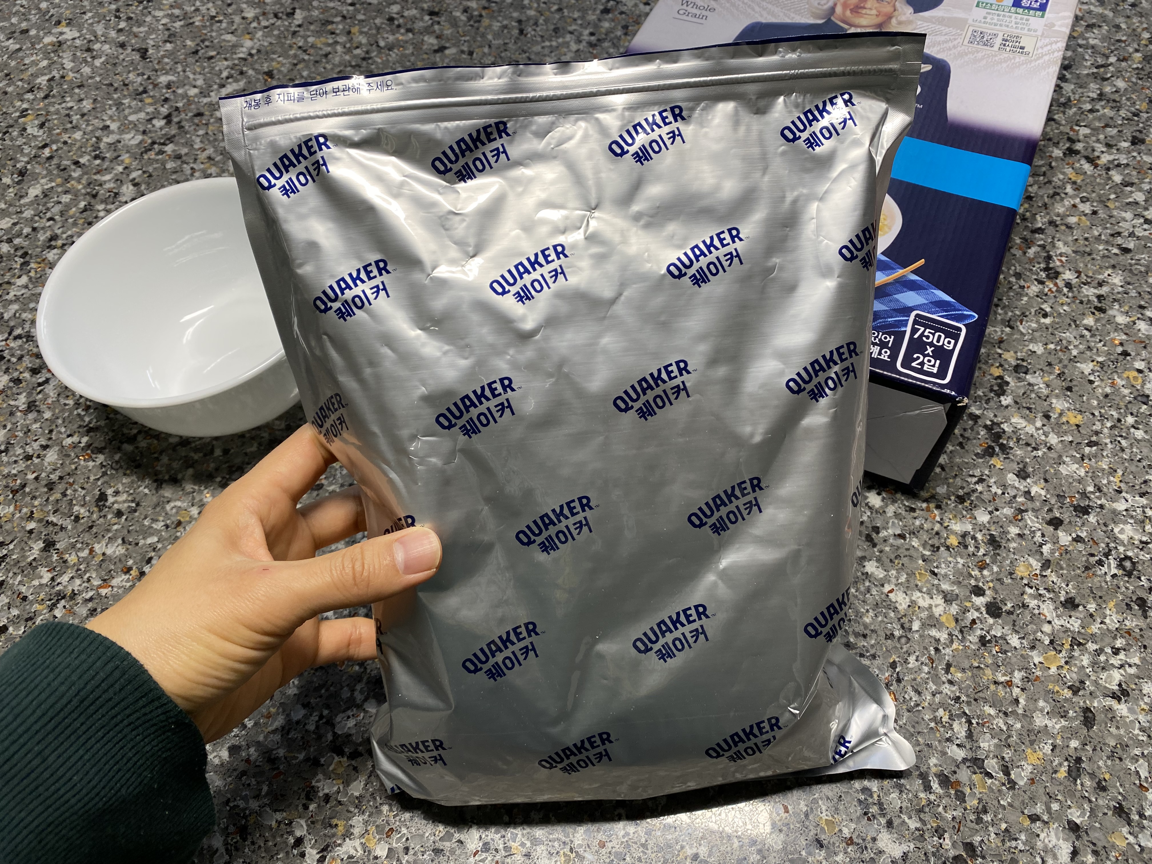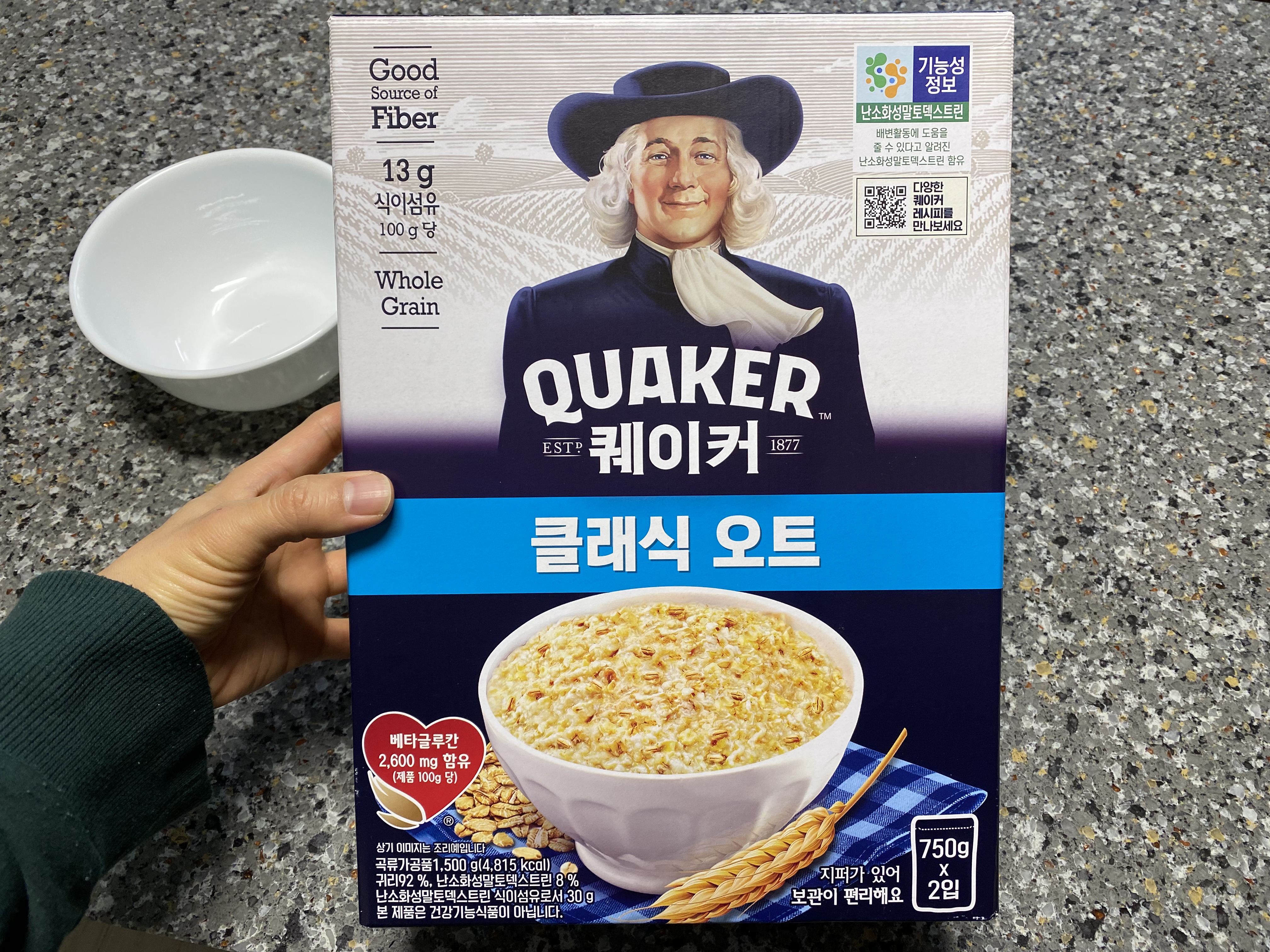 퀘이커 클래식 오트. 750g짜리 오트밀 2 봉지가 들어있습니다.