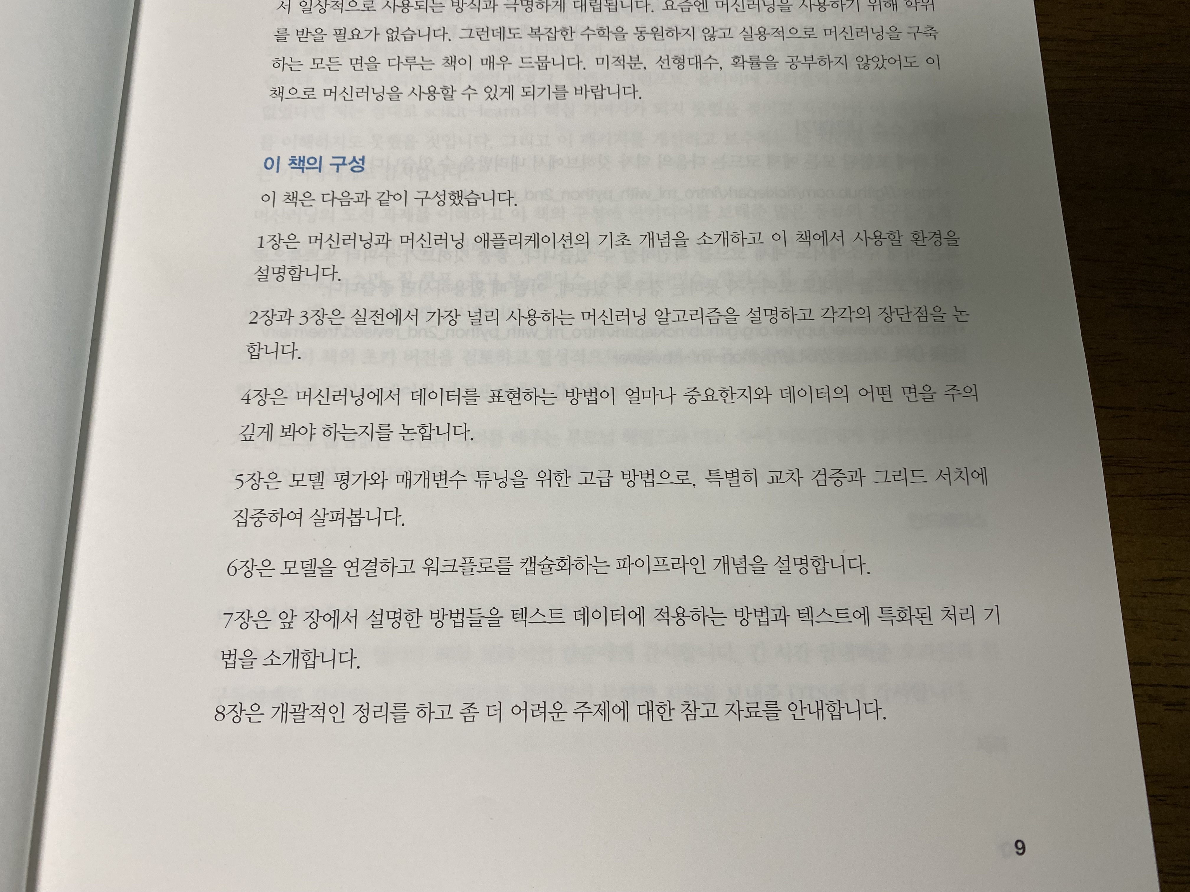 이 책은 총 8개의 장으로 되어 있습니다. 머신러닝을 소개하는 1장을 제외하고는 만만한 장이 없습니다. 2장부터는 직접 코드를 실행해보고 결과를 보면서 천천히 학습해야 합니다. 적어도 저는 그랬습니다. 그나마 다행인 것은 개발환경을 따로 세팅할 필요없이 구글 코랩(Google Colab)에서 쉽게 코드를 돌려볼 수 있습니다. 코랩을 사용하면 파이썬 개발 접근성이 좋아 회사에서도 짬짬이 공부를 할 수 있었습니다. 이 책은 사이킷런 뿐만 아니라 넘파이(numpy), 판다스(pandas), matplotlib 등 필요한 다양한 파이썬 라이브러리를 사용합니다. 자세한 책의 구성은 위 사진을 참고하세요.