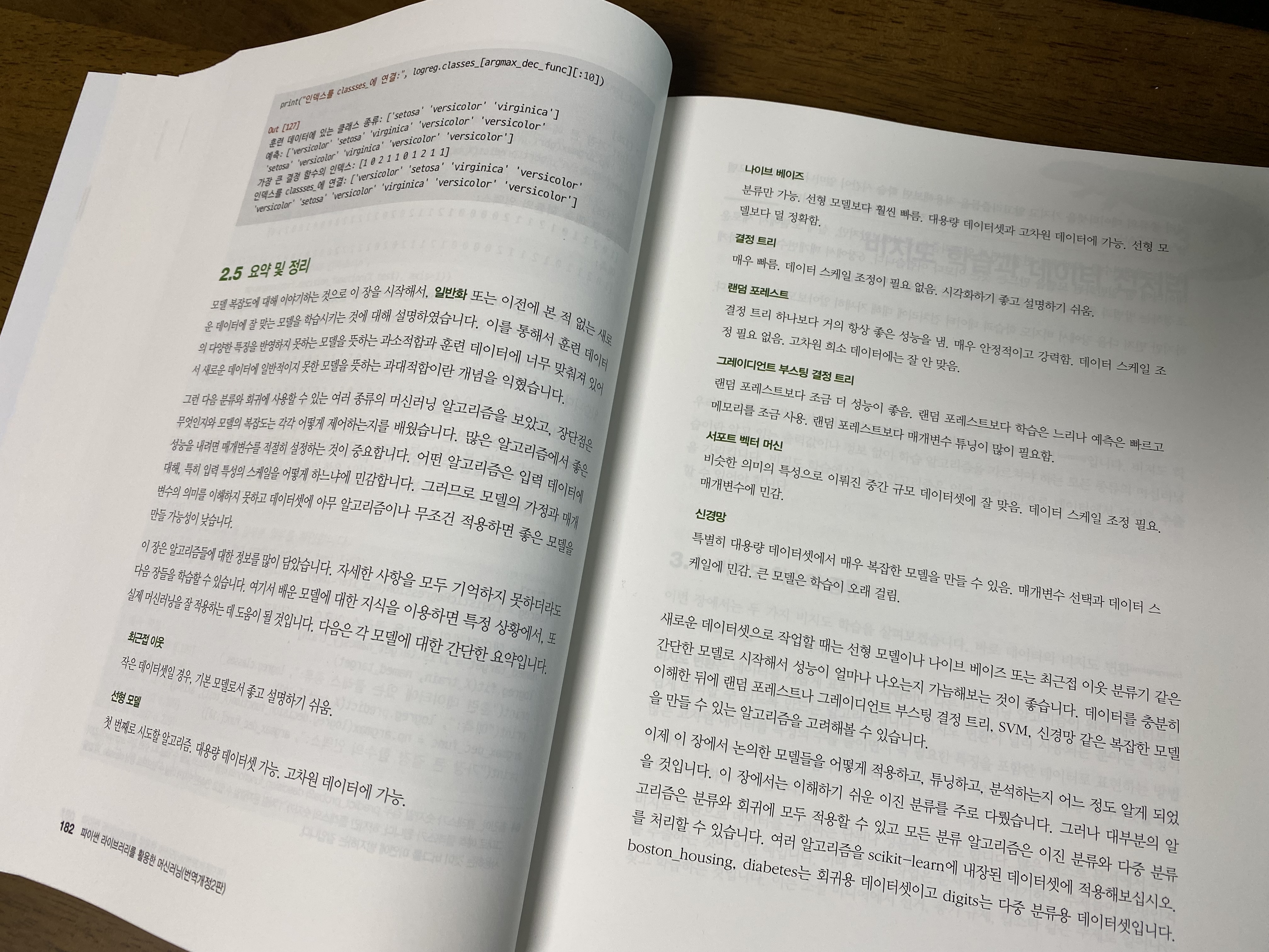 파이썬 코드를 입력해서 나오는 출력 결과를 책에서 사진으로 모두 확인할 수 있기 때문에 코드를 직접 돌리지않아도 책을 보는대는 지장없습니다. 물론 직접 입력하고 출력하는 것이 공부에 도움은 됩니다. 지금 필요한 머신러닝 알고리즘을 찾아서 빨리 나의 데이터에 적용해 보는 것이 이 책의 목적이라 생각합니다. 최근접 이웃, 선형 모델, 나이브 베이츠, 결정 트리, 랜덤 포레스트, 그레이디언트 부스팅 결정 트리, 서포트 벡터 머신, 신경망 등 다양한 모델을 이 책에서 다루고 있습니다.