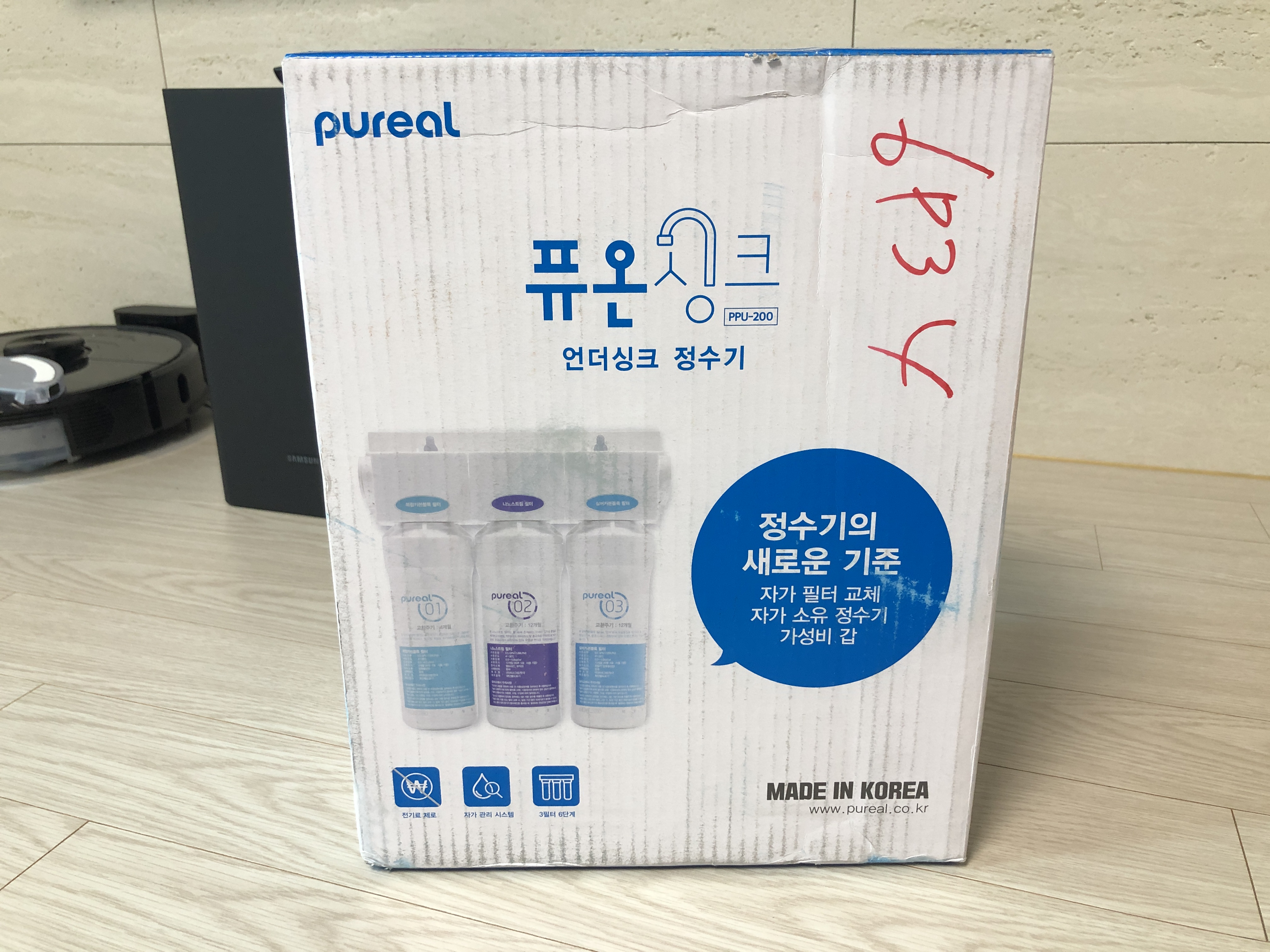 피코그램 퓨리얼 언더싱크 정수기 PPU-200. 필터를 설치(교체)하고 물을 5분 정도 흘려보낸 뒤 정수기를 사용하면 됩니다. 제가 직접 설치한 정수기라 그런지 물맛이 더 좋은 것 같습니다. 자가 설치 정수기라 물맛이 없을 거란 걱정은 안 해도 될 것 같습니다. 싱크대 위쪽에 구멍을 뚫고 조리수밸브(수도꼭지) 설치만 가능하다면 정수기 설치는 일도 아닙니다. 한번 도전해보세요. 저는 매우 만족합니다.