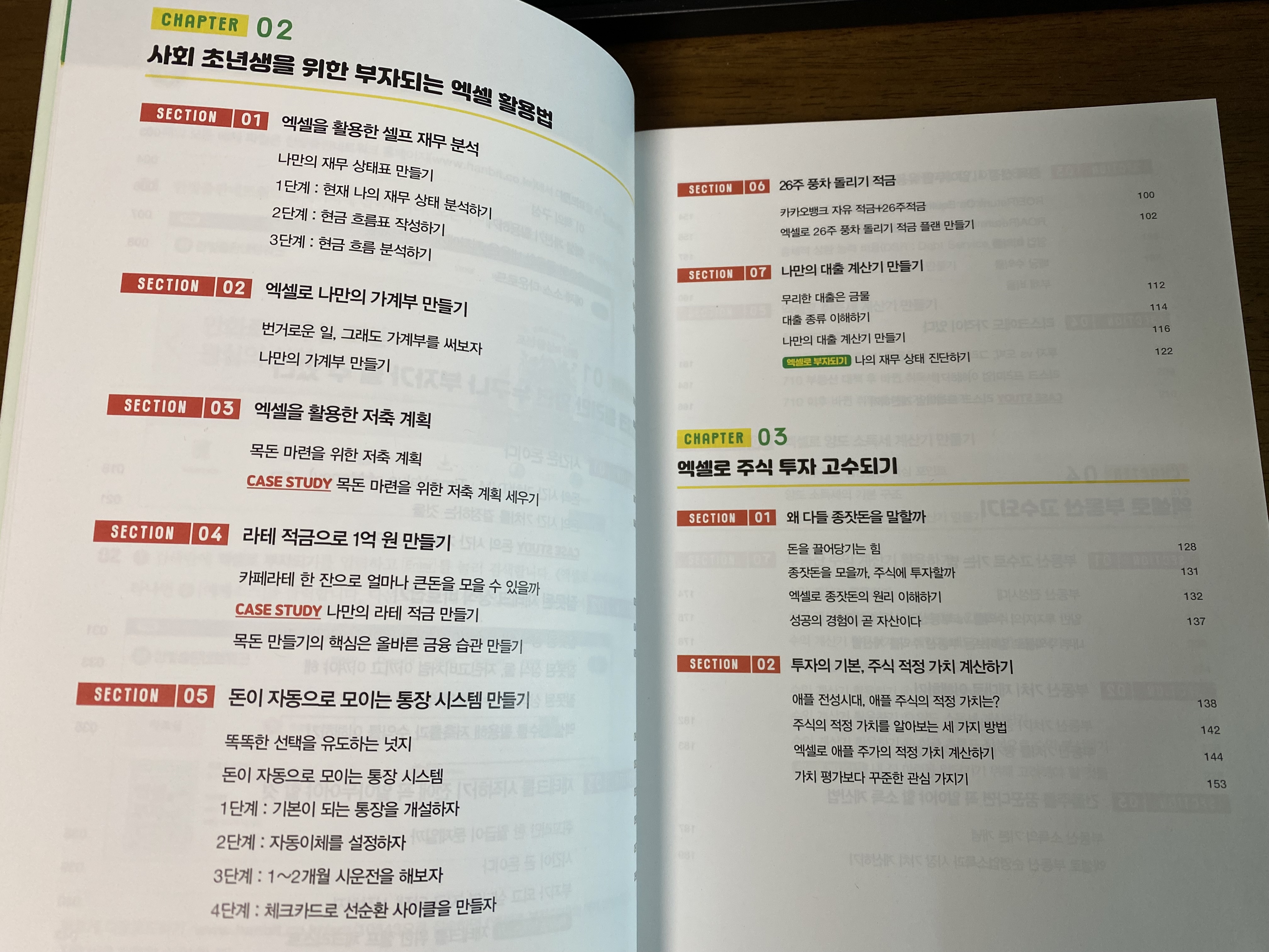 생각보다 재테크 내용이 풍부합니다. 재테크를 모르는 사람에게는 장점이지만 재테크를 잘 아는 사람이 엑셀을 배우기 위해 샀다면 다소 아쉬울 수도 있습니다.