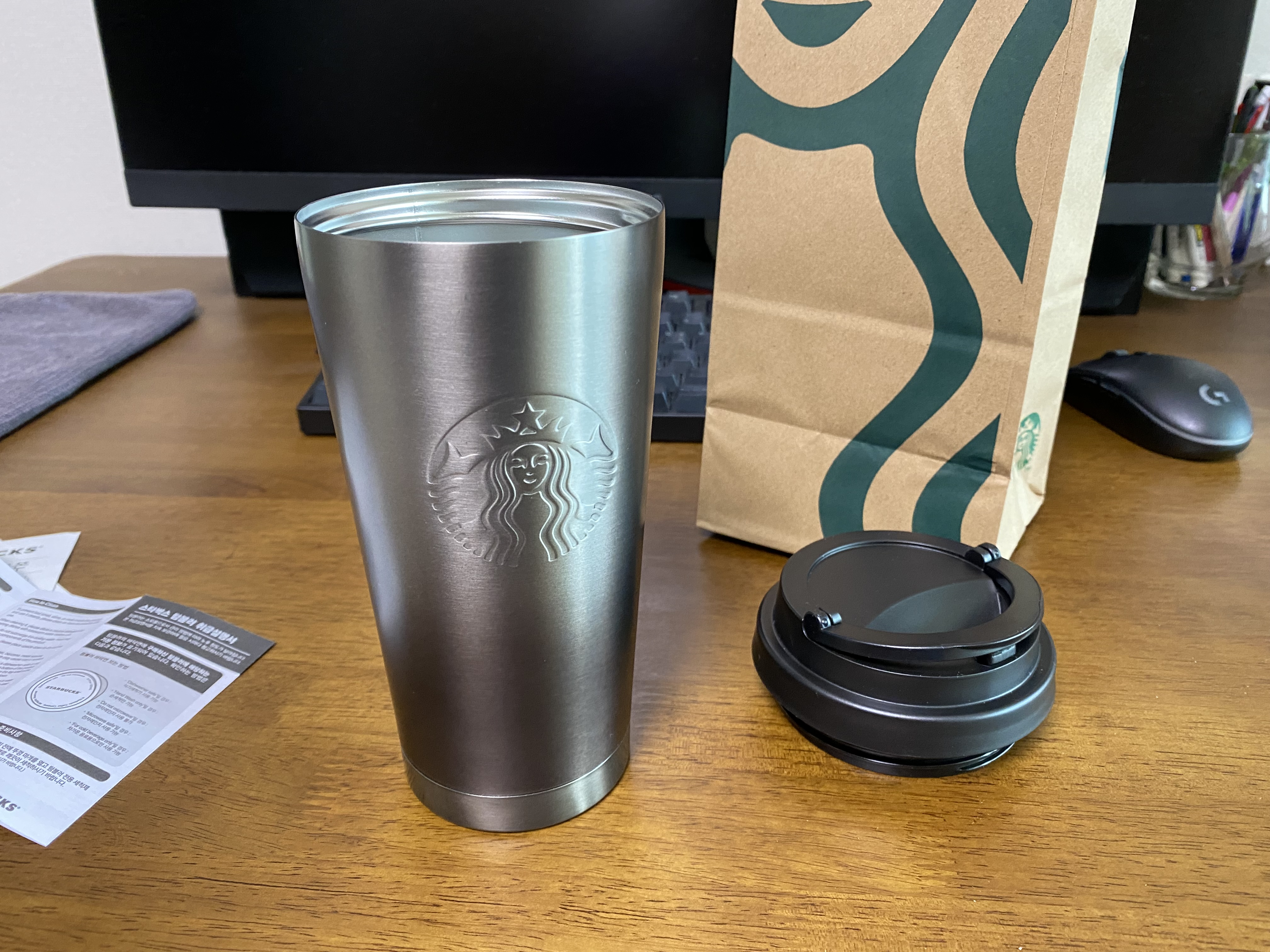 텀블러 속을 보면 텀블러 음료 쿠폰, 상품 교환증, 설명서가 들어있습니다. 텀블러 음료 쿠폰은 사이즈 상관없이 스타벅스에서 먹고 싶은 음료를 마실 수 있습니다. 만약 사자마자 텀블러에 하자가 있다면 상품 교환증으로 다른 걸로 교환이 가능합니다. 교환은 상품 구매일로부터 2주 안에 해야 합니다.