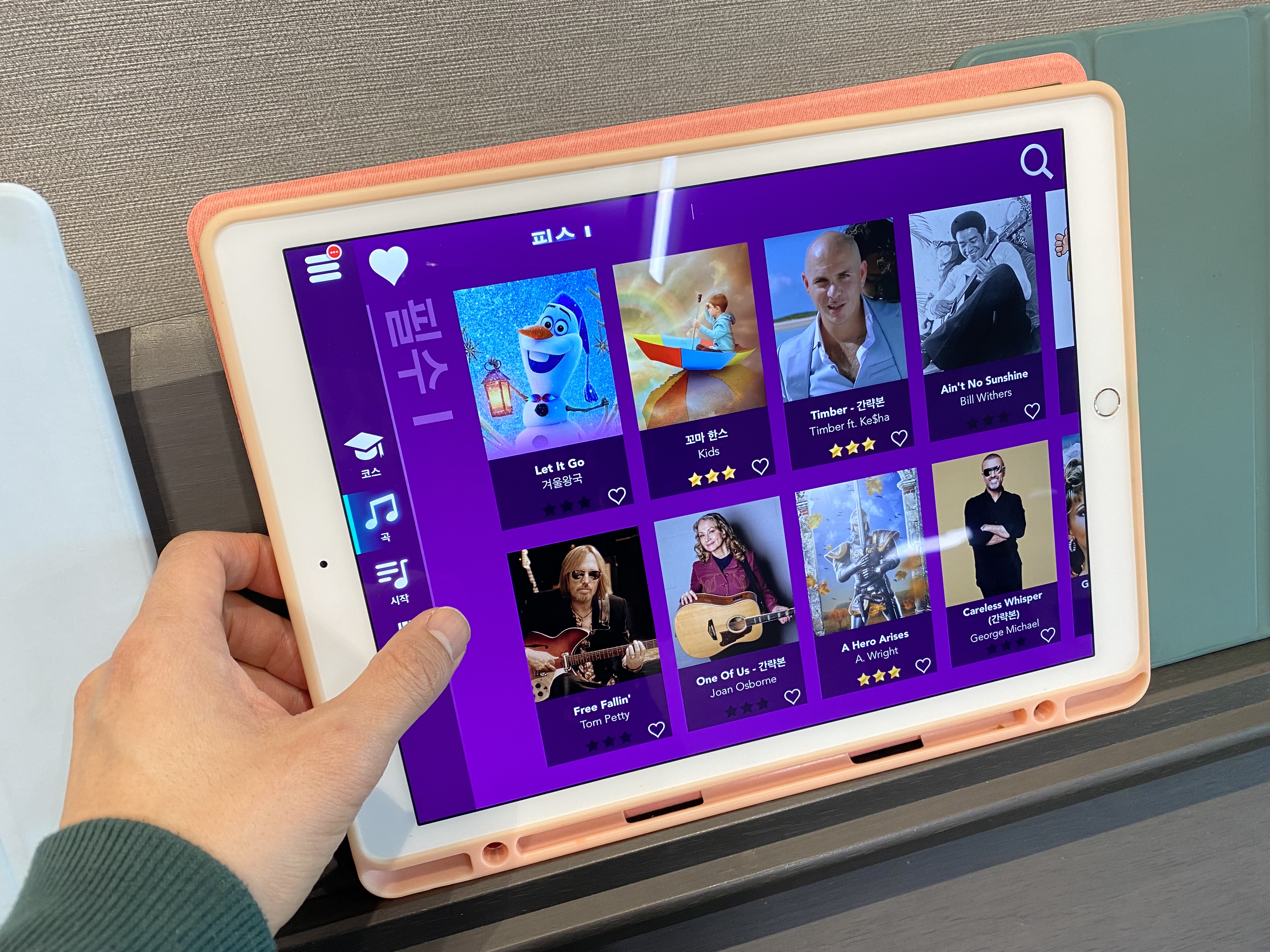 피아노를 배우는 코스 말고도 곡을 연주해보는 부분도 있습니다. 나름 신곡이 많아서 흥미를 끌기에는 괜찮은 것 같습니다. 가끔 아이들이 게임처럼 별 3개를 받기위해 노력하고 있는 걸 보면 나름 뿌듯합니다.