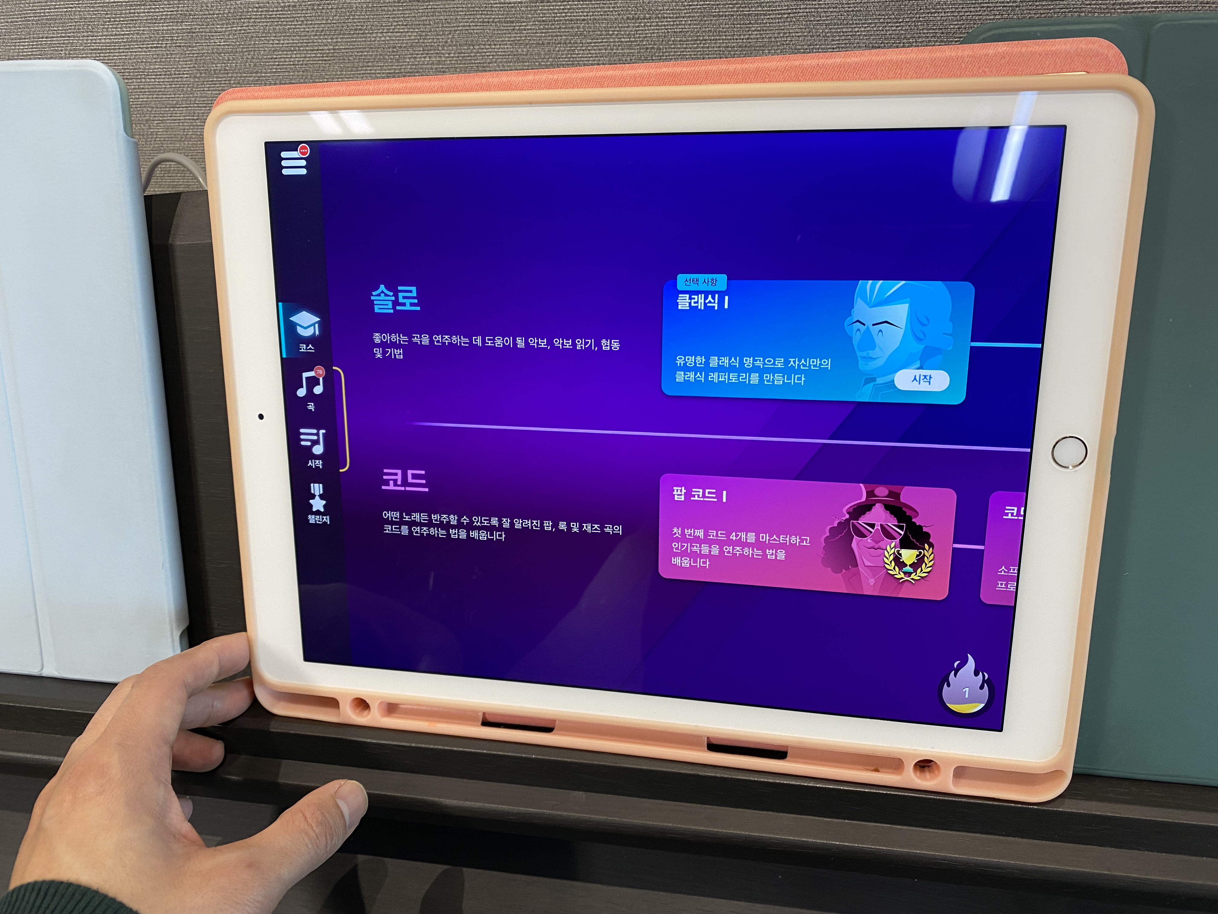 피아노 레슨은 솔로, 코드로 구분되며 솔로는 일반 피아노 레슨이라고 생각하면 되고, 코드는 반주를 하는 방법을 배웁니다. 처음에 아주 기초적인 부분만 한글 음성이 지원되고 조금만 뒤로가면 영어 음성에 자막이 나오는 구조입니다. 이게 정말 별로네요. 아이들이 흥미를 잃어버리기 딱입니다. 한글 음성이 완벽하게 지원되면 정말 좋을 것 같습니다.