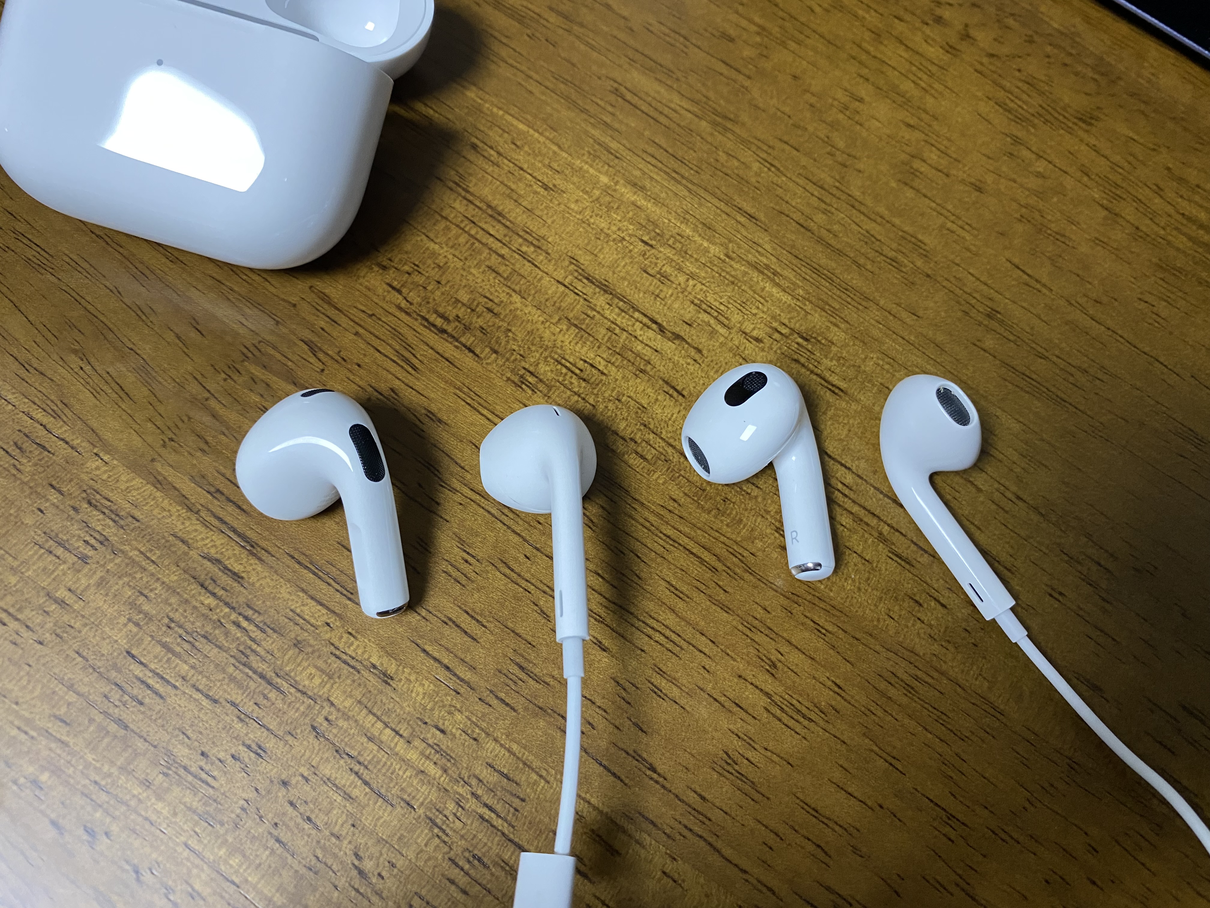 애플 유선 이어폰과 비교한 사진입니다. 확실히 무선이 기능이 많아서일까 뚱뚱한 것을 볼 수 있습니다. 제 주변에는 귀가 작아서 에어팟 3세대를 쓰고 싶어도 못쓰는 경우도 있습니다. 귓속이 많이 작다면 사기 전에 다른 사람 에어팟을 꼭 착용해보세요. 보통의 경우에는 큰 문제없이 사용 가능합니다. 저는 오래 쓰다 보면 이어폰을 착용하고 있다는 사실도 까먹을 정도로 착용감이 좋았습니다.