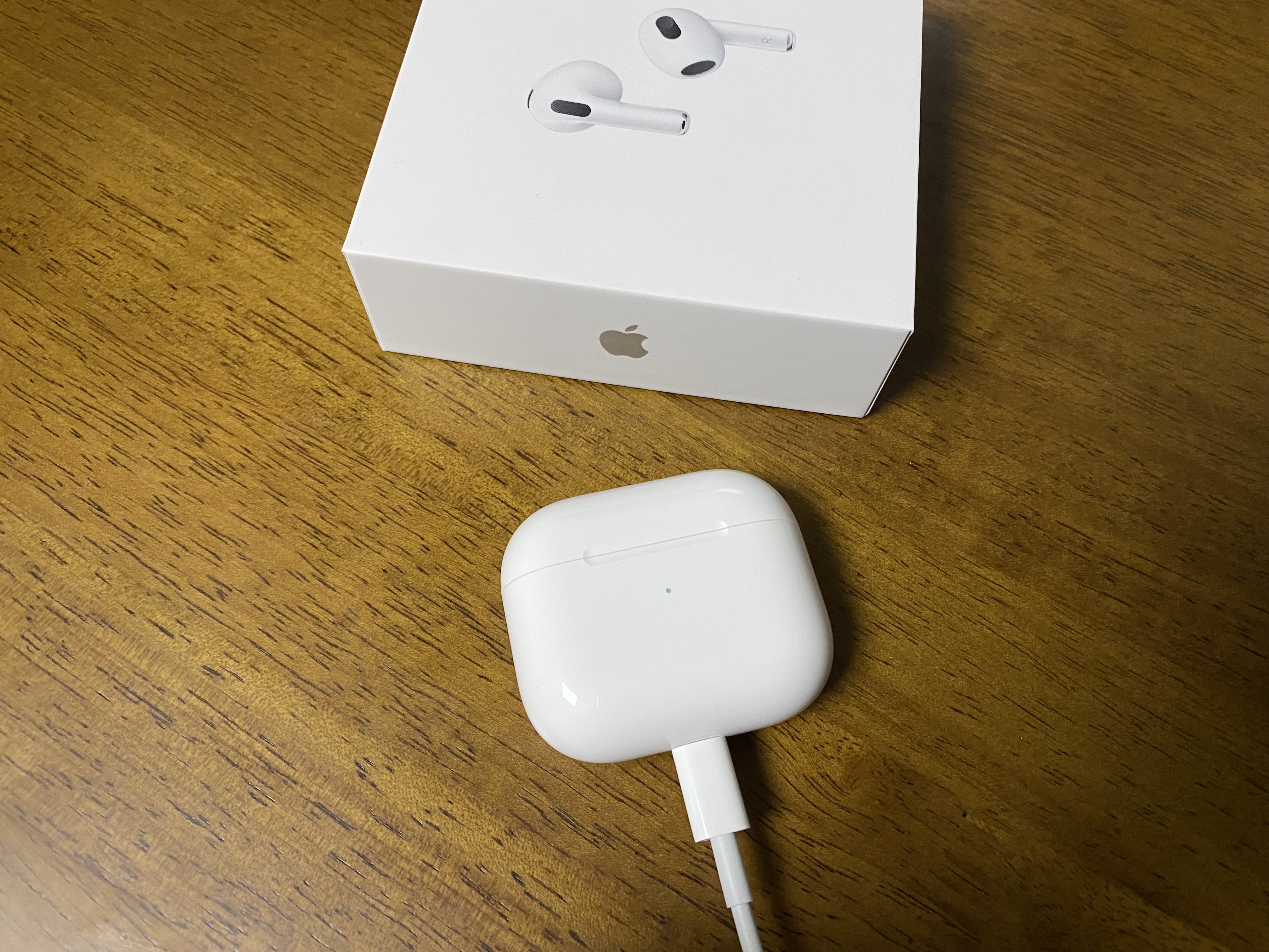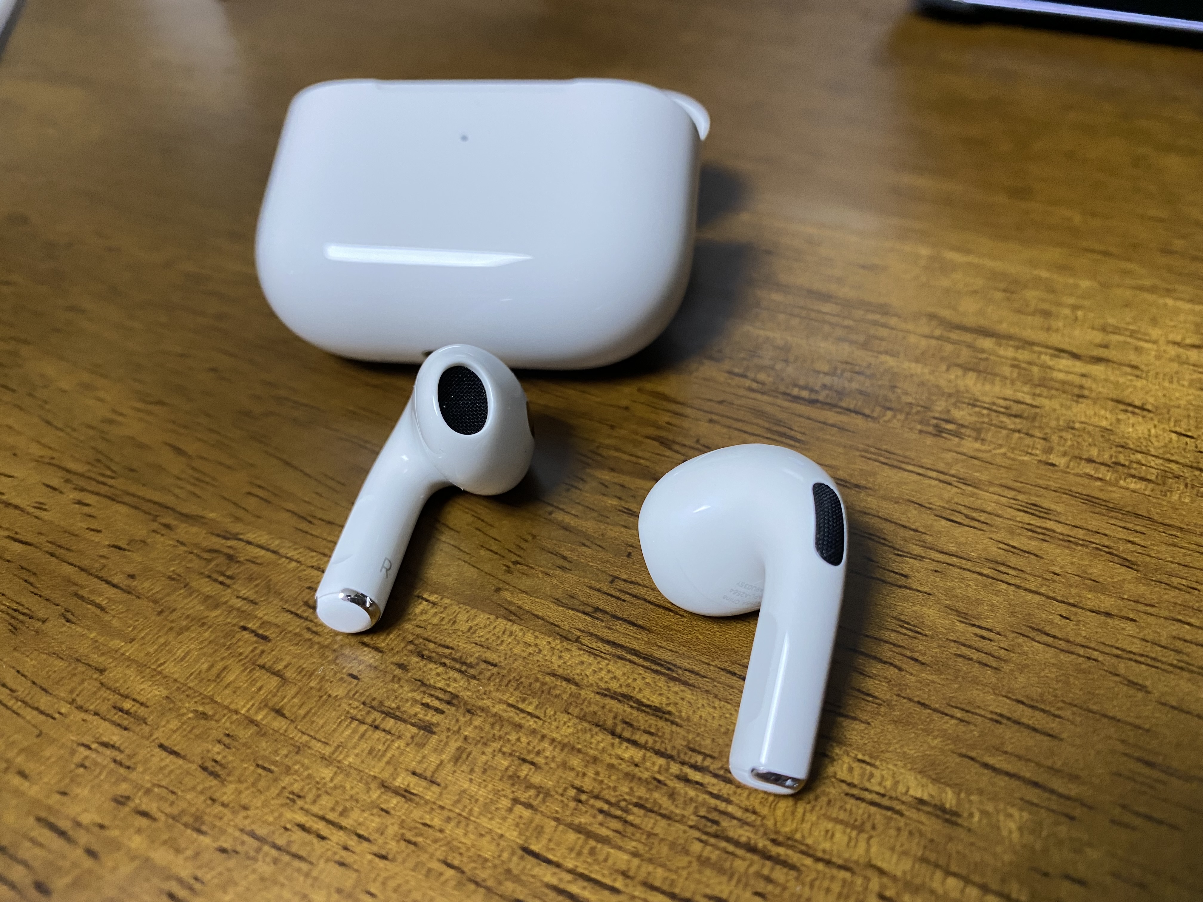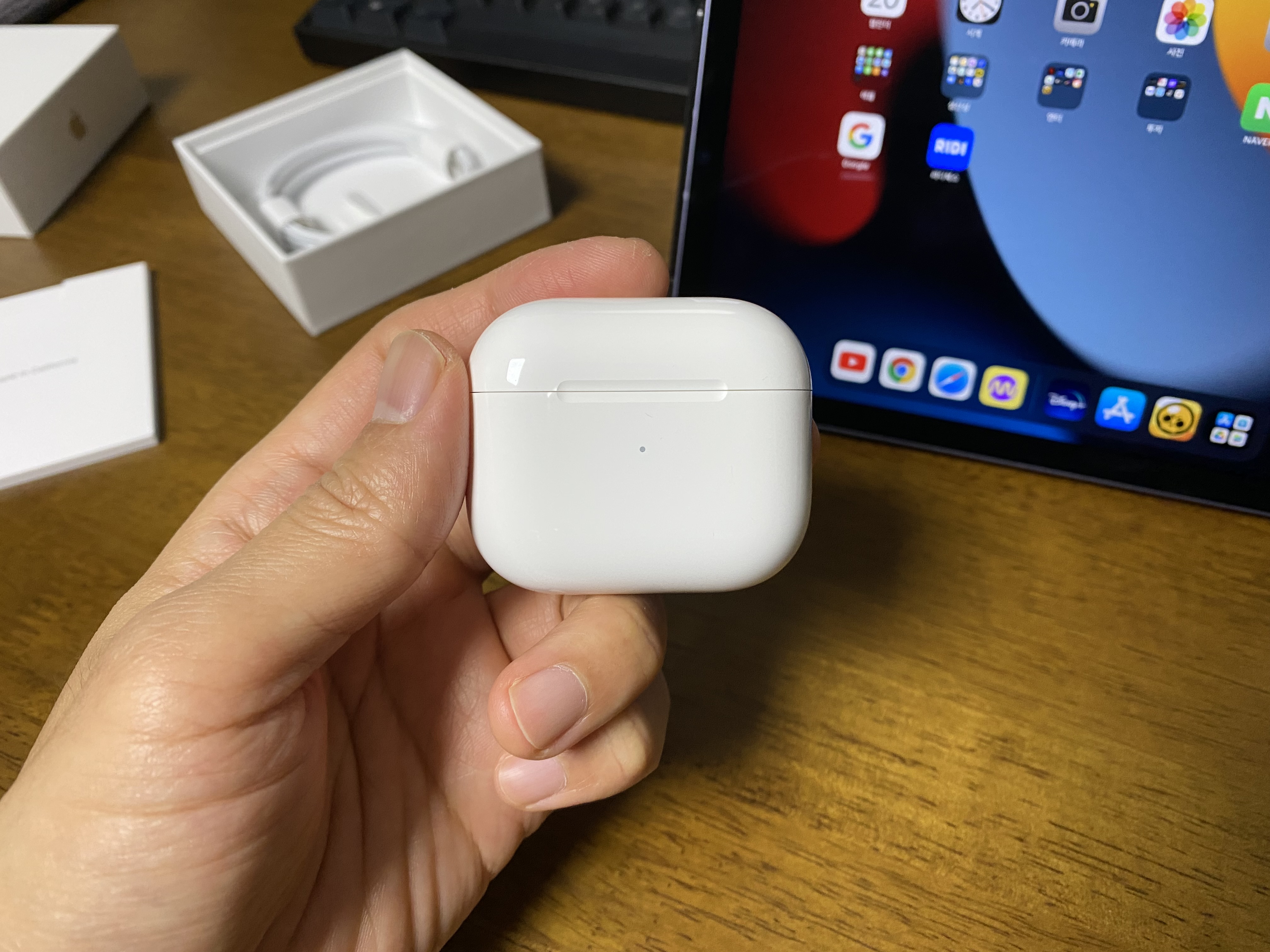 이것이 바로 애플 에어팟 3세대입니다. 앞부분에 작은 LED가 보입니다.
