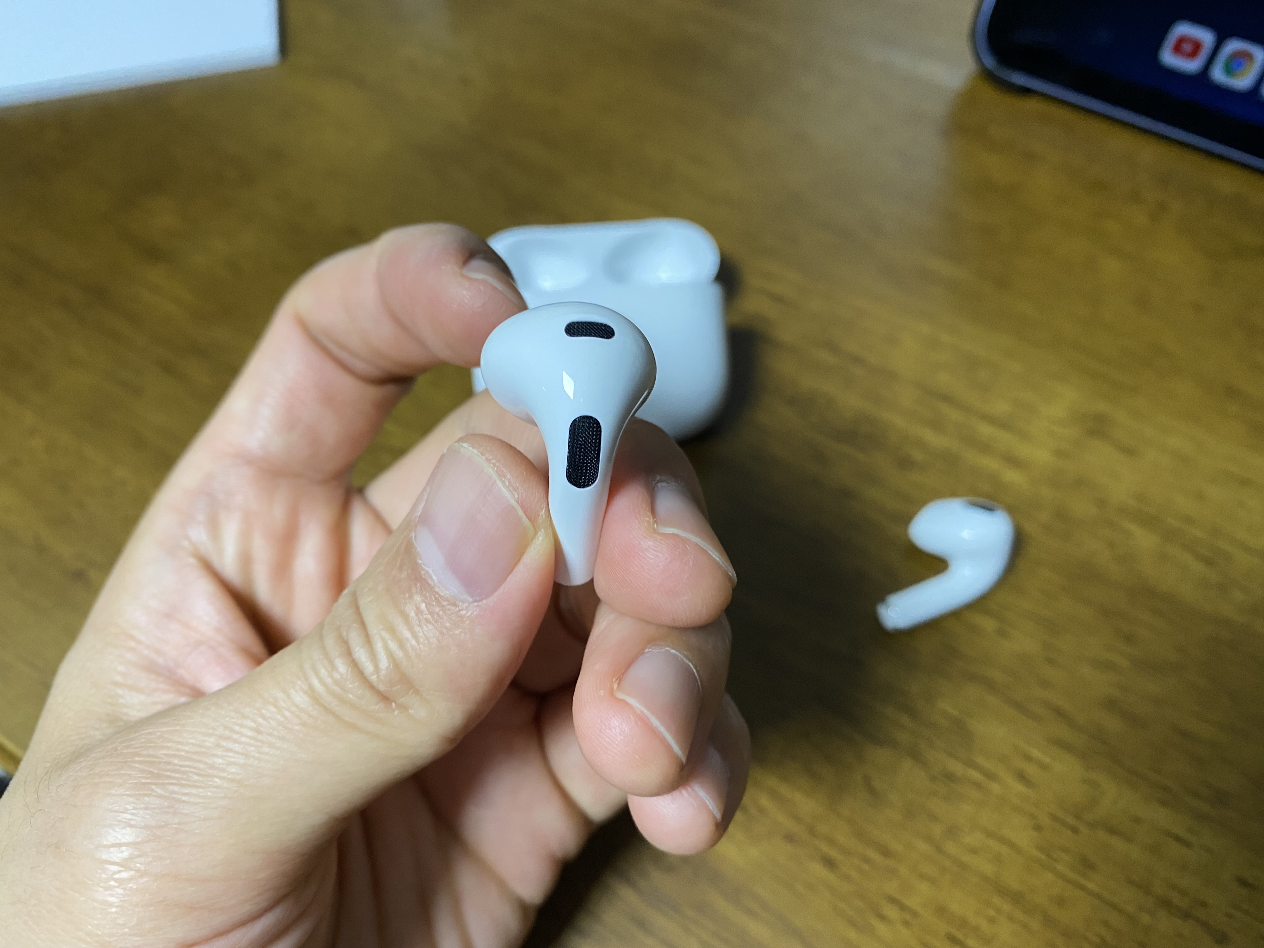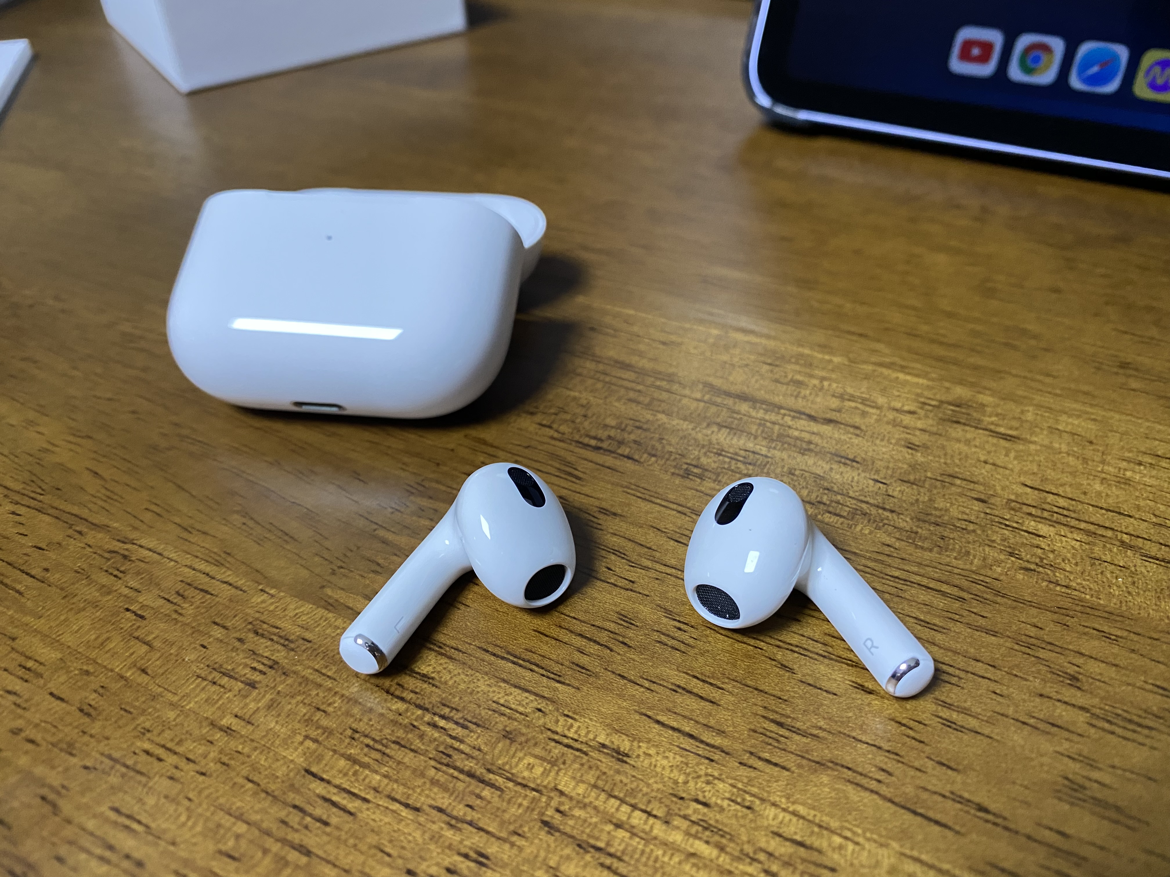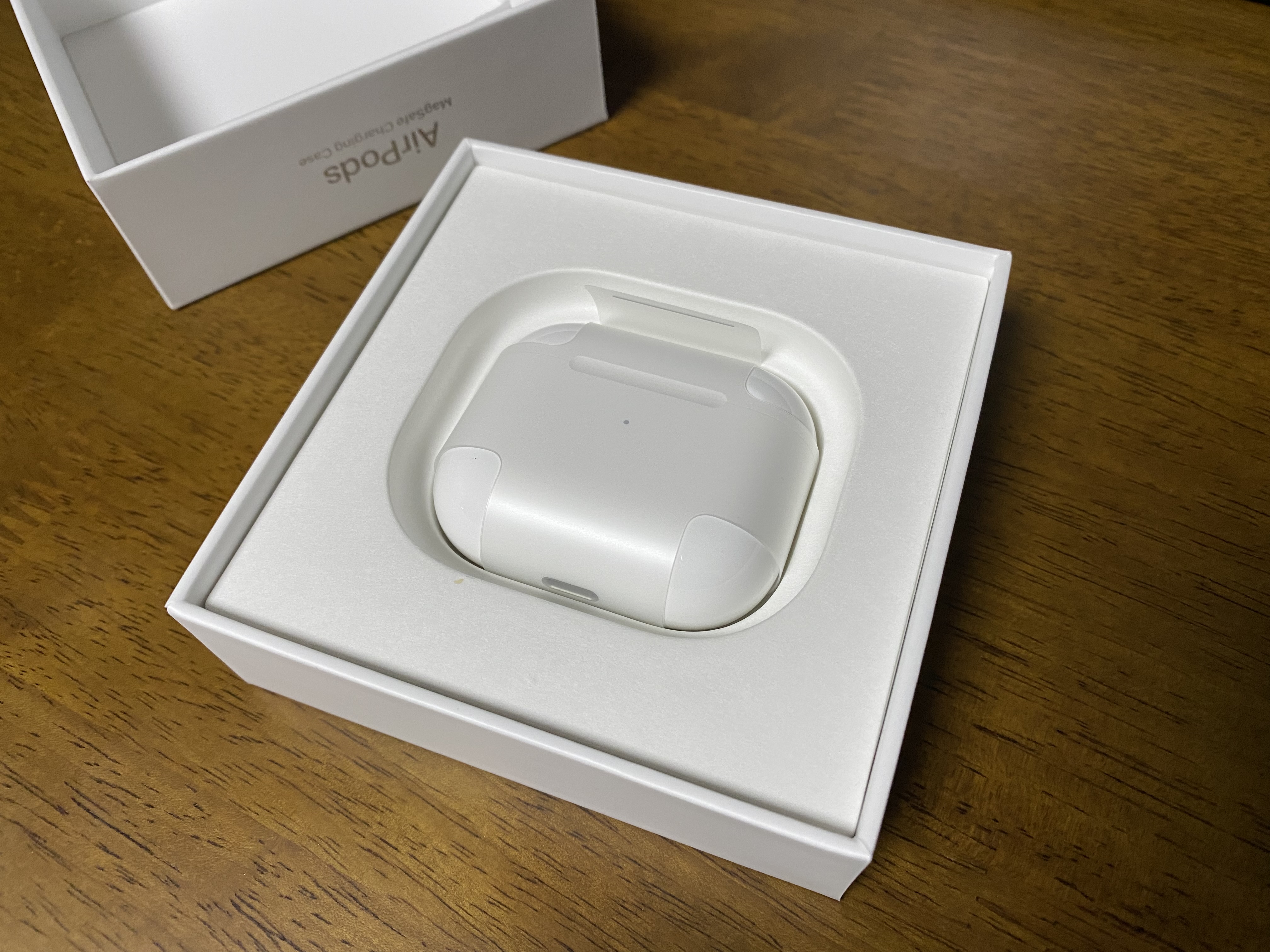 이것이 바로 애플 에어팟 3세대입니다. 앞부분에 작은 LED가 보입니다.