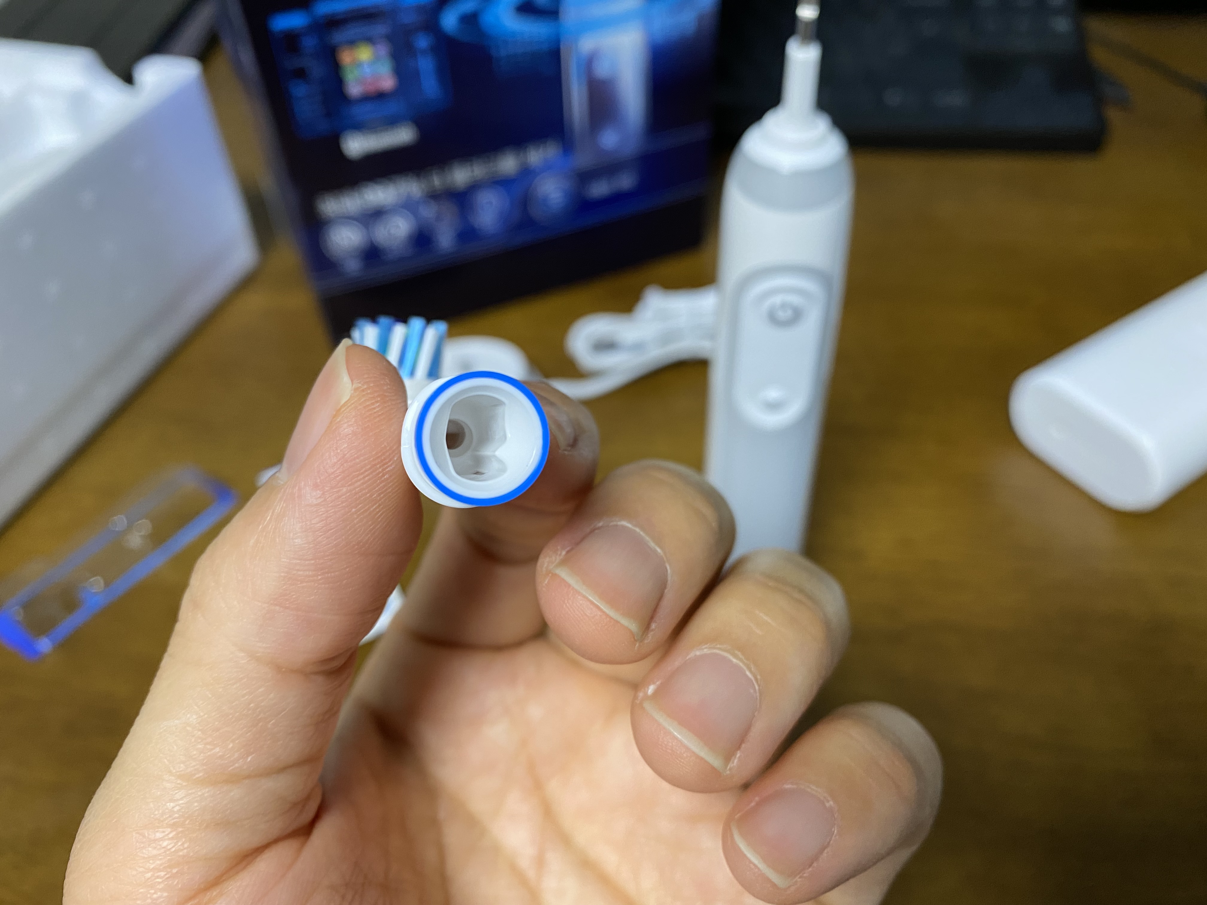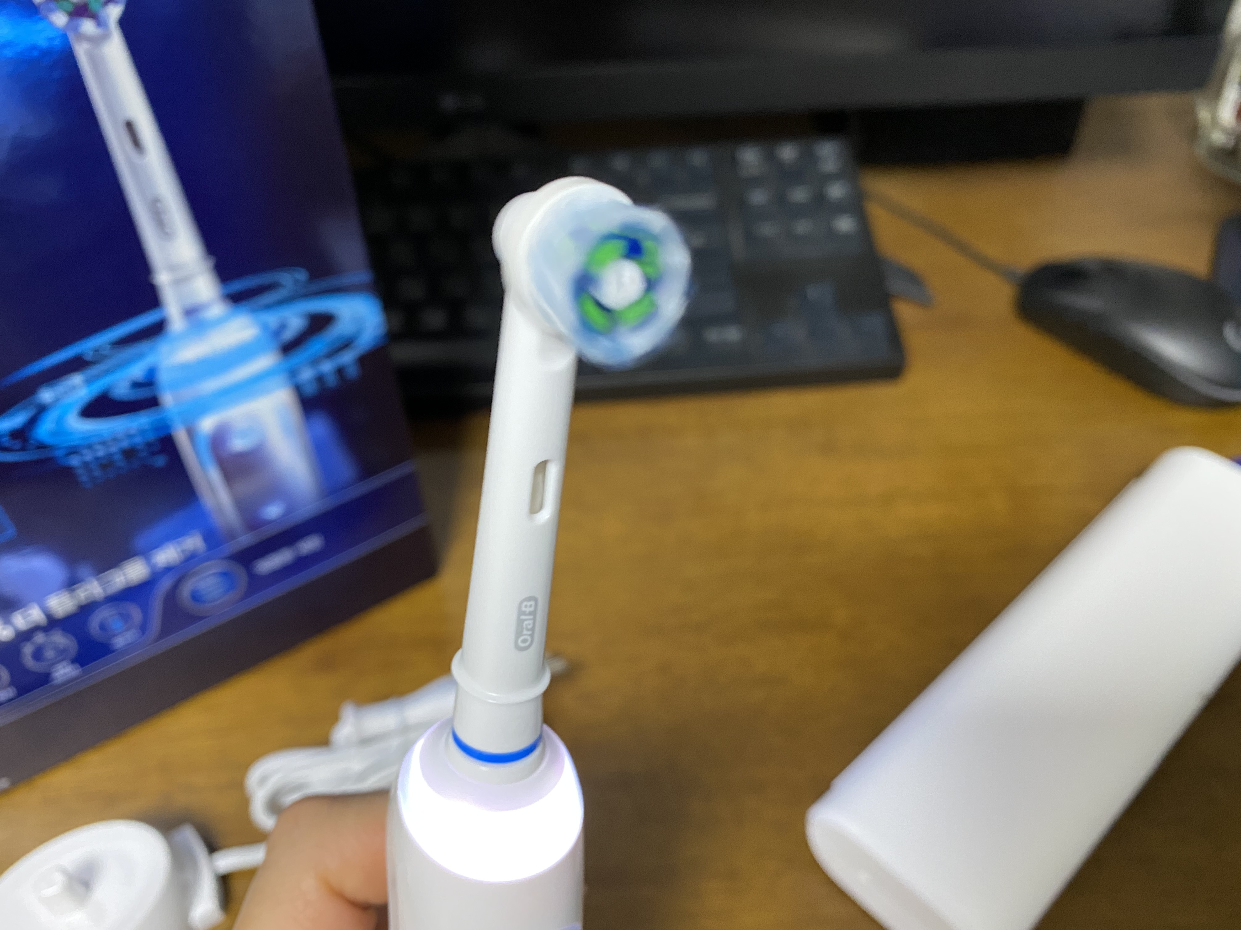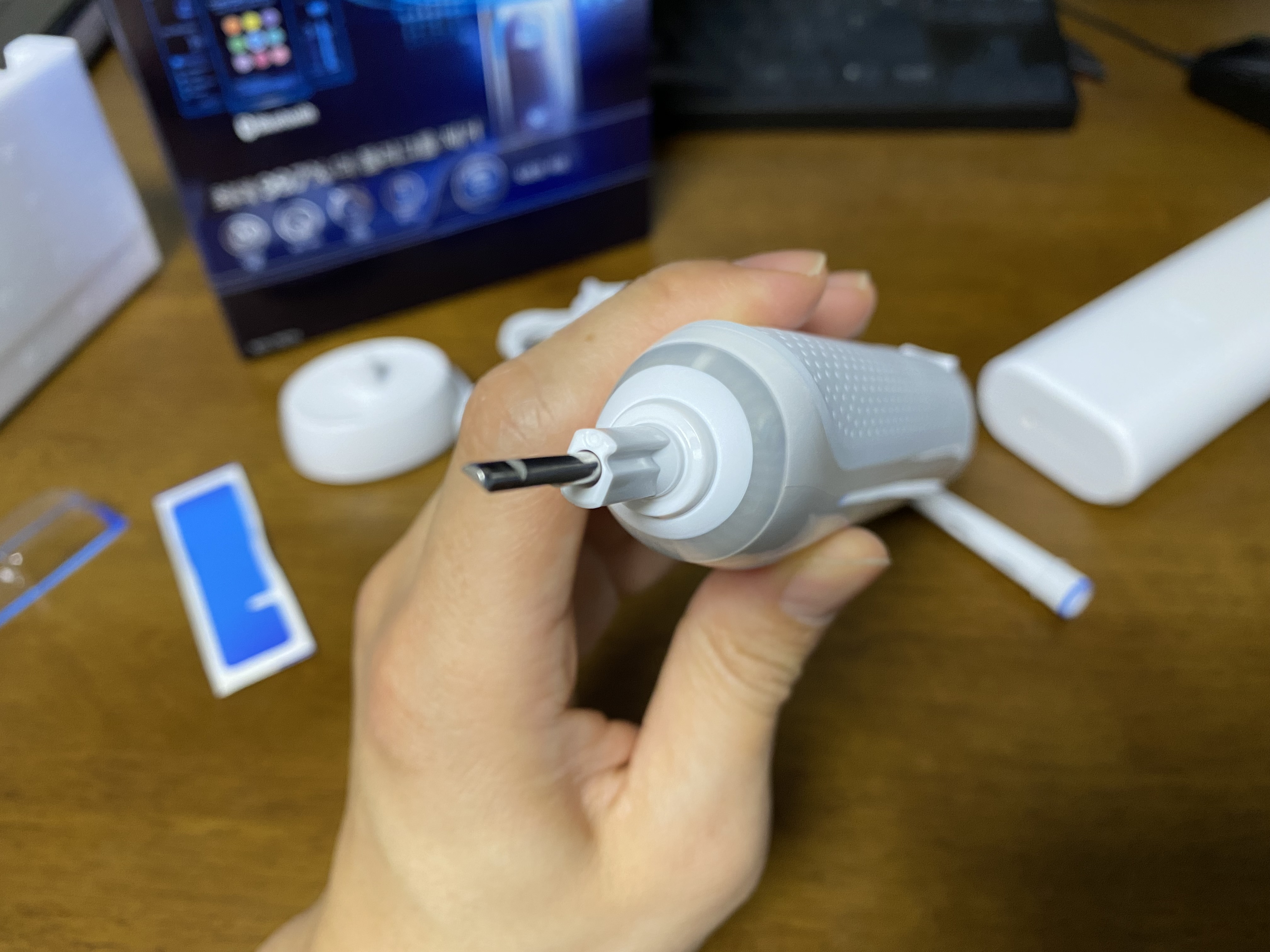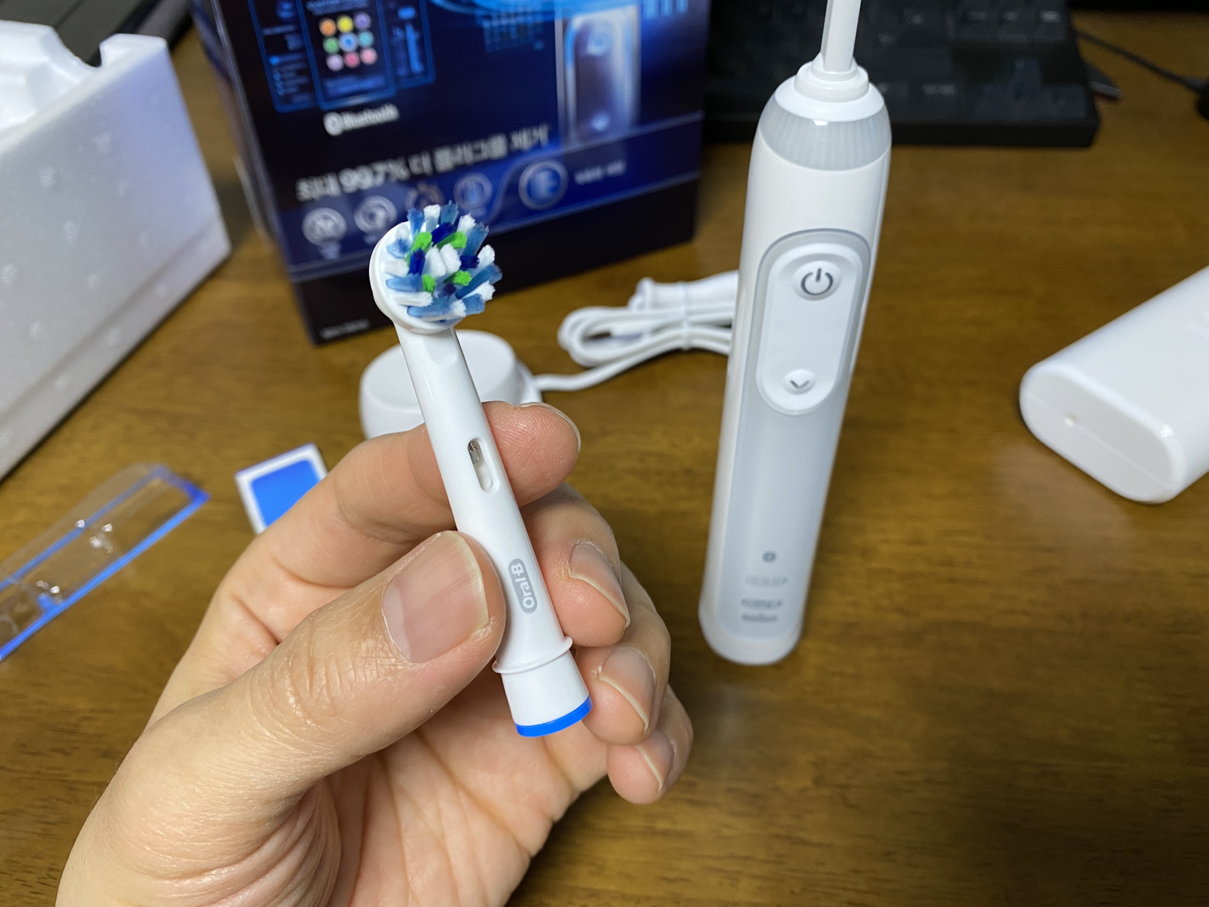 전동칫솔 핸들에 칫솔모를 장착한 모습.