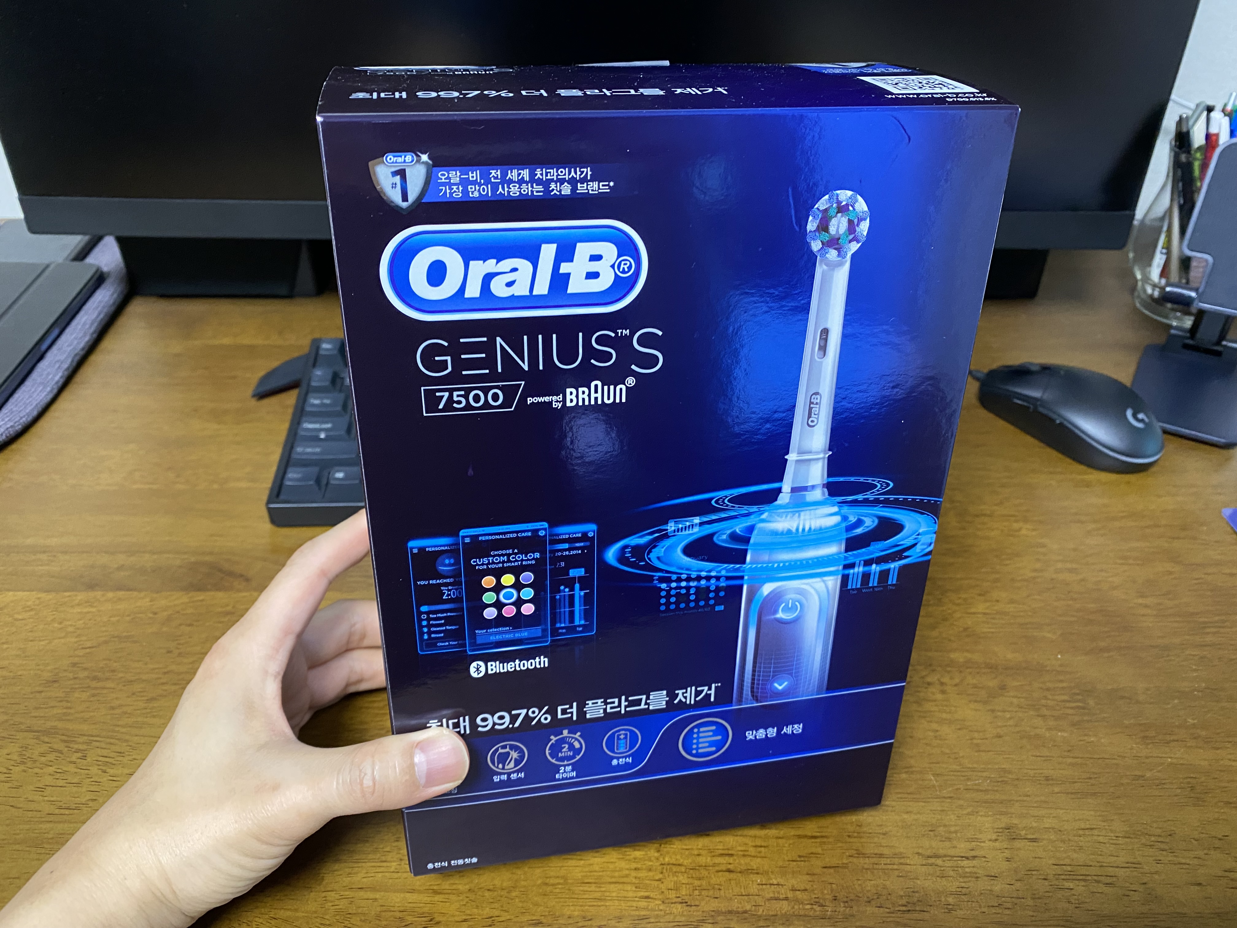 이게 바로 'ORAL-B 오랄비 전동칫솔 GENIUS S7500'입니다. 오랄비 전동칫솔이 다른 제품에 비해 좀 비싼 편인데 이 제품은 그중에서도 조금 더 비싼 제품입니다. 참고로 이것보다 더 비싼 제품도 있습니다.