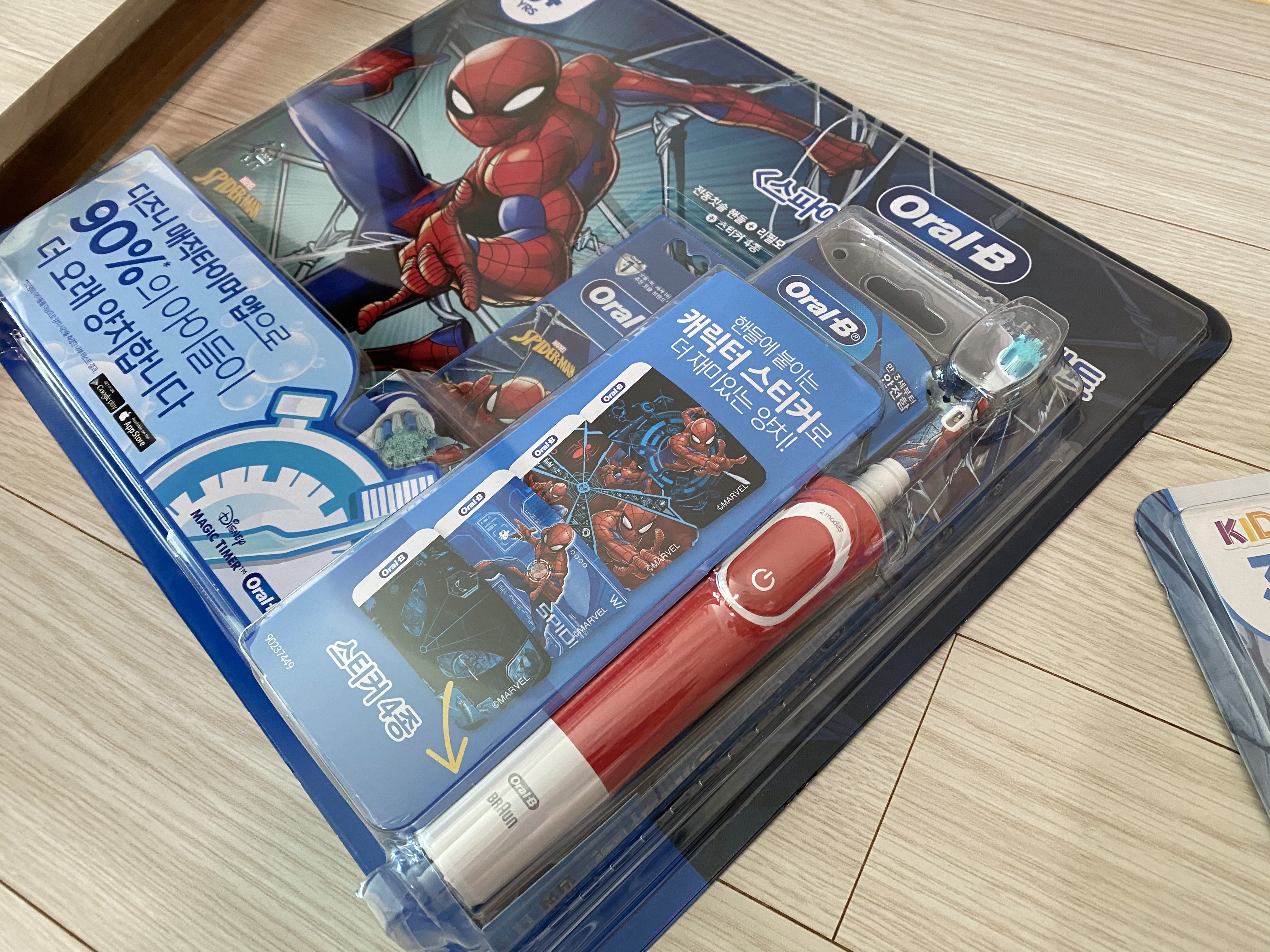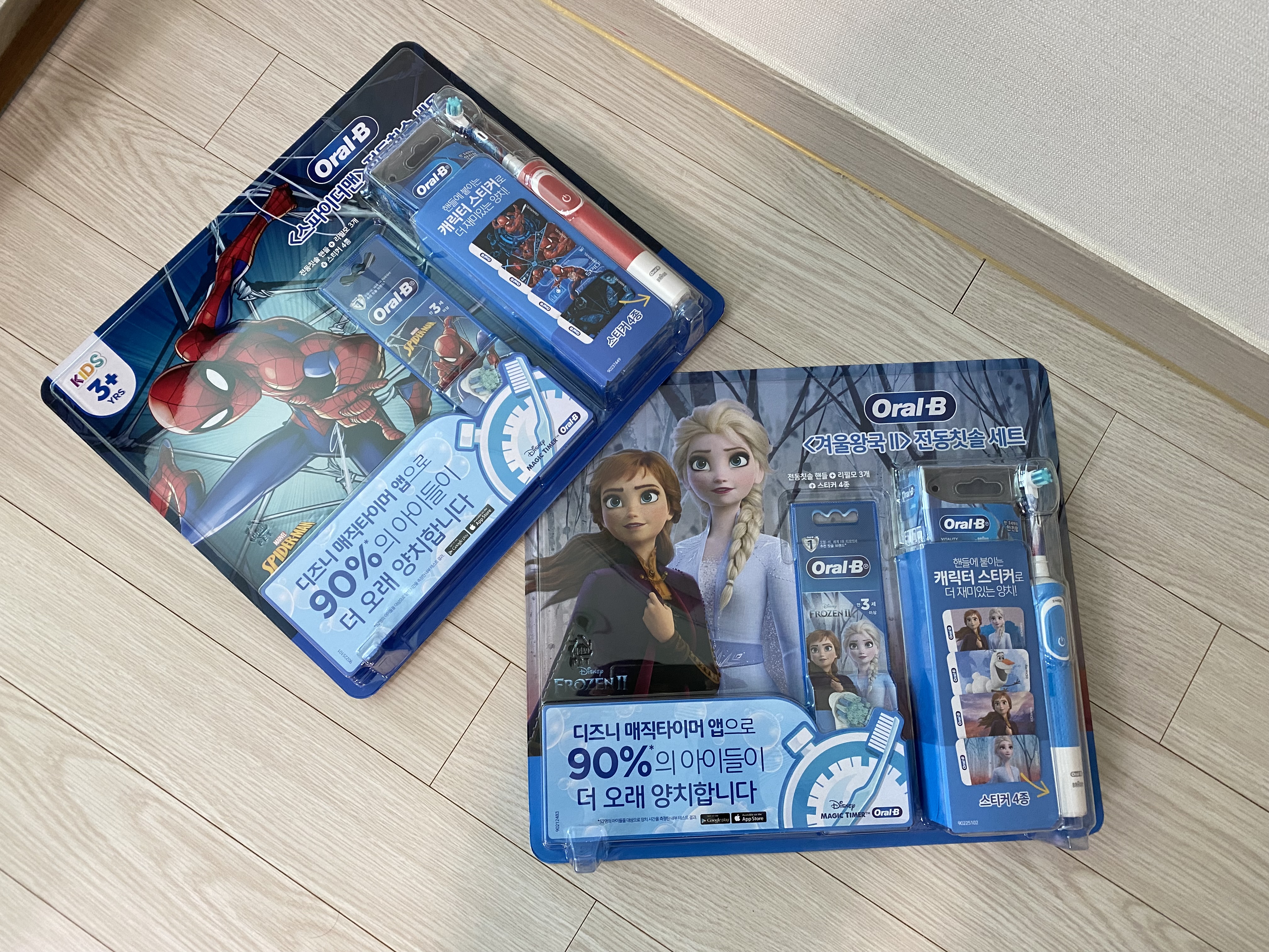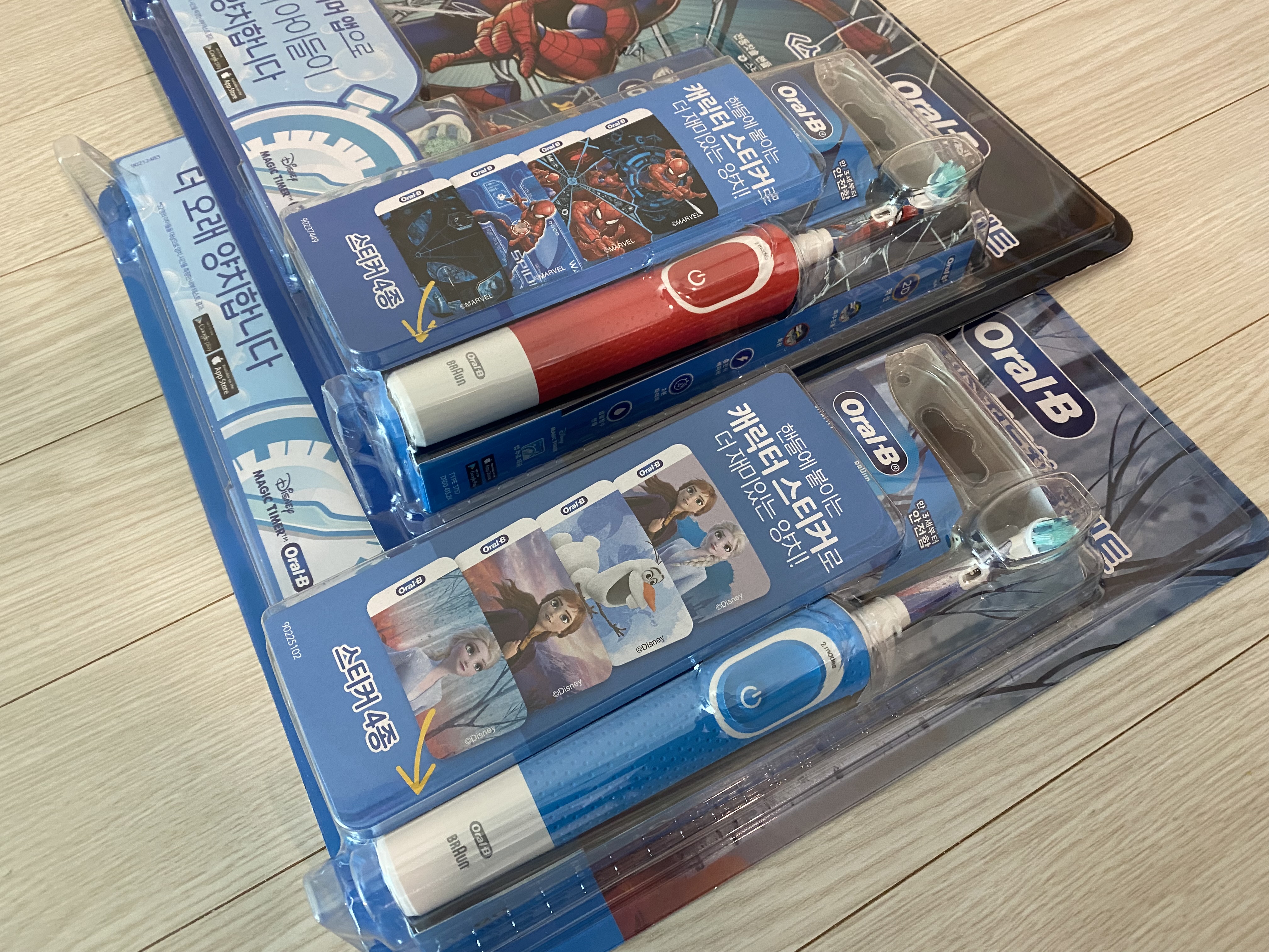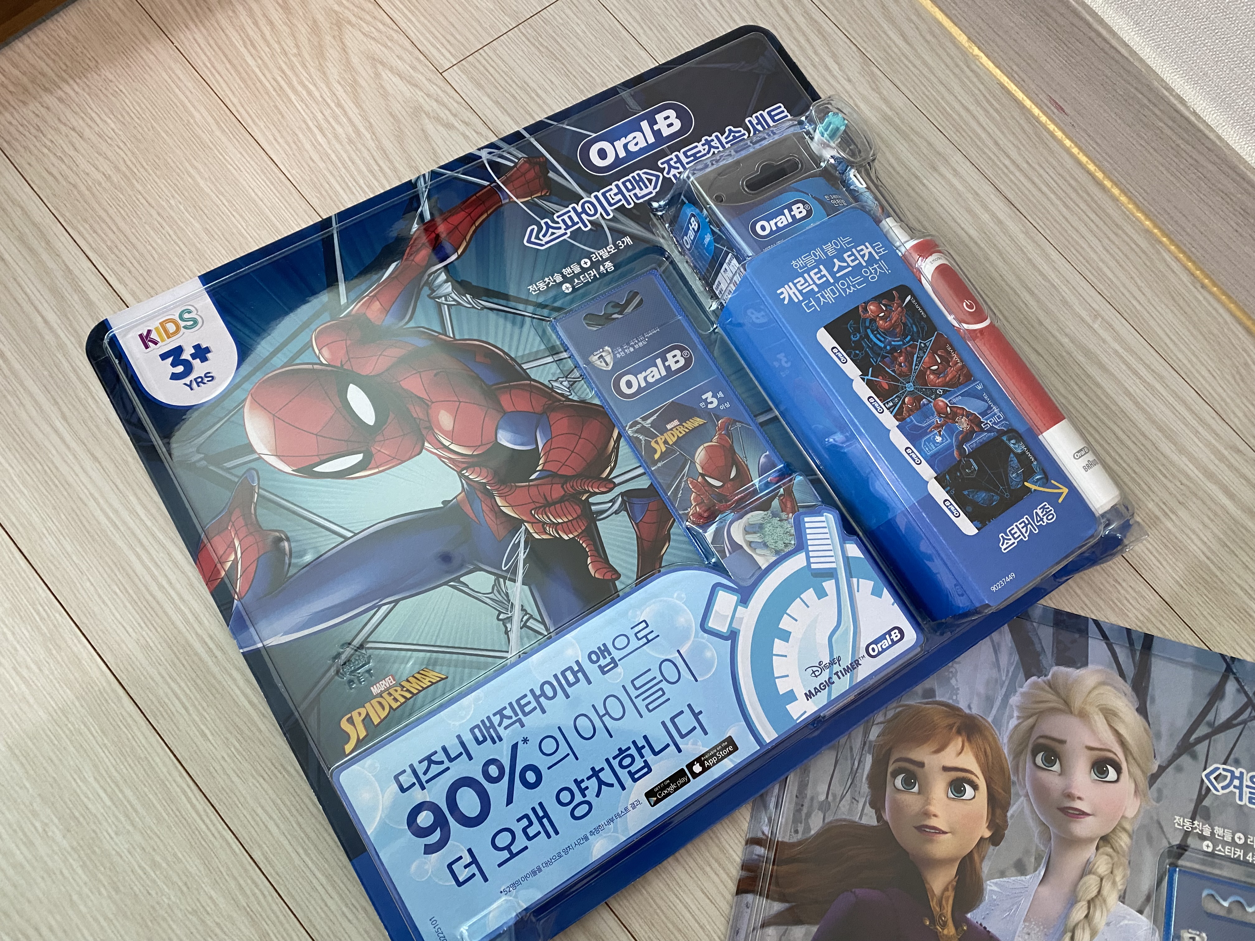 어린이용 스파이더맨, 겨울왕국 오랄비 전동칫솔 세트. 이건 예전에 구매한 어린이 전동칫솔 사진인데 그냥 이거 사지 말고 어른꺼 사서 쓰세요. 아이들도 비싸고 좋은 걸 아는지 자기 꺼 안 쓰고 제 오랄비 전동칫솔을 계속 사용합니다. 칫솔모는 어른, 어린이용 다 호환이 가능합니다. 전동칫솔을 집에 있는 사람 수대로 살 수 있지만 꼭 그럴 필요는 없습니다. 칫솔모만 갈아 끼는 구조라 5사람 기준으로 2~3개면 충분하다고 생각합니다.