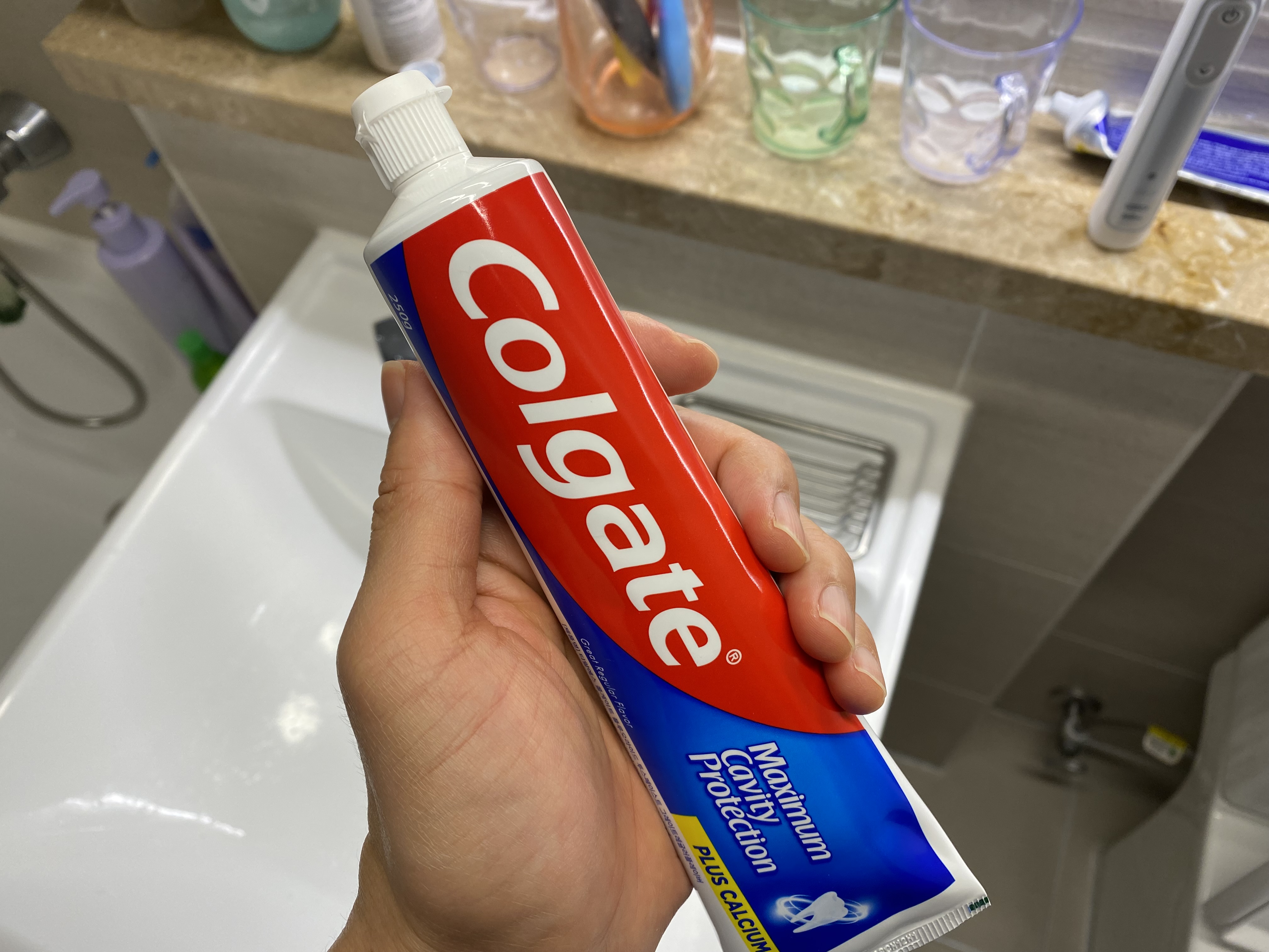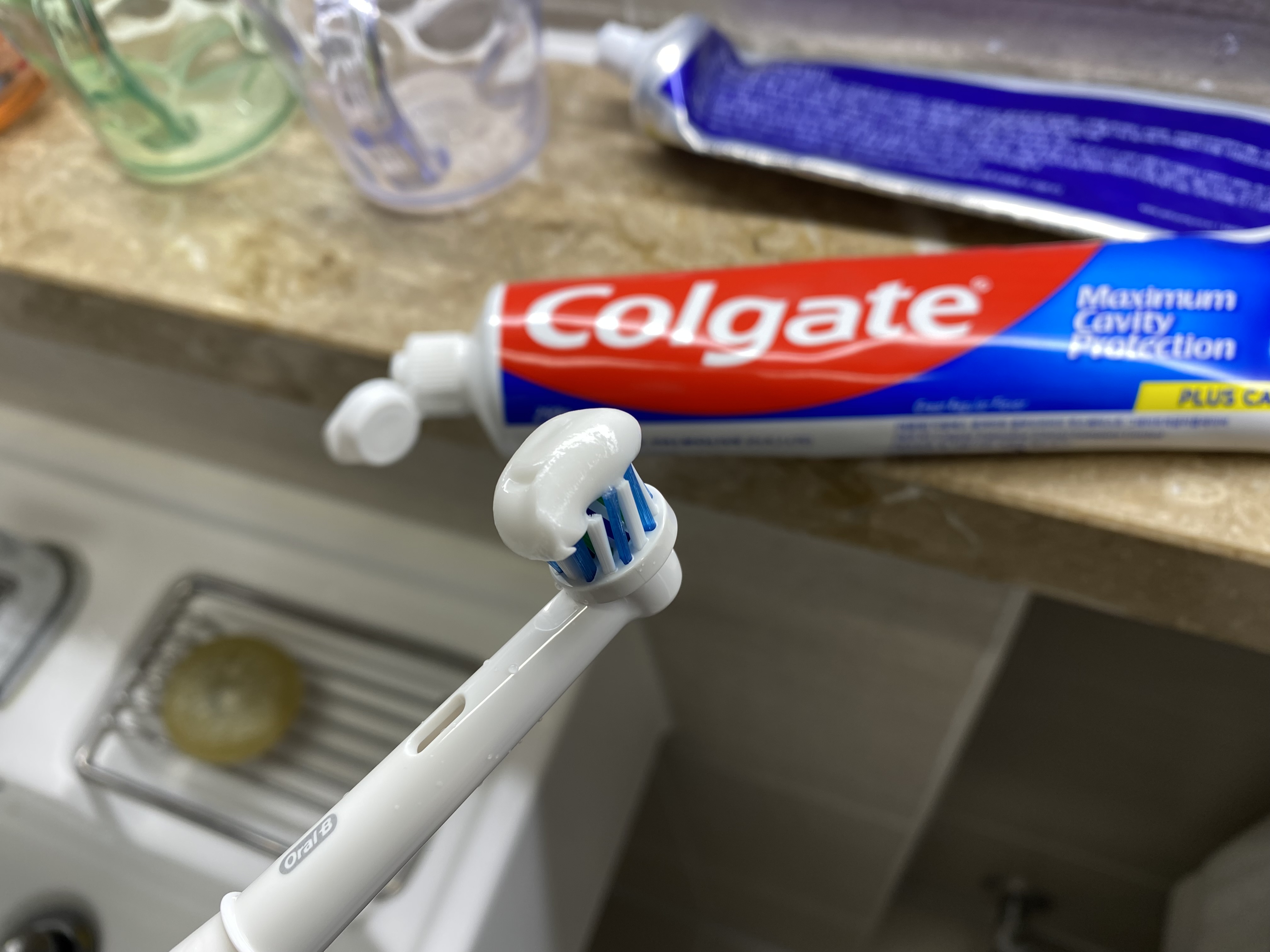 콜게이트 치약을 오랄비 전동칫솔에 짠 모습. 오랄비 콜게이트 조합 괜찮아요~