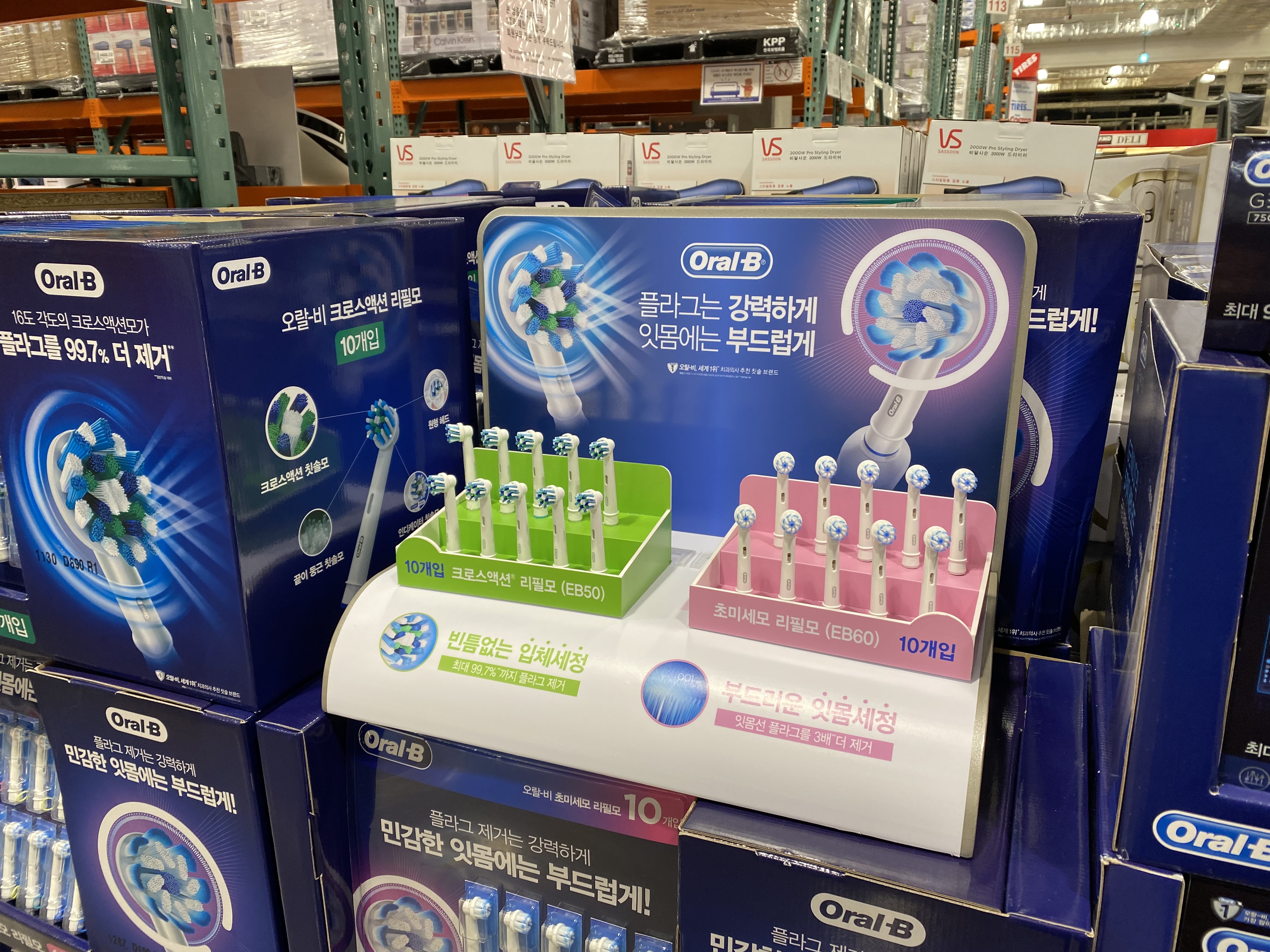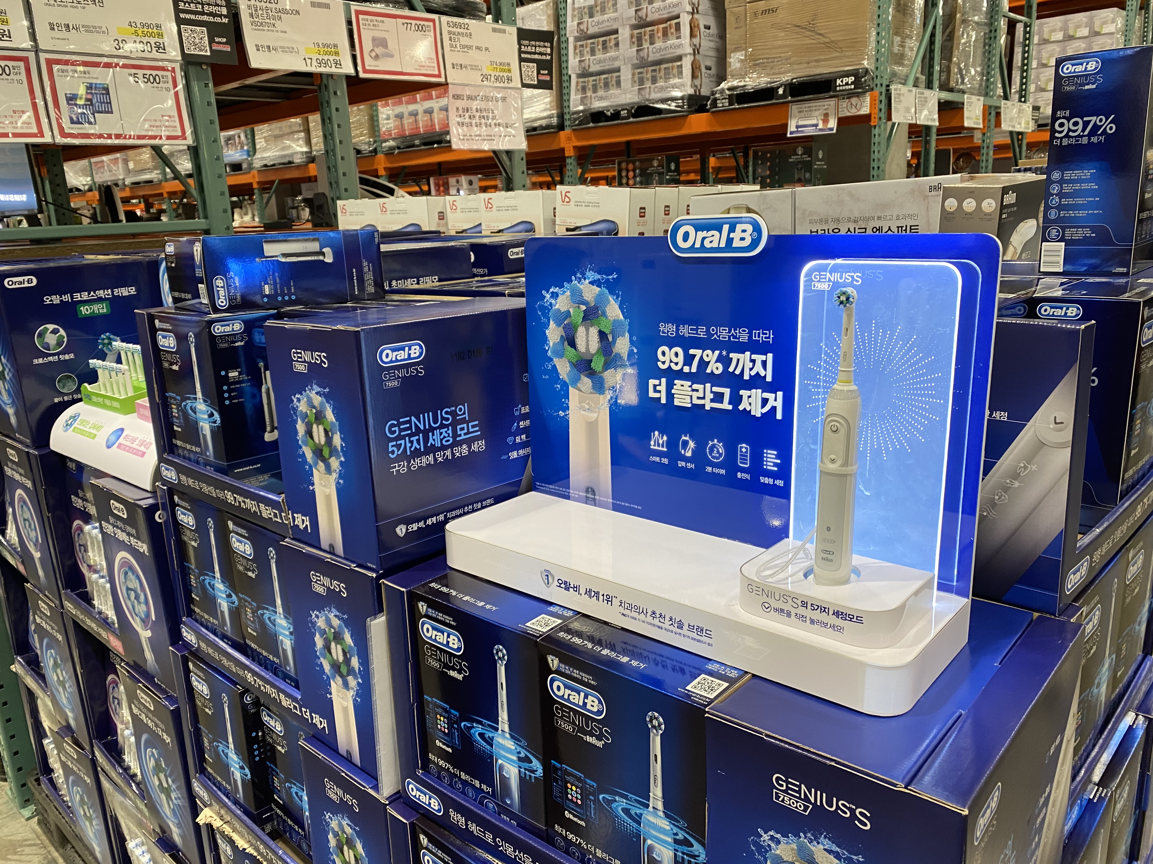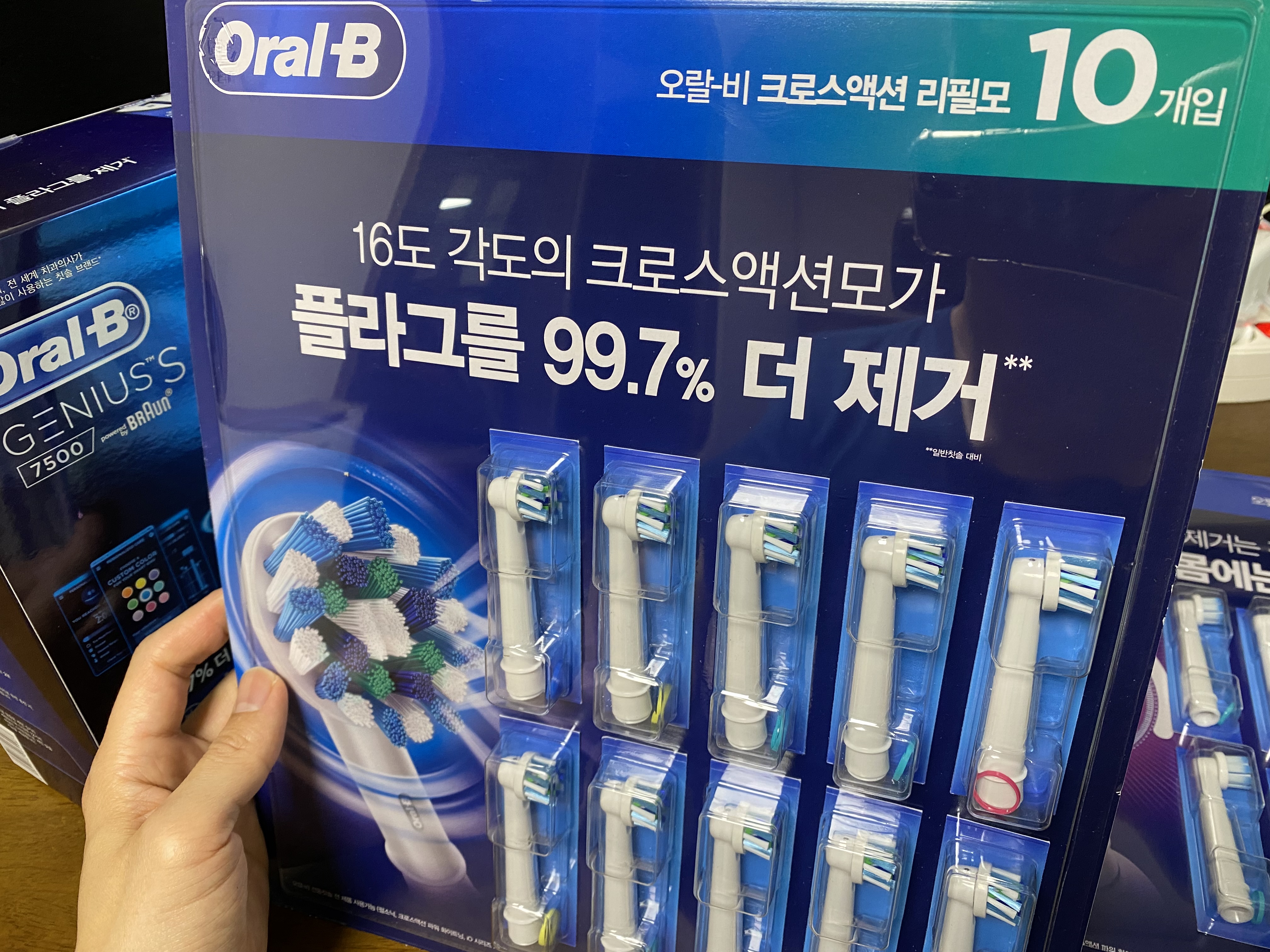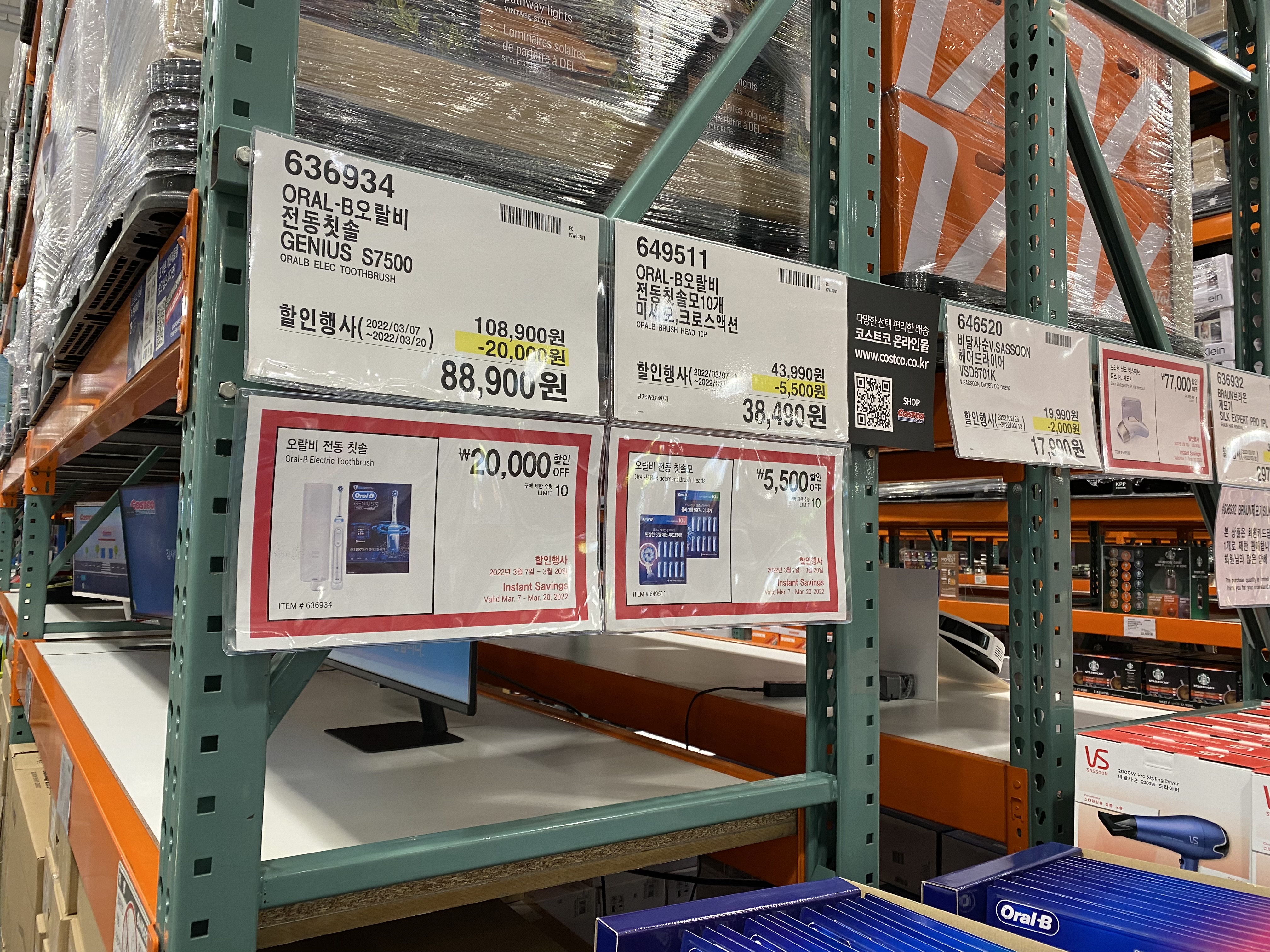코스트코를 돌다 자주 보게 되는 오랄비 전동칫솔. 살까 말까 한참을 고민한 제품인데 이날은 할인을 하길래 저도 모르게 그만 카트에 담았습니다. 'ORAL-B 오랄비 전동칫솔 GENIUS S7500'와 바로 옆에 할인하고 있는 '오랄비 전동 칫솔모 10개 미세모, 코로스액션'도 같이 샀습니다. 가격은 사진을 참고하세요.