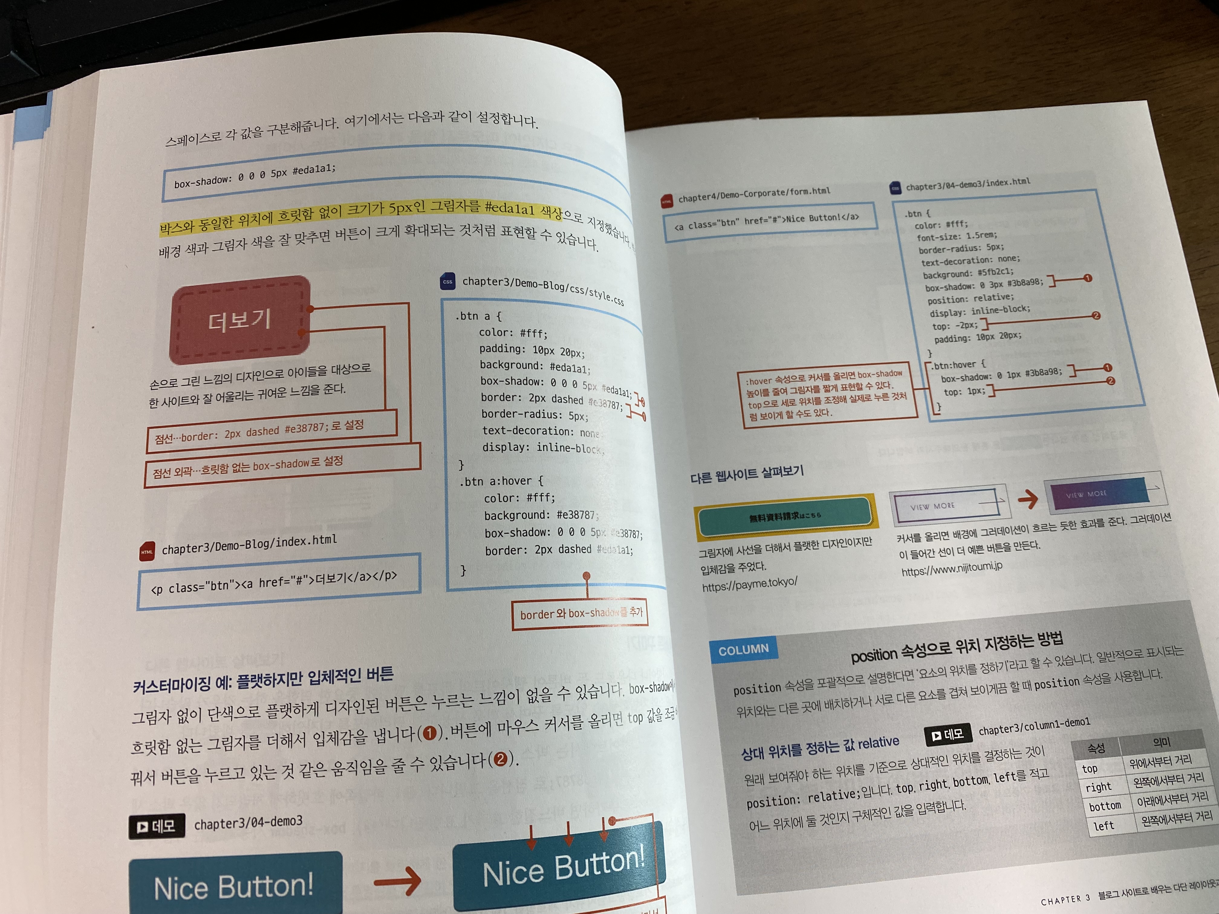 이 책은 HTML, CSS의 기초를 아주 간략하게 설명하고 바로 웹사이트에서 이러한 요소들이 어떻게 사용되는지 확인합니다. HTML, CSS 기초를 공부했는데 어떻게 써야 하는지 잘 모르겠거나 자주 사용하는 필수 기능을 구현하는 노하우가 궁금한 사람에게 어울리는 책입니다. 이 책을 꼼꼼하게 읽어보면 웹사이트를 만들 때 자주 사용하는 거의 모든 기능을 자세하게 배울 수 있습니다. 개인적으로 인상적인 부분은 아래와 같습니다.
