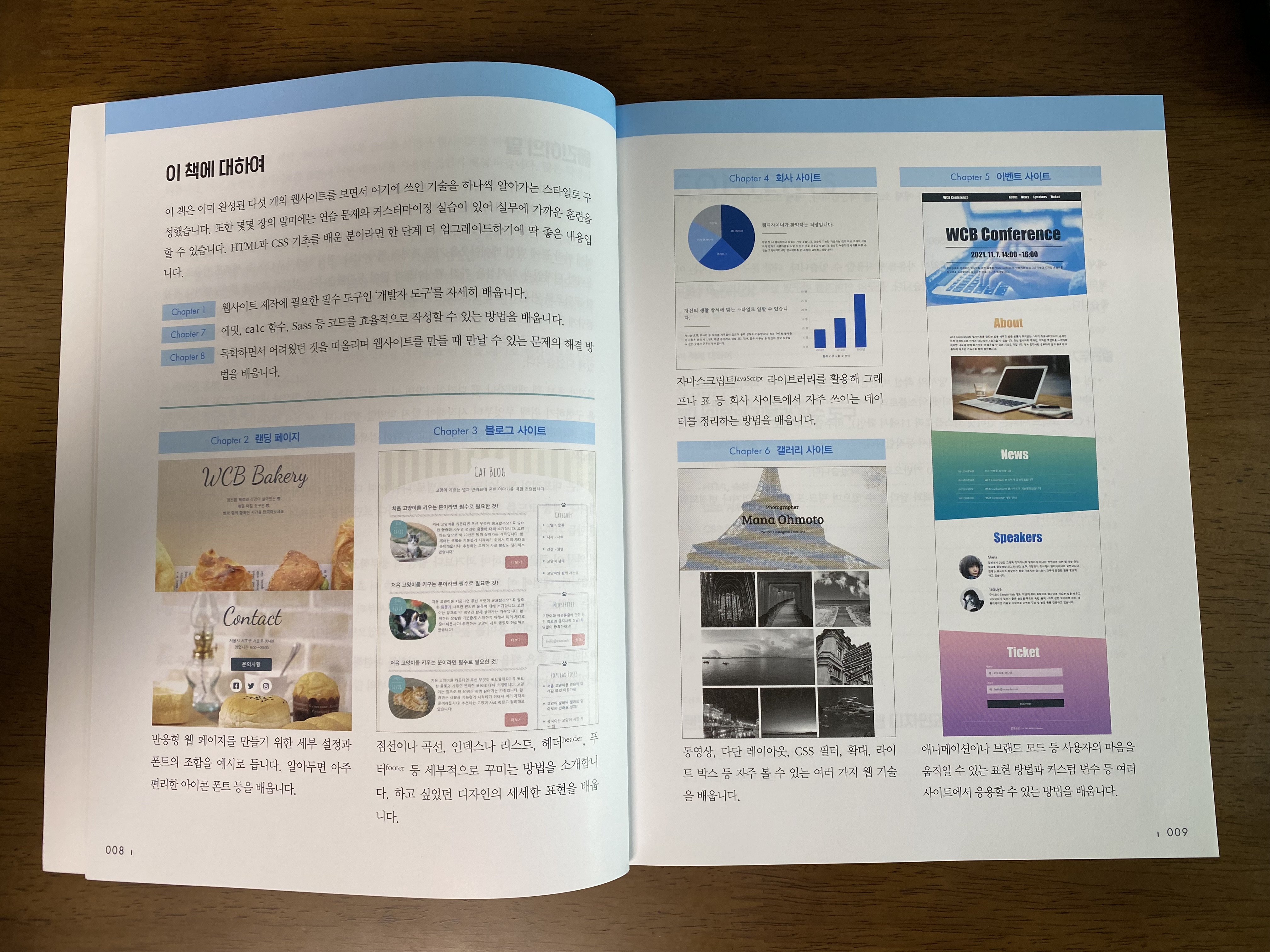 이 책은 제목대로 이미 완성된 웹사이트의 코드를 분석하면서 공부를 하는 책입니다. 인터넷에서 자주 만날 수 있는 5가지 스타일의 웹사이트를 집중 분석합니다. 랜딩 페이지, 블로그, 회사 사이트, 이벤트 사이트, 갤러리 사이트가 그것입니다. 이 책을 구매하기 전 나에게 필요한 책인지는 목차만 봐도 알 수 있습니다.