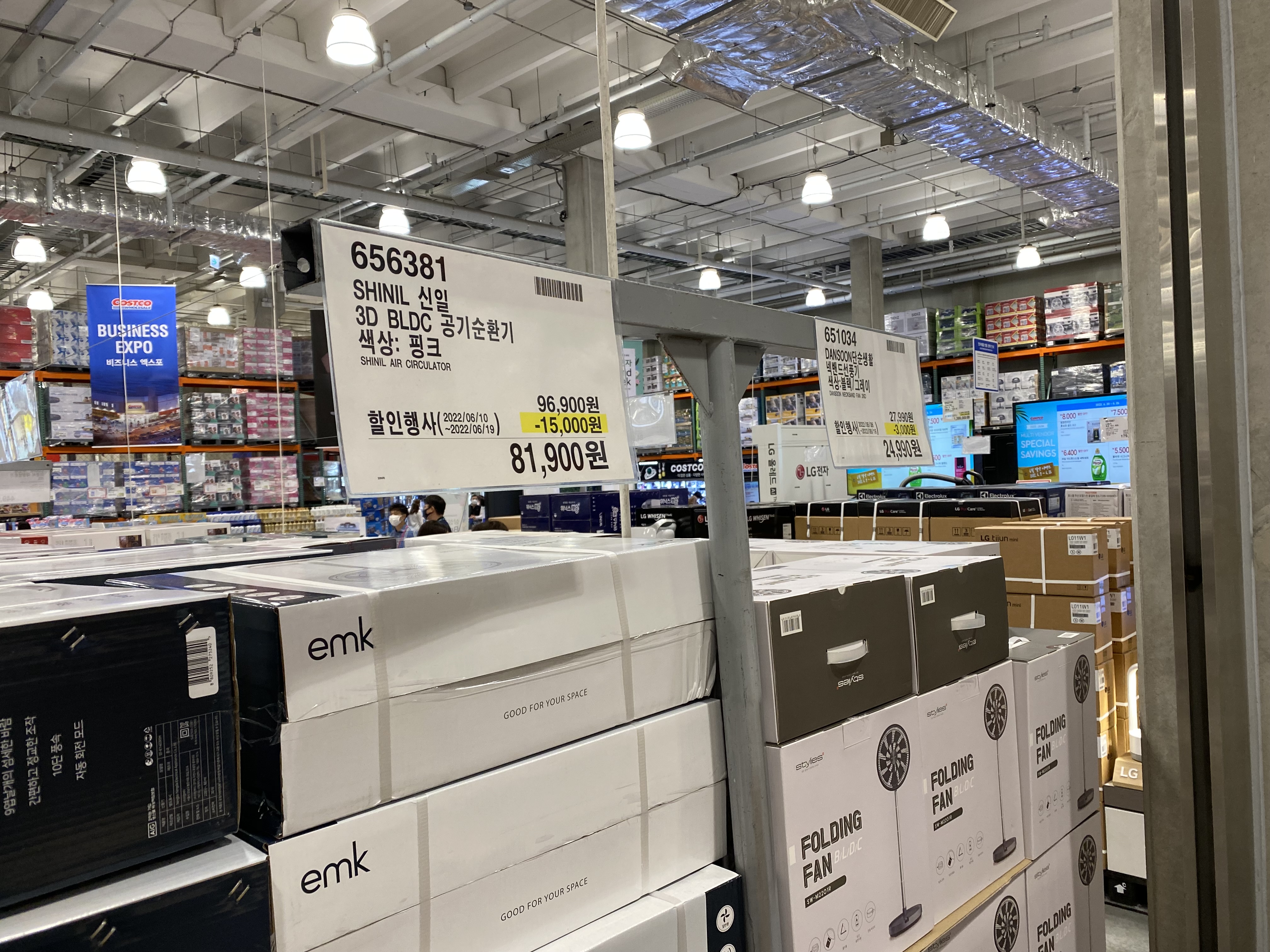 코스트코에 적힌 정확한 제품명은 'SHINIL 신일 3D BLDC 공기순환기'입니다. 운이 좋게도 할인할 때 제품을 구매할 수 있었습니다. 옆에 다른 선풍기도 할인을 하고 있네요. 코스트코 매장에 가보고 결정하세요. 참고로 BLDC란 모터의 종류를 말합니다. 이렇게 제품명에 들어가는 걸 봐서는 기존 방식보다 좋은 방식이겠지요?!