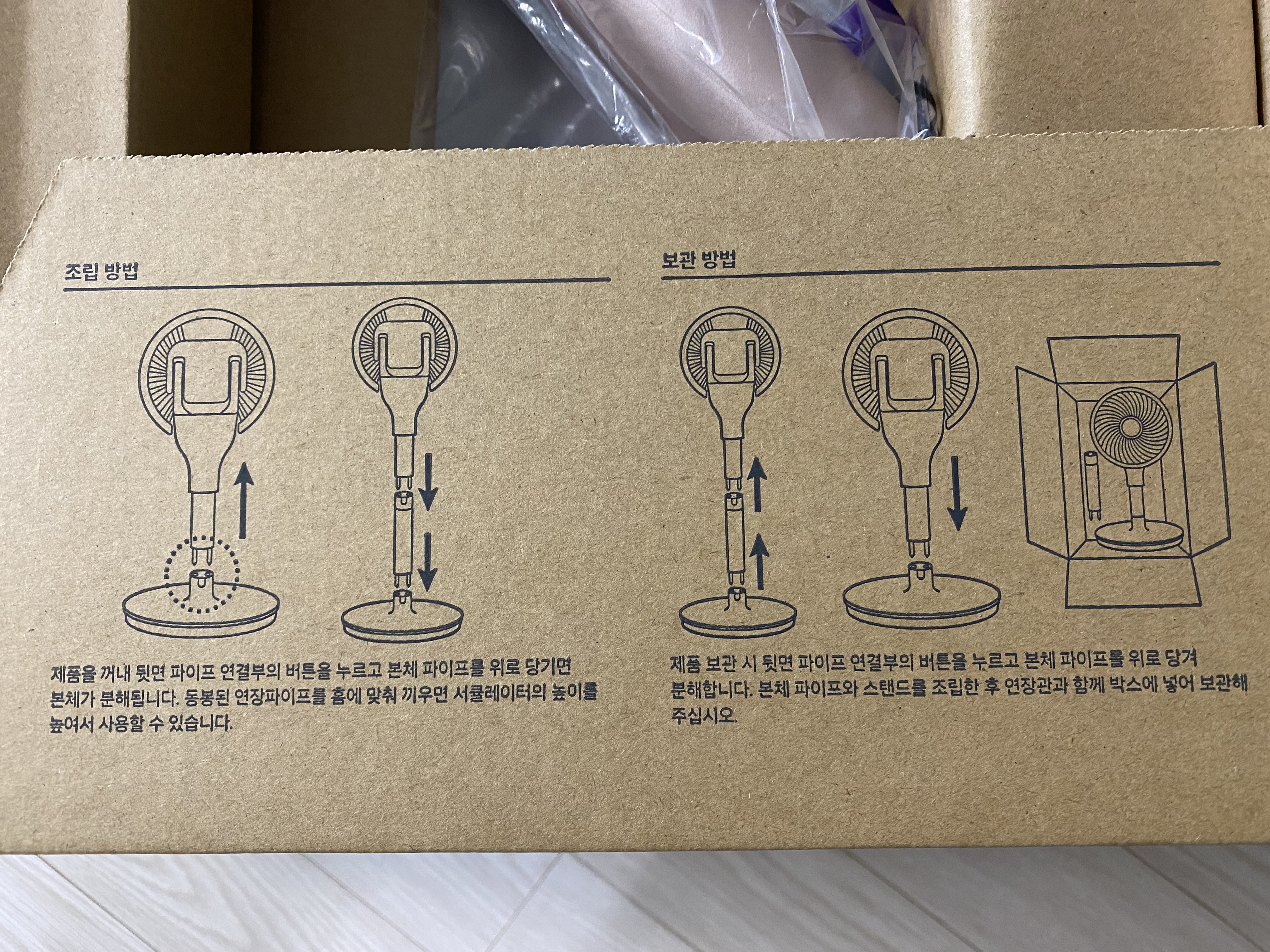 박스에 조립 방법, 보관 방법이 적혀있습니다. 제품 박스를 선풍기 보관함으로 사용할 수 있네요. 선풍기를 다 쓰고 보관할 때 항상 고민이었는데 이 제품은 그냥 박스에 보관하면 될 것 같습니다.