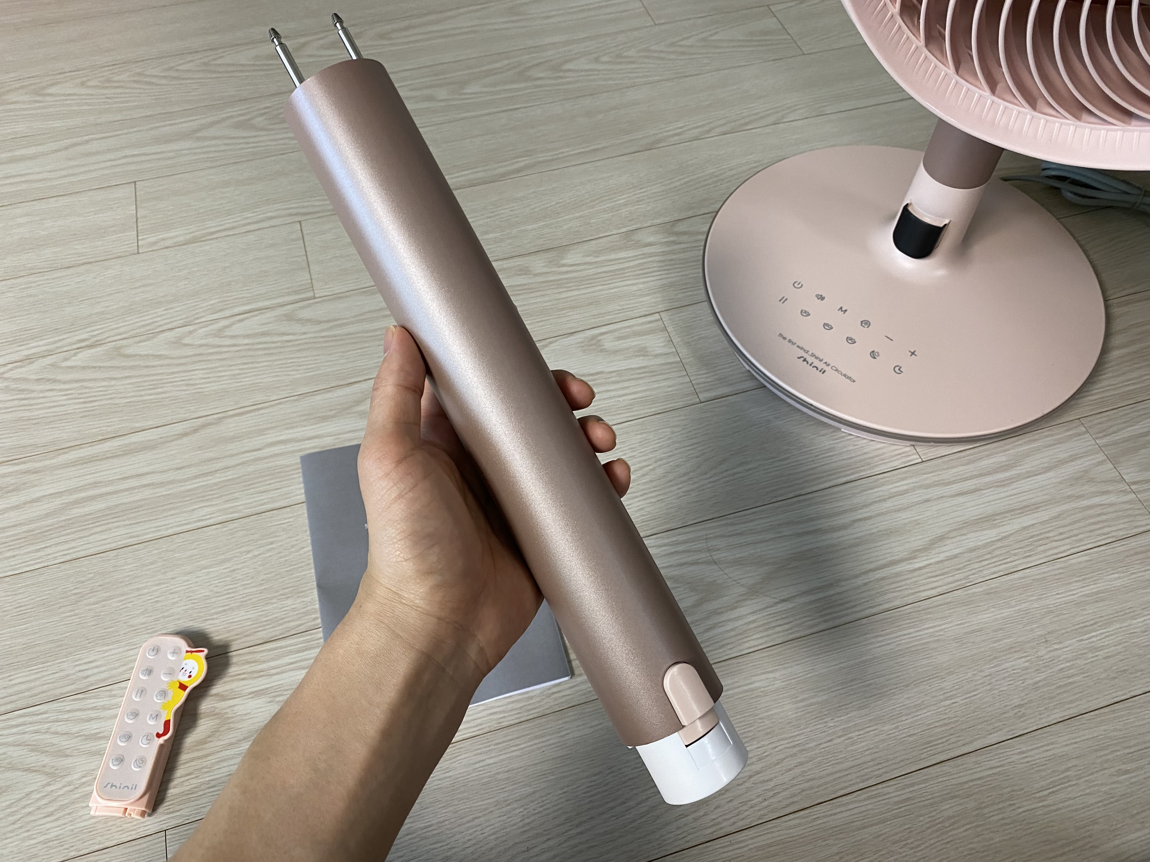 연장 파이프로 선풍기 목을 늘인 모습. 이렇게 딱 2가지 길이로만 사용할 수 있습니다. 이 제품은 다 마음에 드는데 목이 약간 불안합니다. 여기저기 옮겨가며 쓰기에는 어울리지 않을 듯. 아이들이 막 만질 때면 긴장되네요. 거실에 가만히 놔두고 쓰기에는 문제가 없을 것 같습니다.