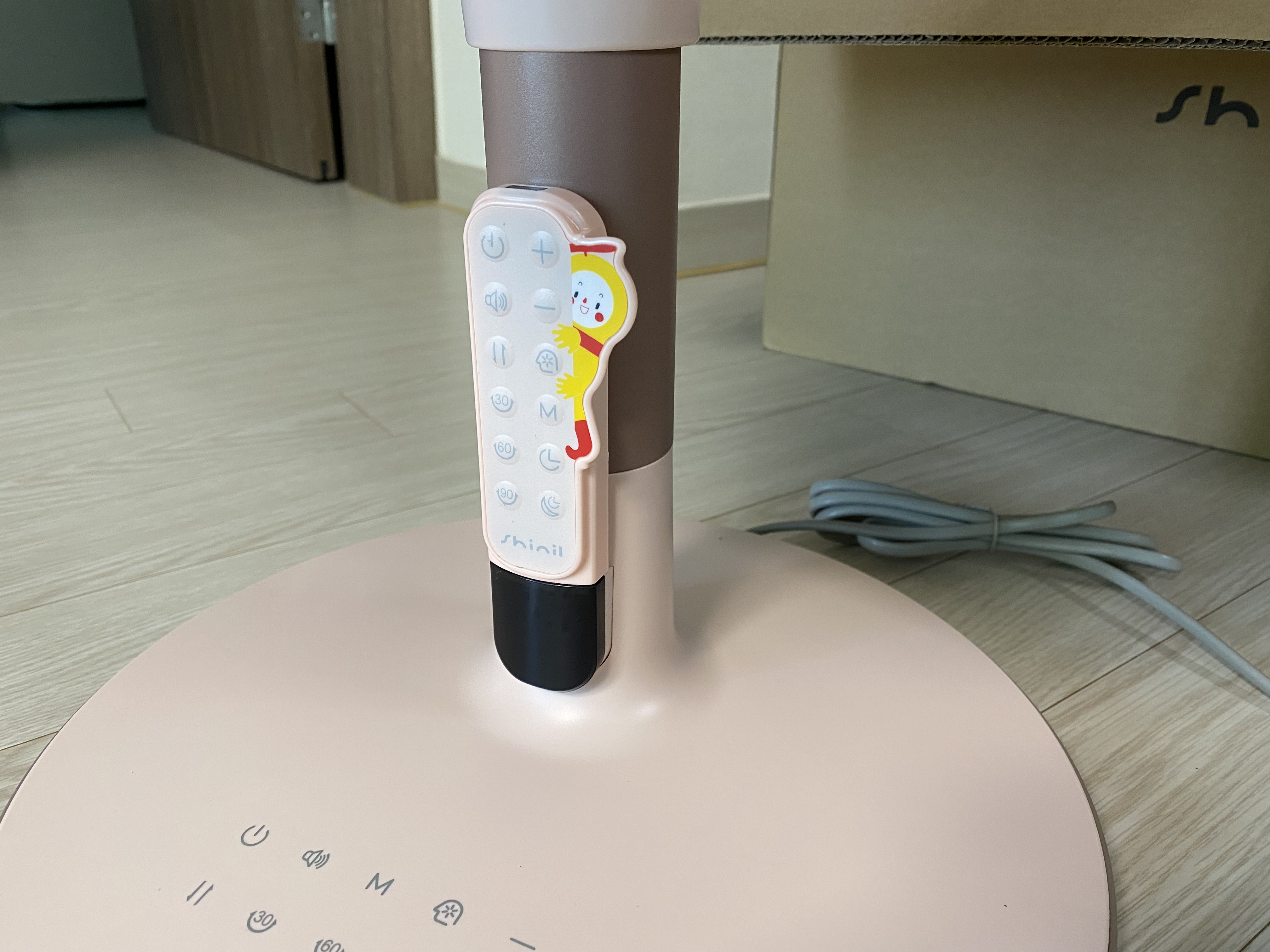 선풍기 파이프 하단에 리모컨을 거치할 수 있습니다. 자석으로 되어 있어서 기둥에 착 달라붙습니다.